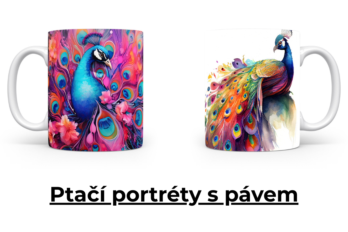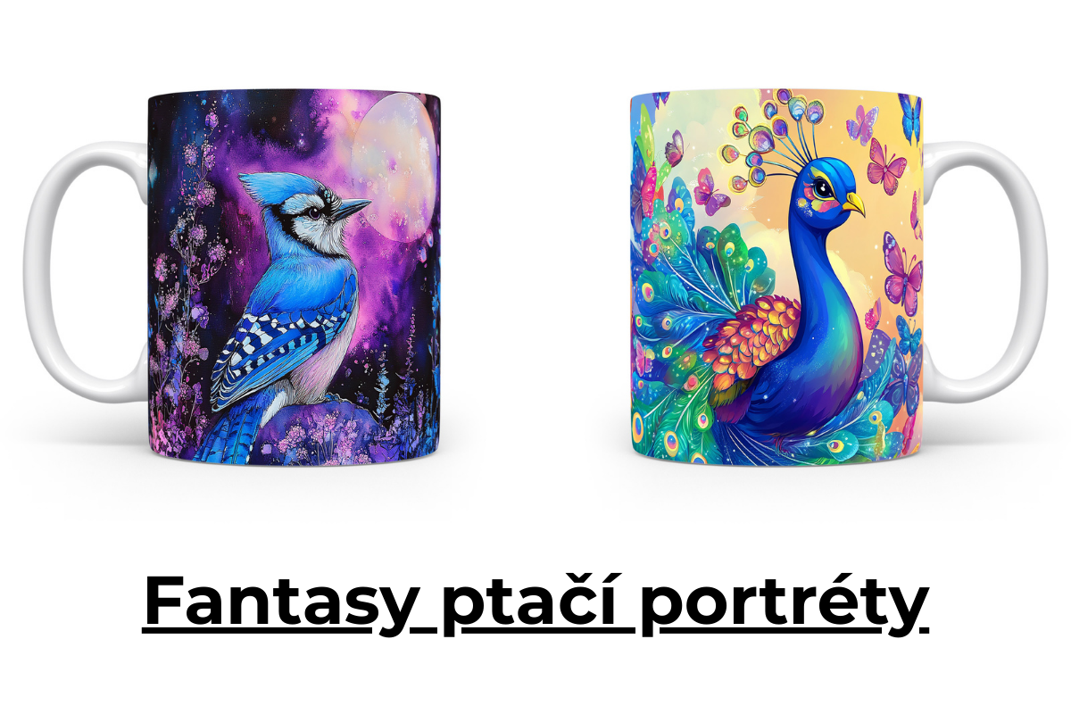 Hrnek s barevným ptáčkem a motýly v růžových tónech