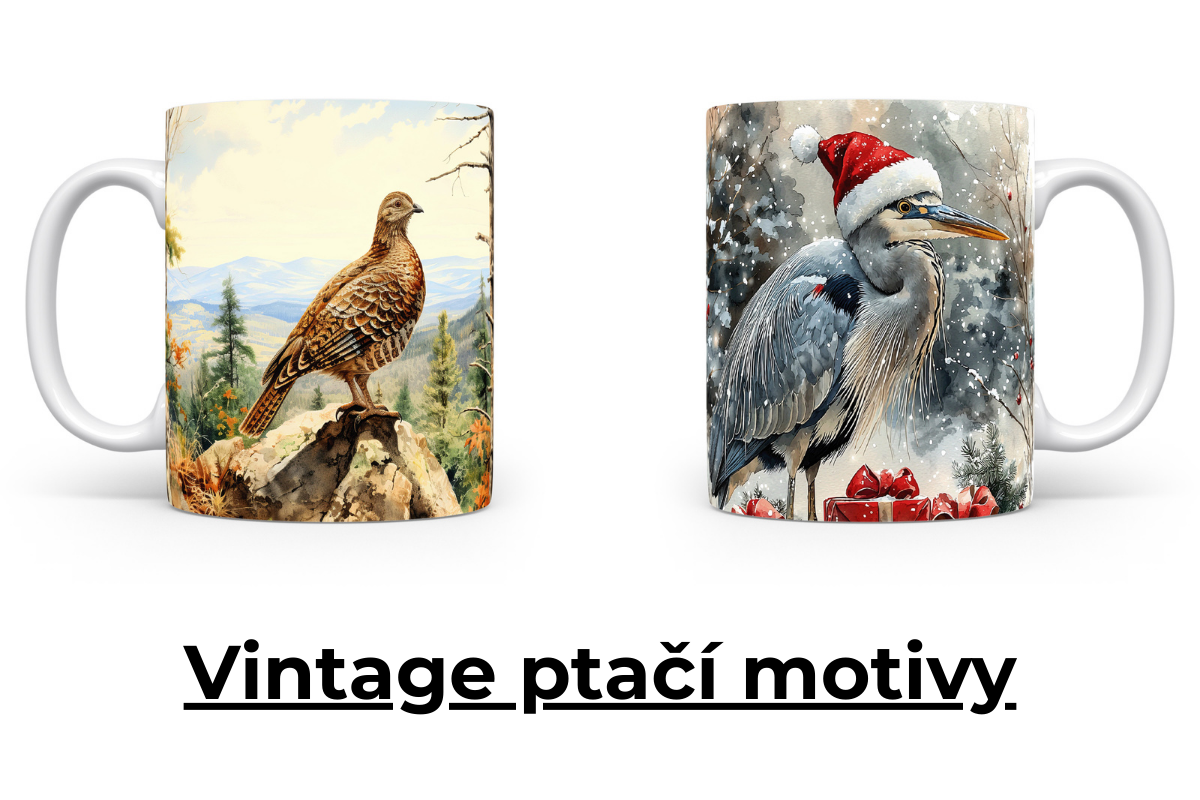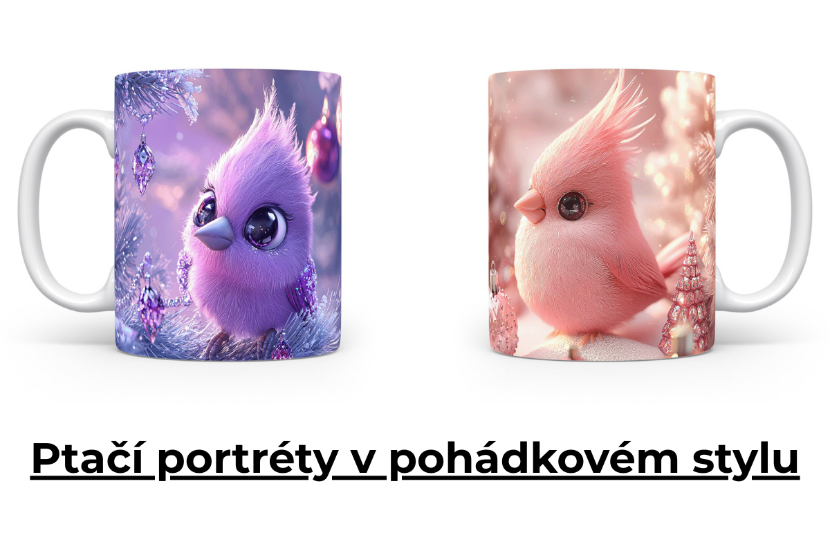 Hrnek s veselým ptáčkem v vánočním klobouku