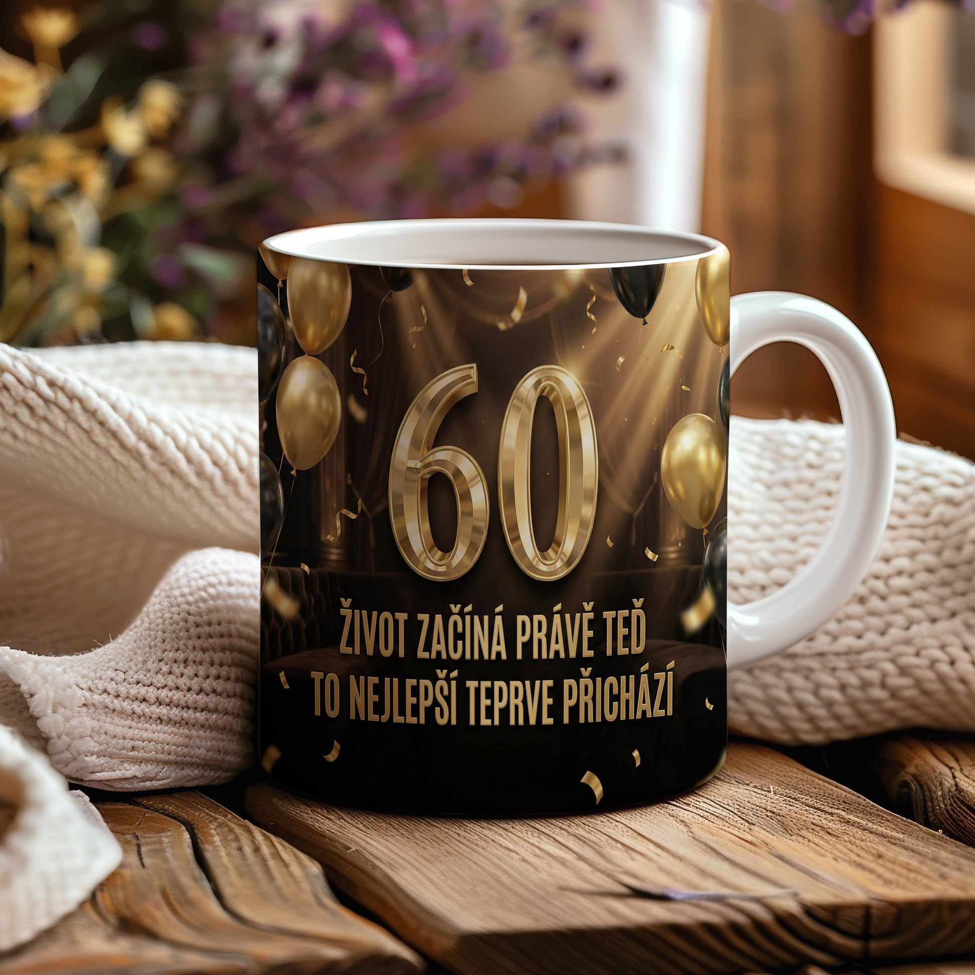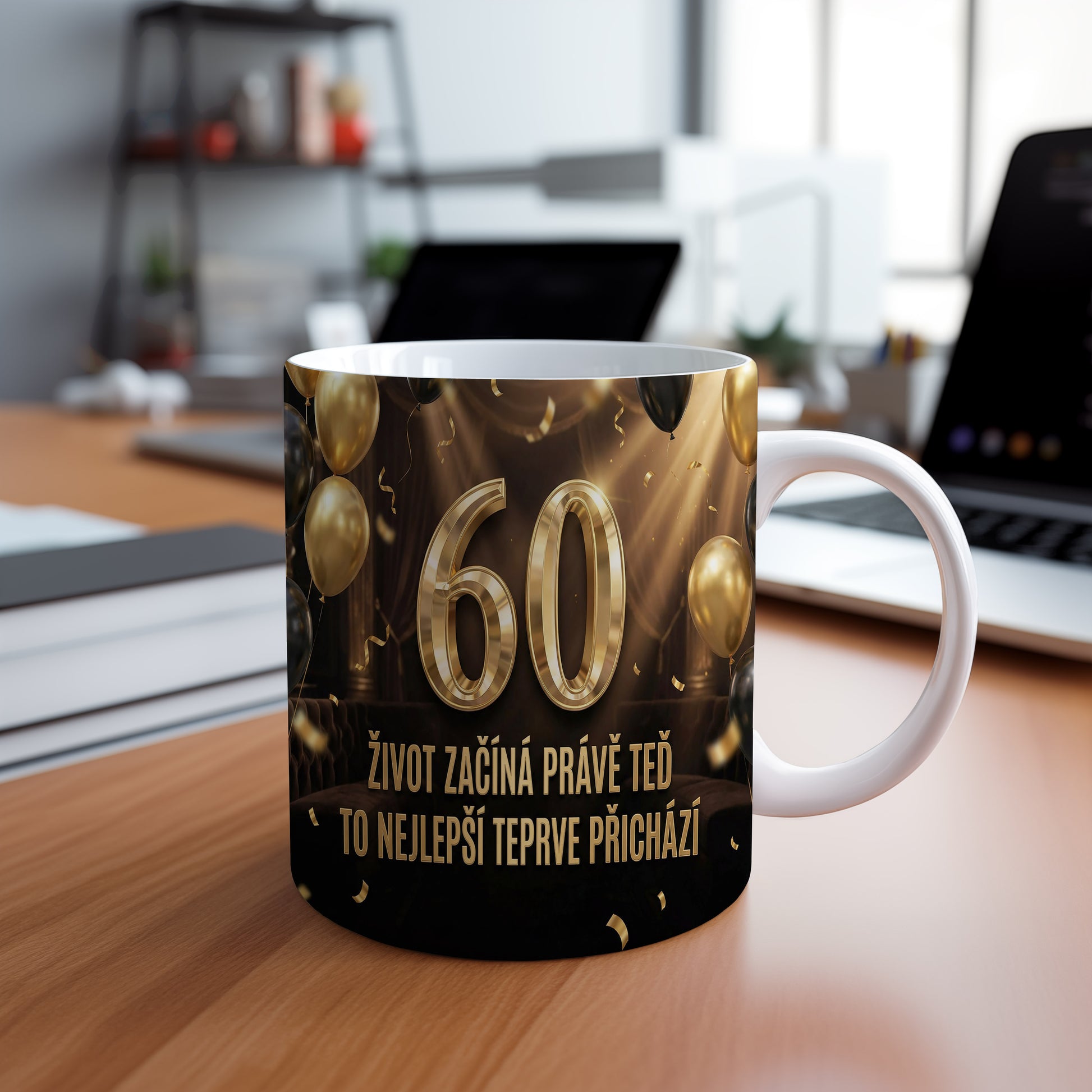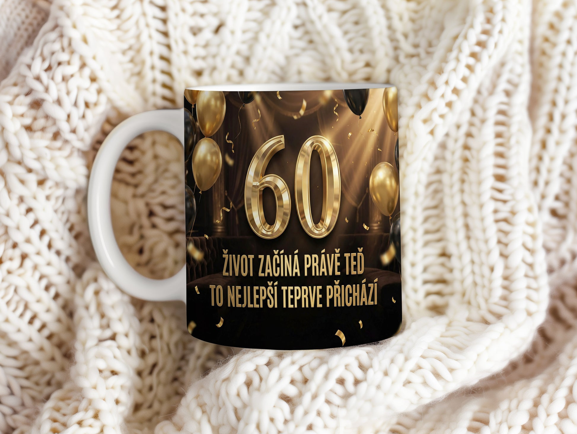 Narozeninový hrnek 60 let – ŽIVOT ZAČÍNÁ PRÁVĚ TEĎ TO NEJLEPŠÍ TEPRVE PŘICHÁZÍ