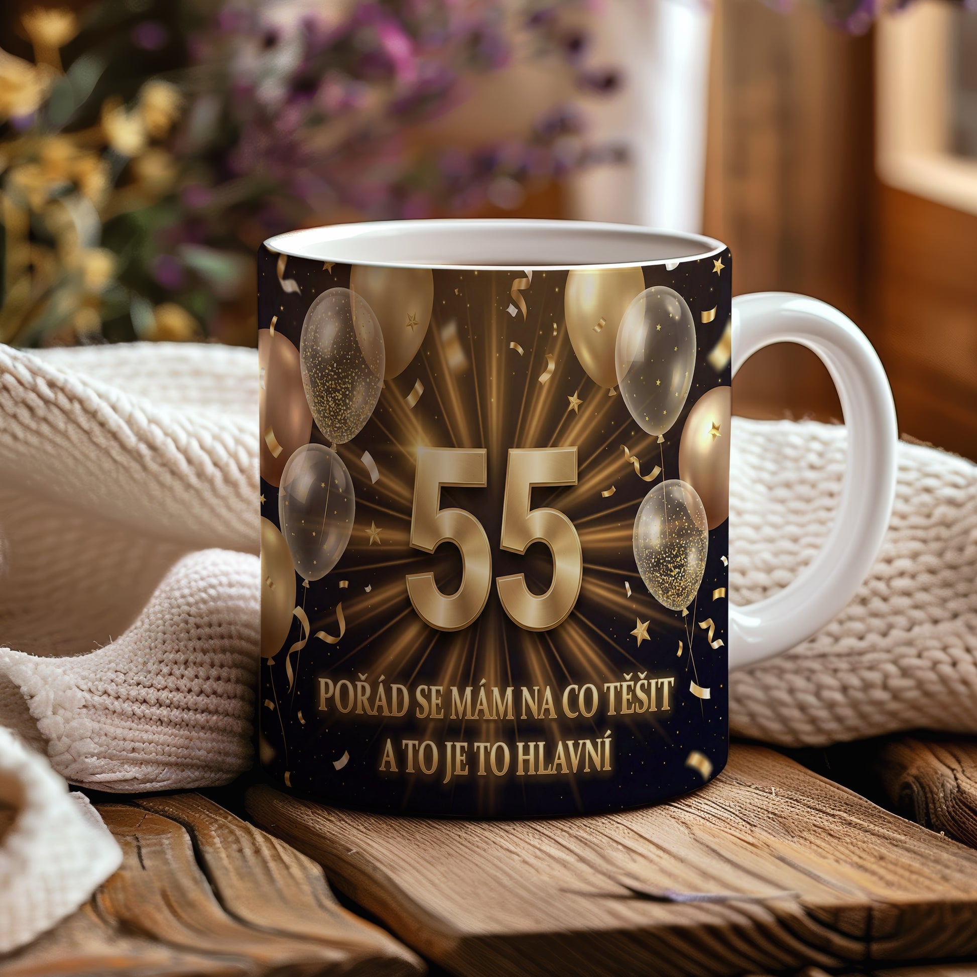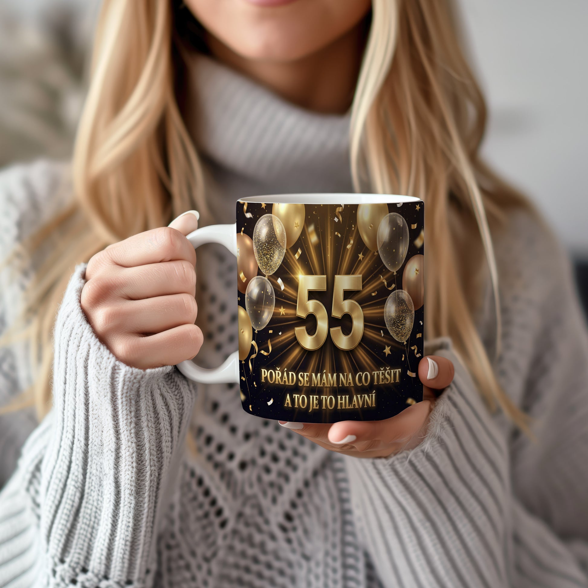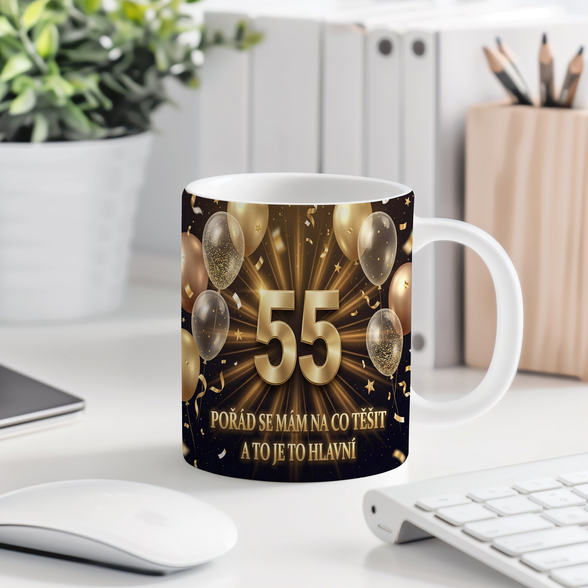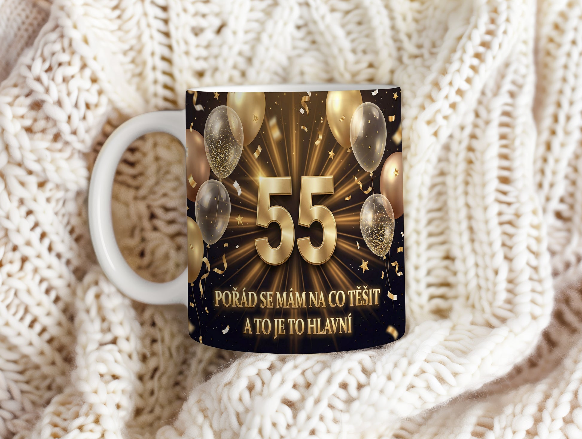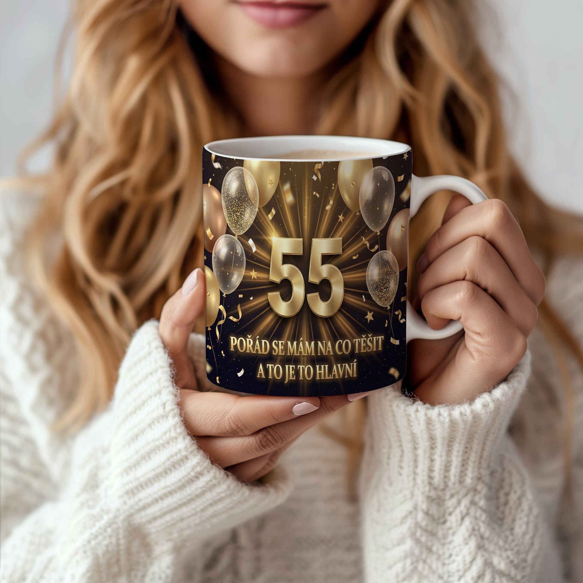 Narozeninový hrnek 55 let – POŘÁD SE MÁM NA CO TĚŠIT A TO JE TO HLAVNÍ