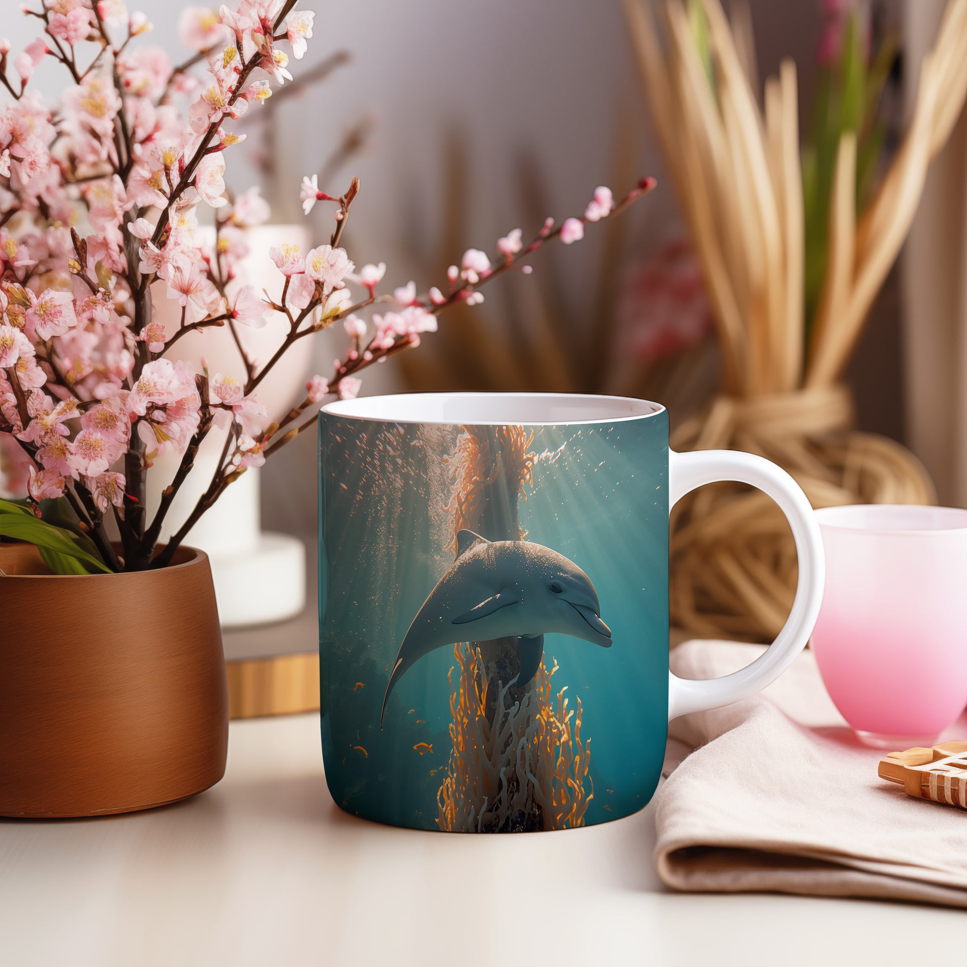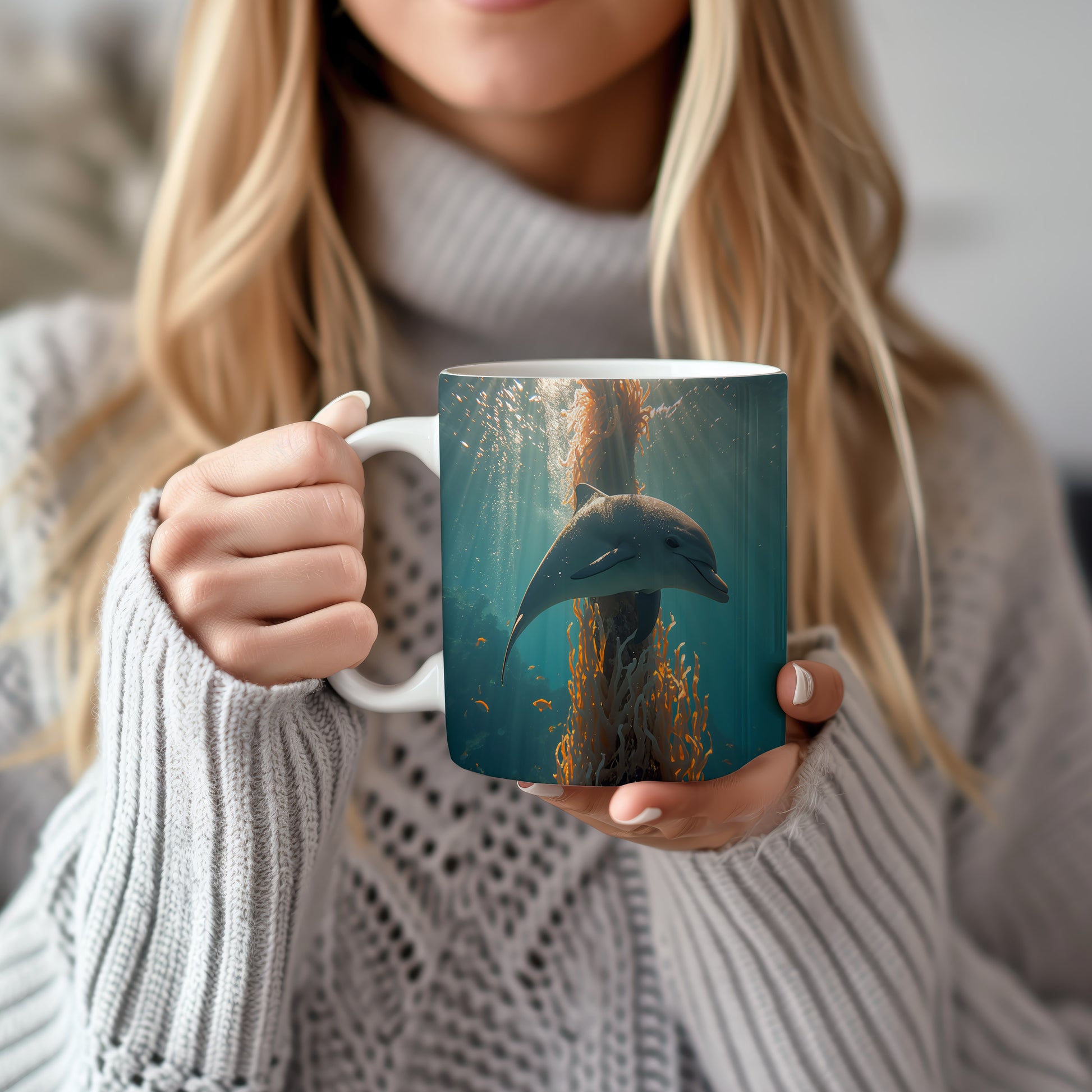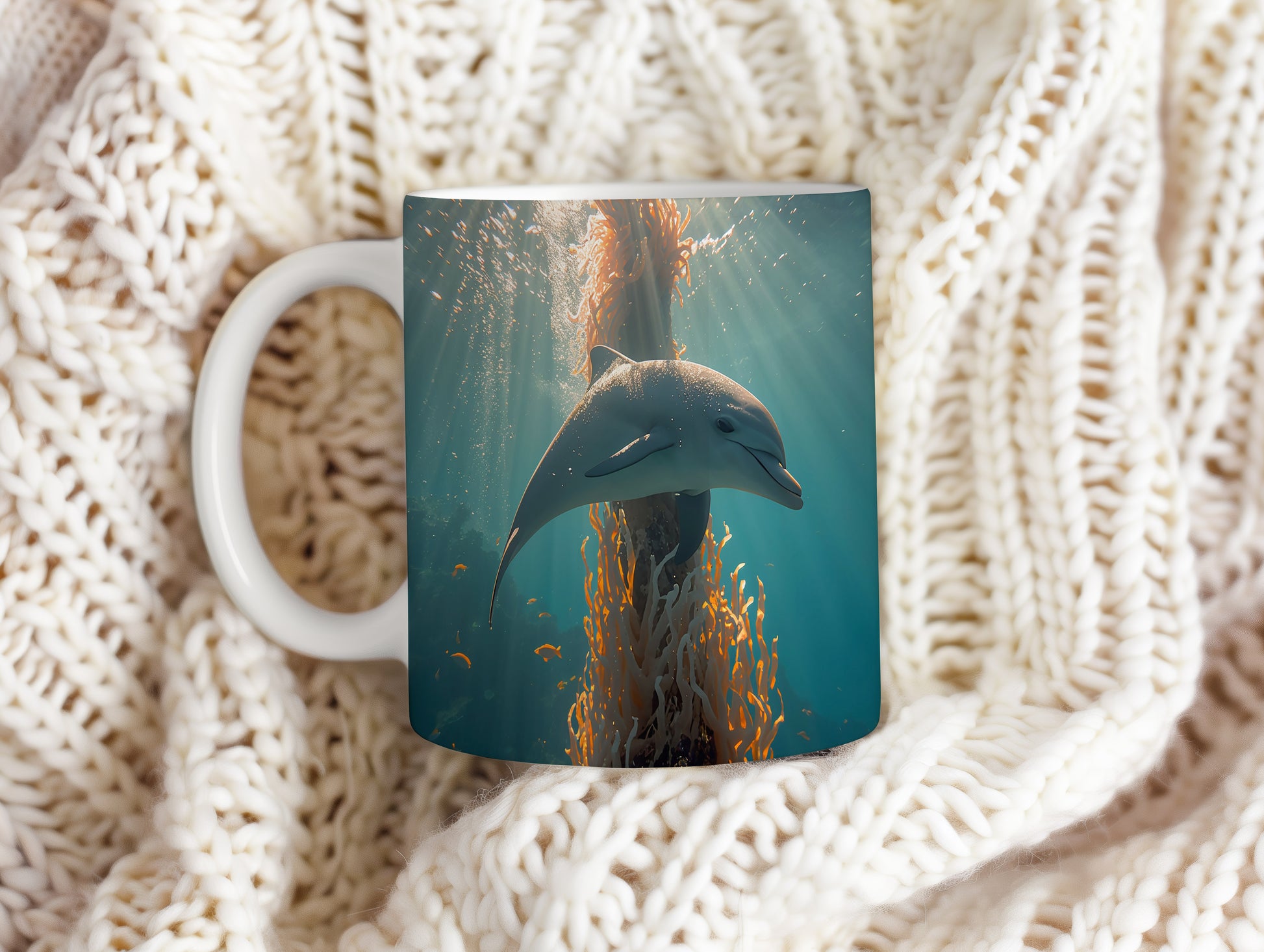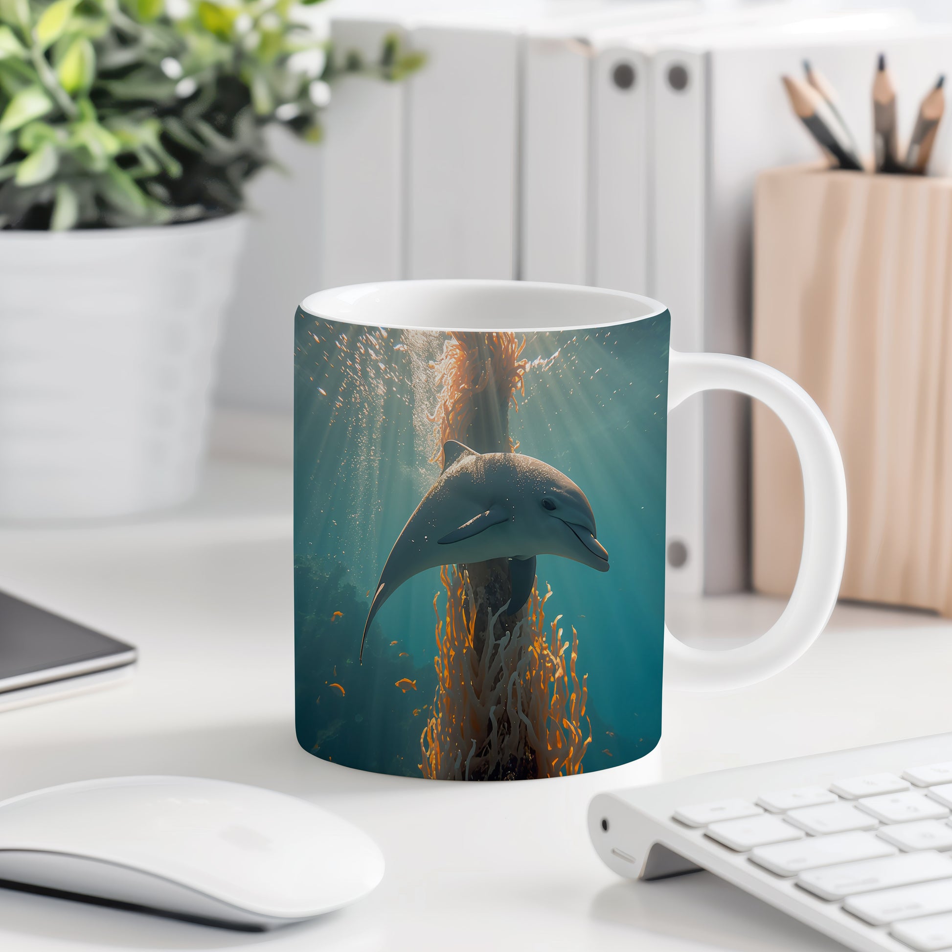 Delfín tančí mezi korály, zatímco sluneční paprsky vytvářejí magickou atmosféru. Hrnek 330ml – vhodný do myčky i mikrovlnky.