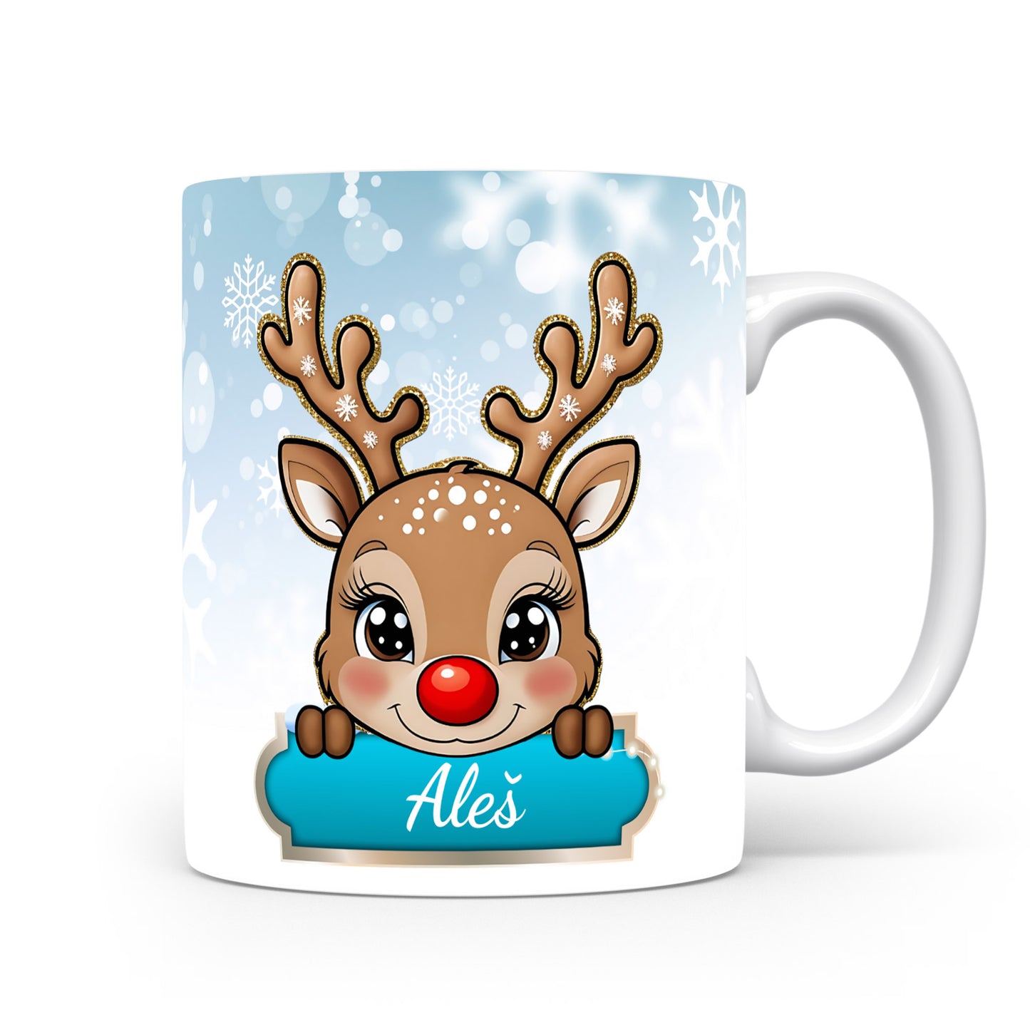 Veselý dětský hrnek se jménem Aleš s roztomilým sobem a zimními motivy. Skvělý osobní hrníček pro kluky.