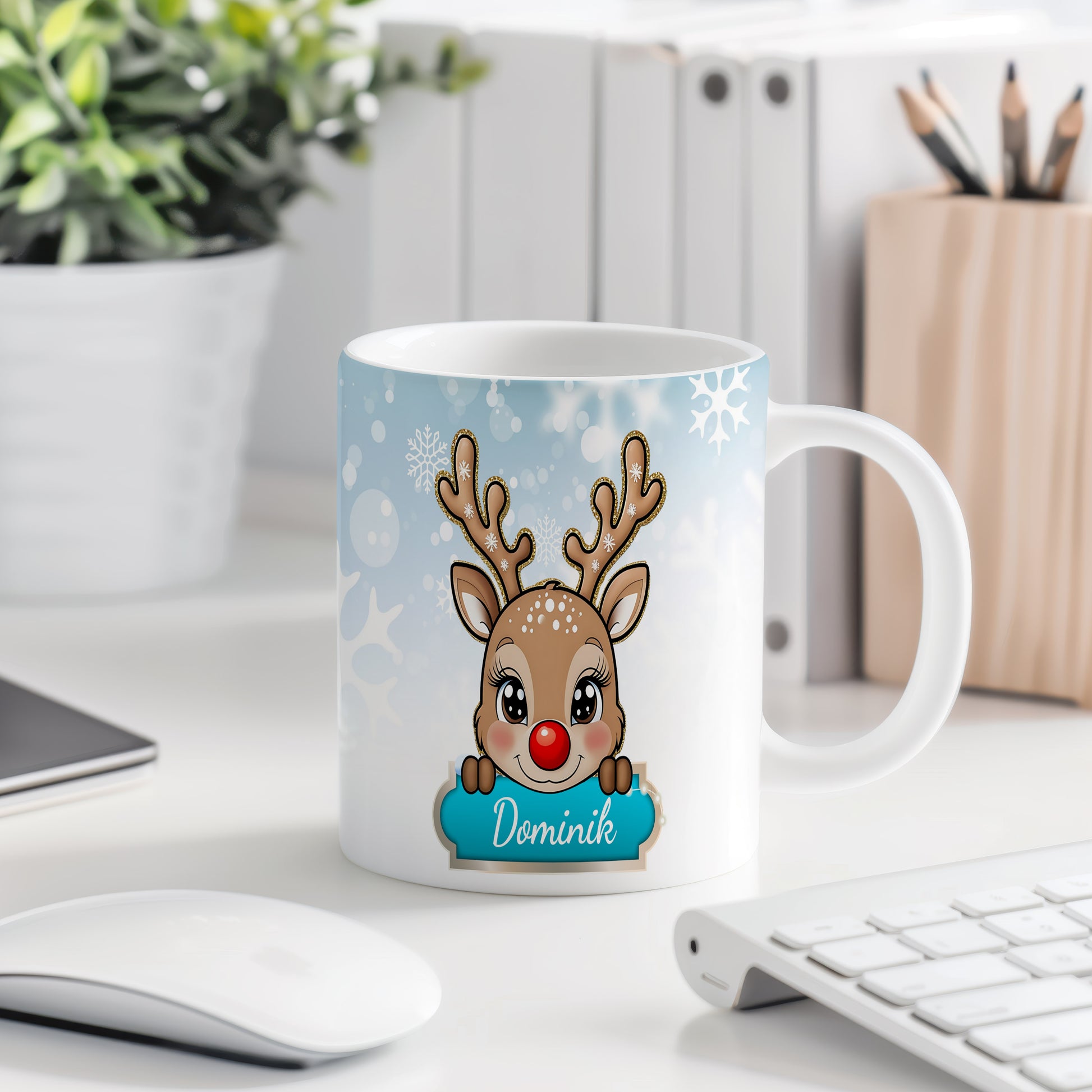 Veselý dětský hrnek se jménem Dominik s roztomilým sobem a zimními motivy. Skvělý osobní hrníček pro kluky.