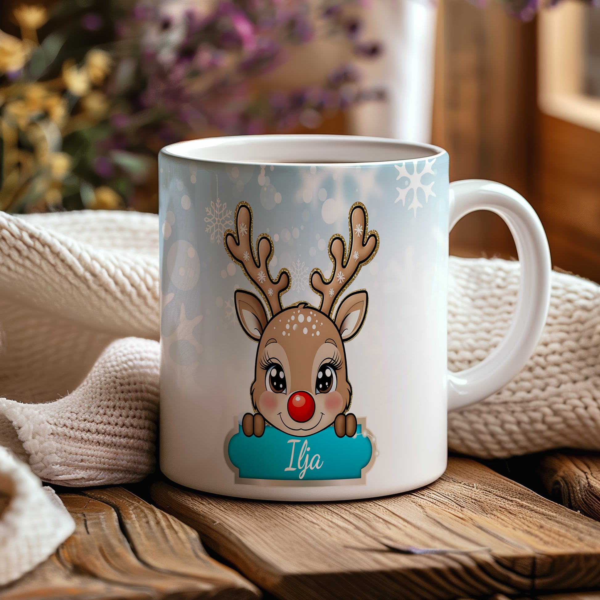 Veselý dětský hrnek se jménem Ilja s roztomilým sobem a zimními motivy. Skvělý osobní hrníček pro kluky.