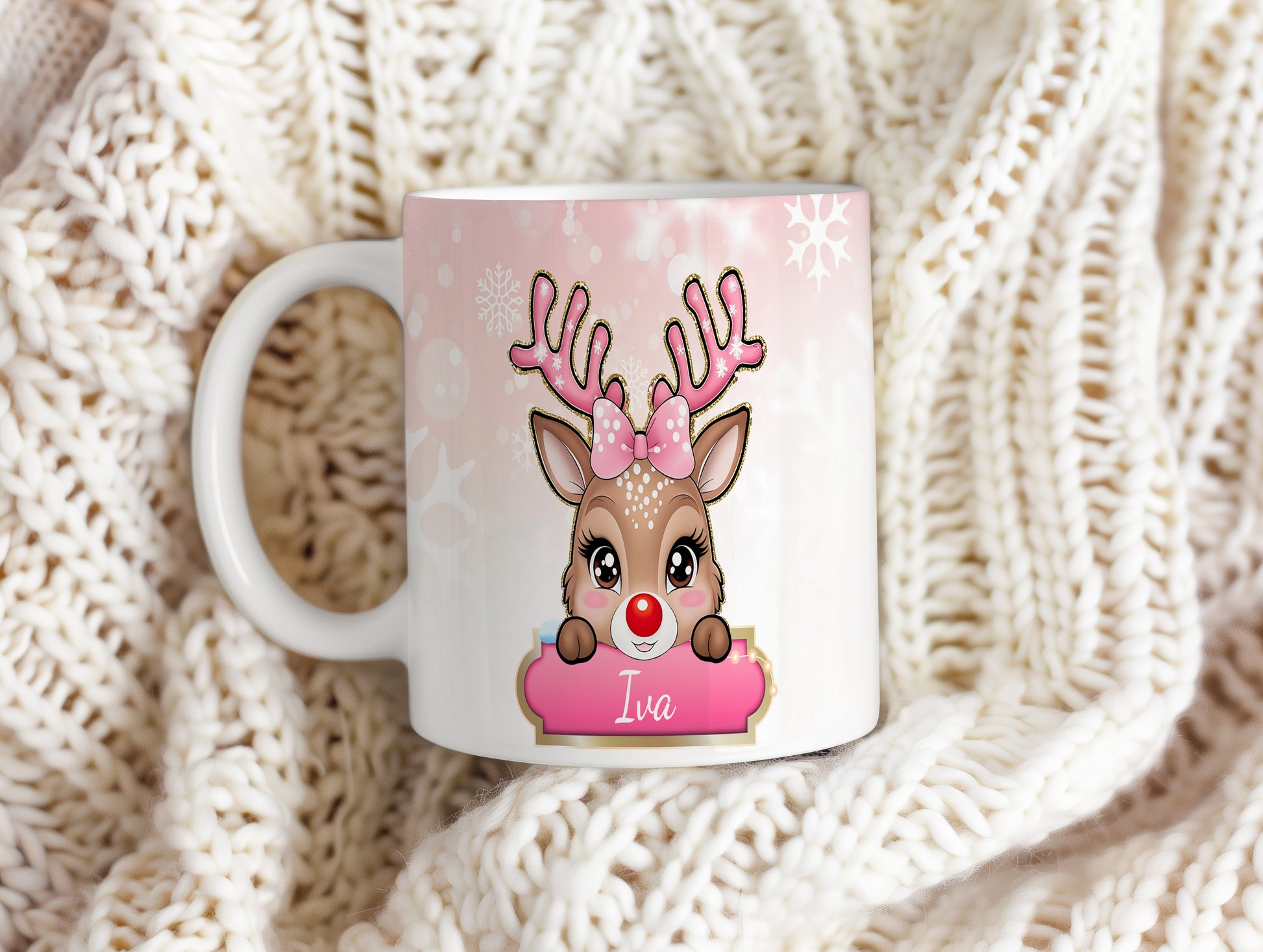Roztomilý dětský hrnek se jménem Iva s veselým sobem a zimními motivy. Krásný osobní hrníček pro holky.