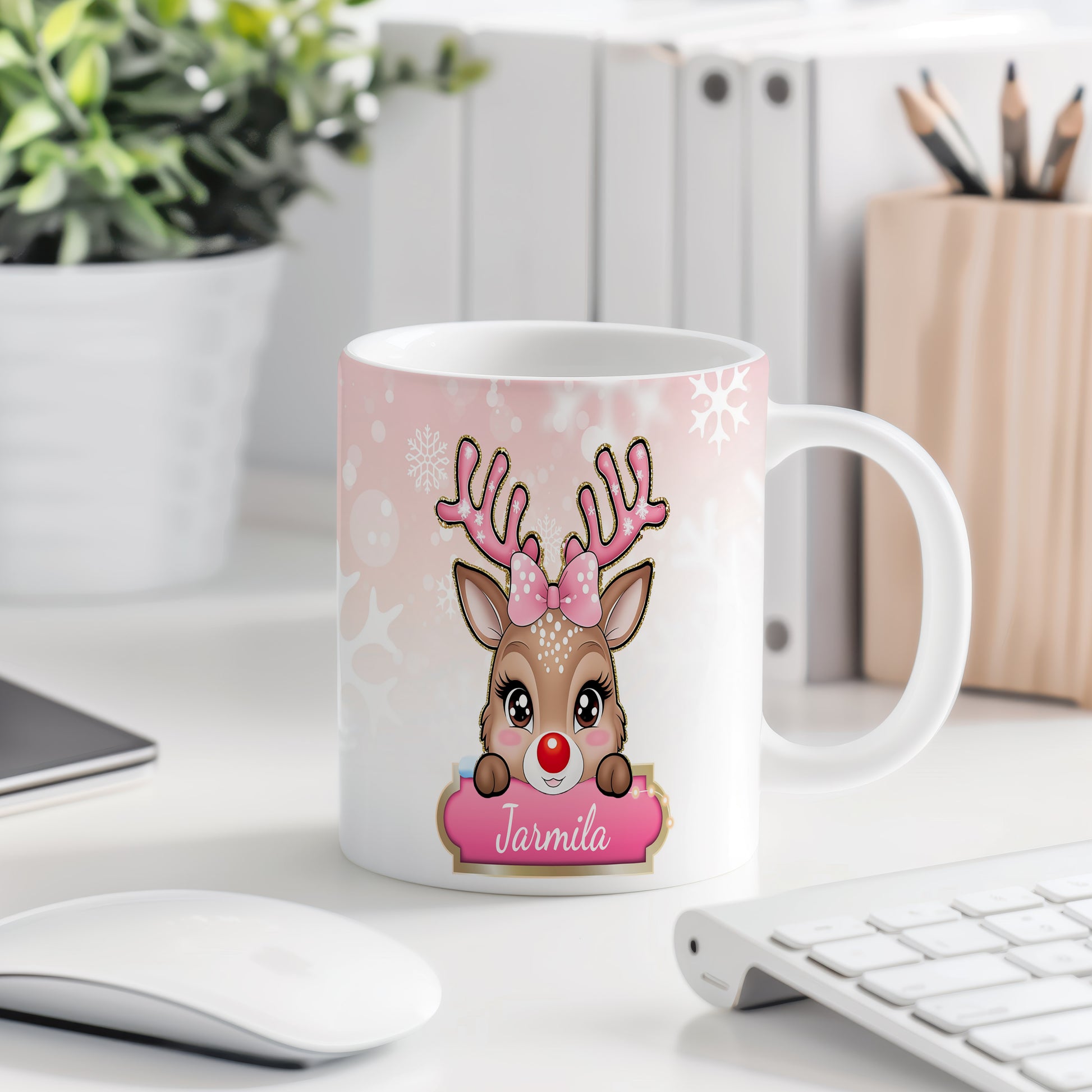 Roztomilý dětský hrnek se jménem Jarmila s veselým sobem a zimními motivy. Krásný osobní hrníček pro holky.