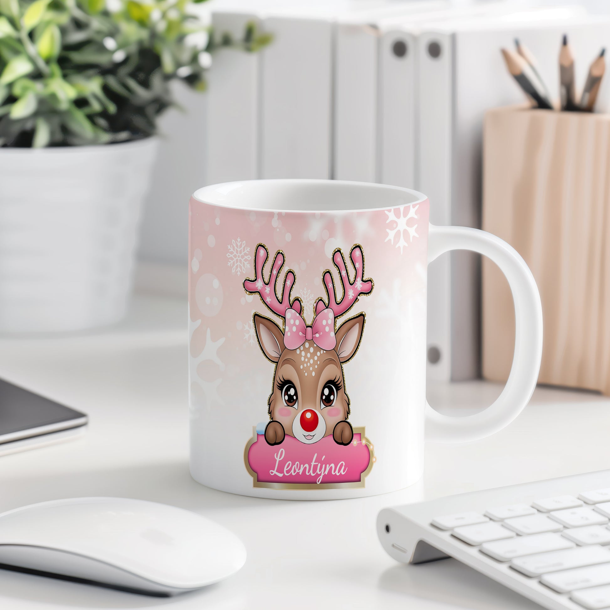 Roztomilý dětský hrnek se jménem Leontýna s veselým sobem a zimními motivy. Krásný osobní hrníček pro holky.