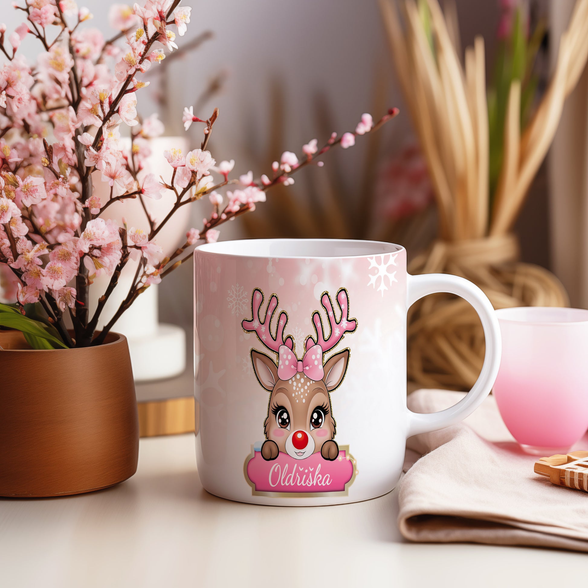 Roztomilý dětský hrnek se jménem Oldřiška s veselým sobem a zimními motivy. Krásný osobní hrníček pro holky.