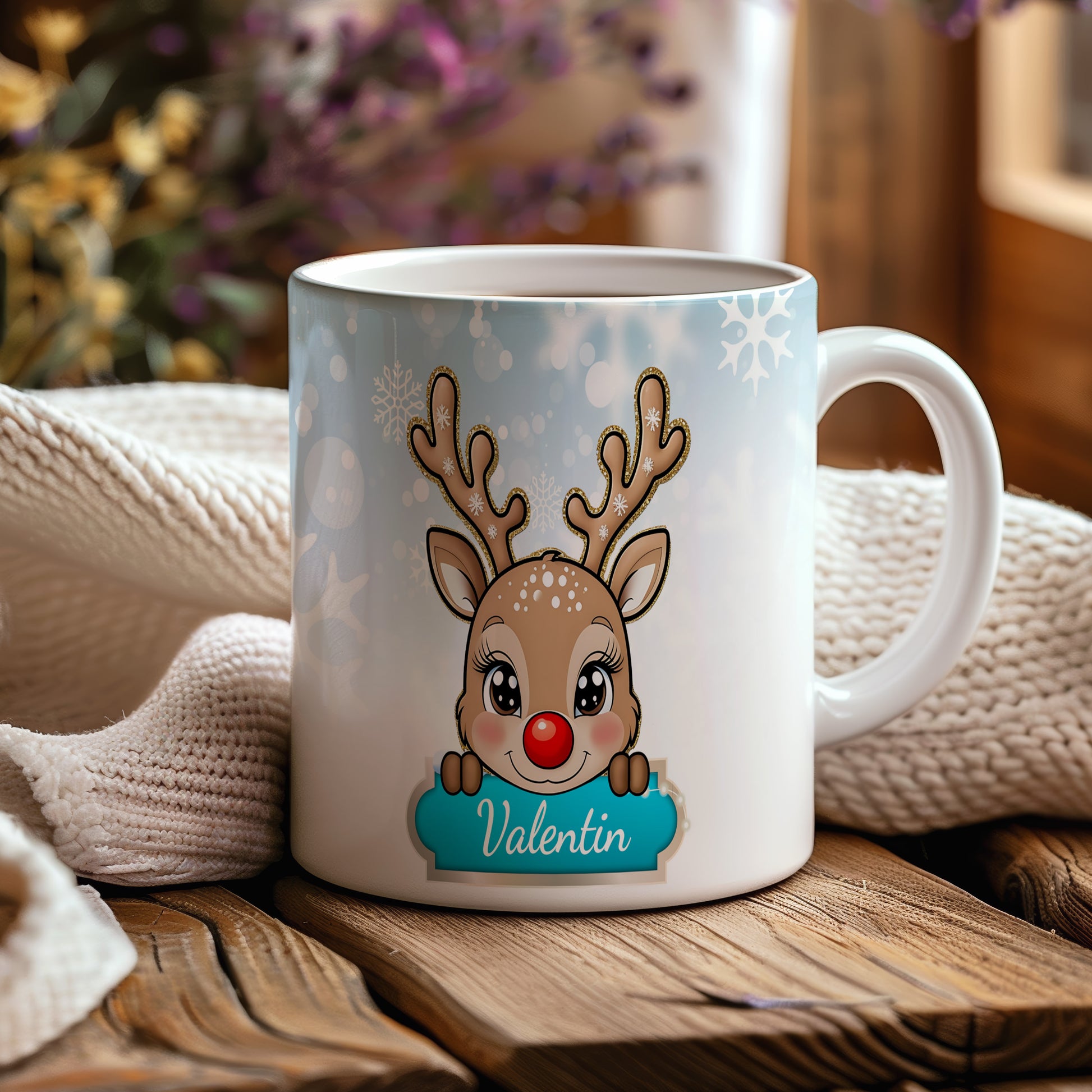 Veselý dětský hrnek se jménem Valentin s roztomilým sobem a zimními motivy. Skvělý osobní hrníček pro kluky.