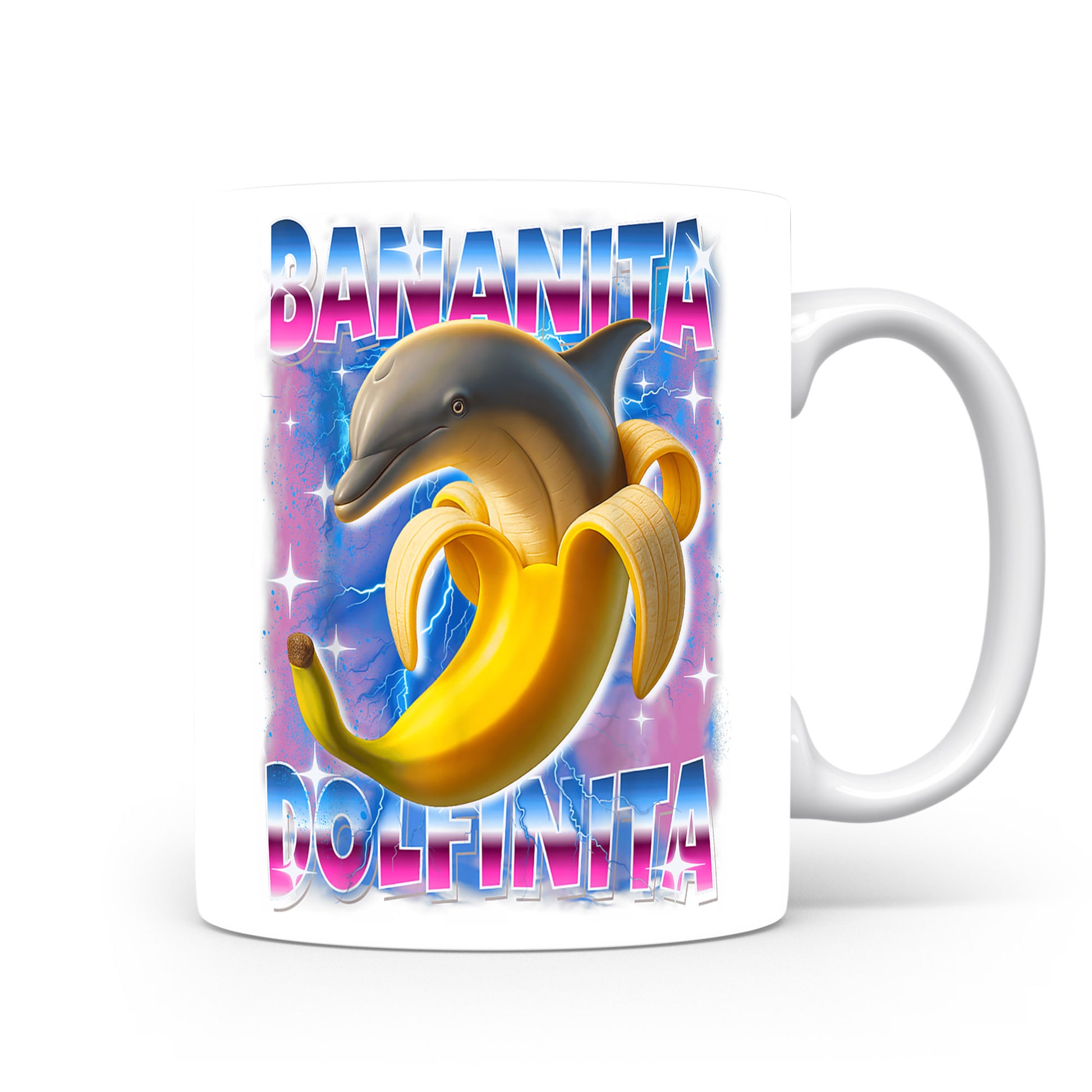 Design inspirovaný italským brainrotem: Bananini Bolinini — banán točící se. Lesklý keramický hrnek 330 ml.