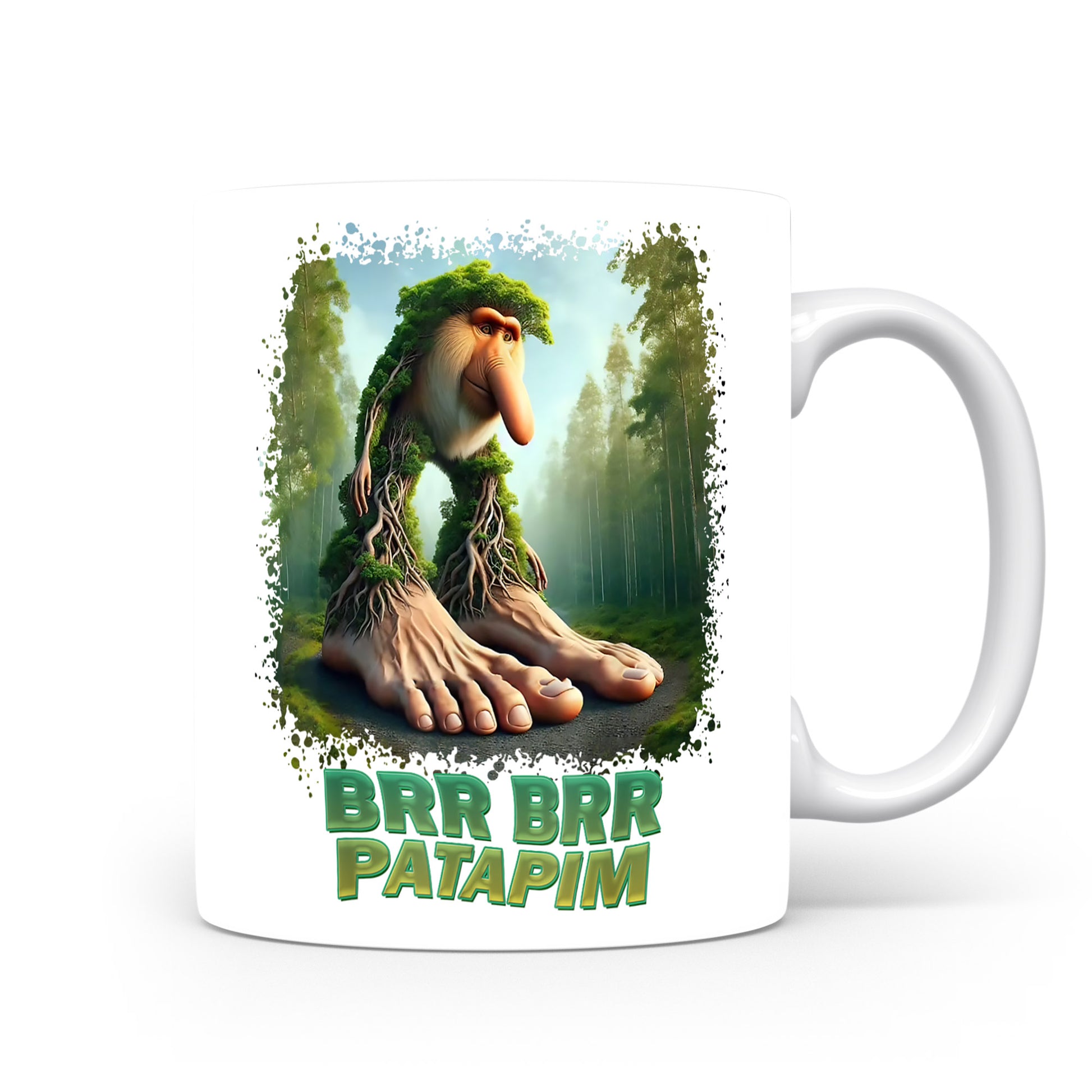 Design inspirovaný italským brainrotem: Brr Brr Patapim — louka. Lesklý keramický hrnek 330 ml.