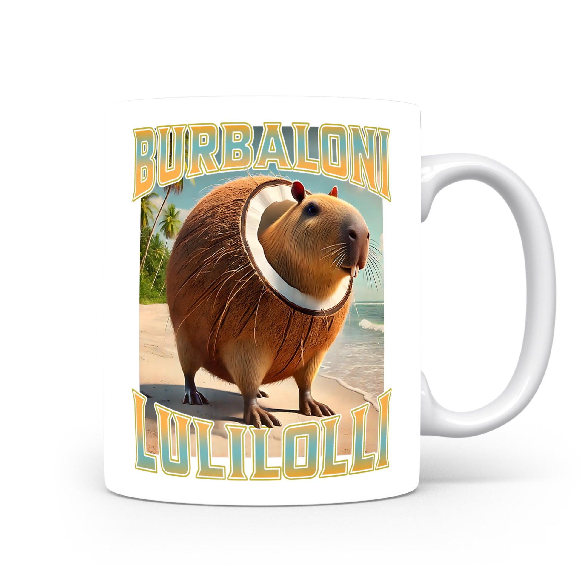 Design inspirovaný italským brainrotem: Burrbaloni Luliloli — kapybara s lízátkem. Lesklý keramický hrnek 330 ml.