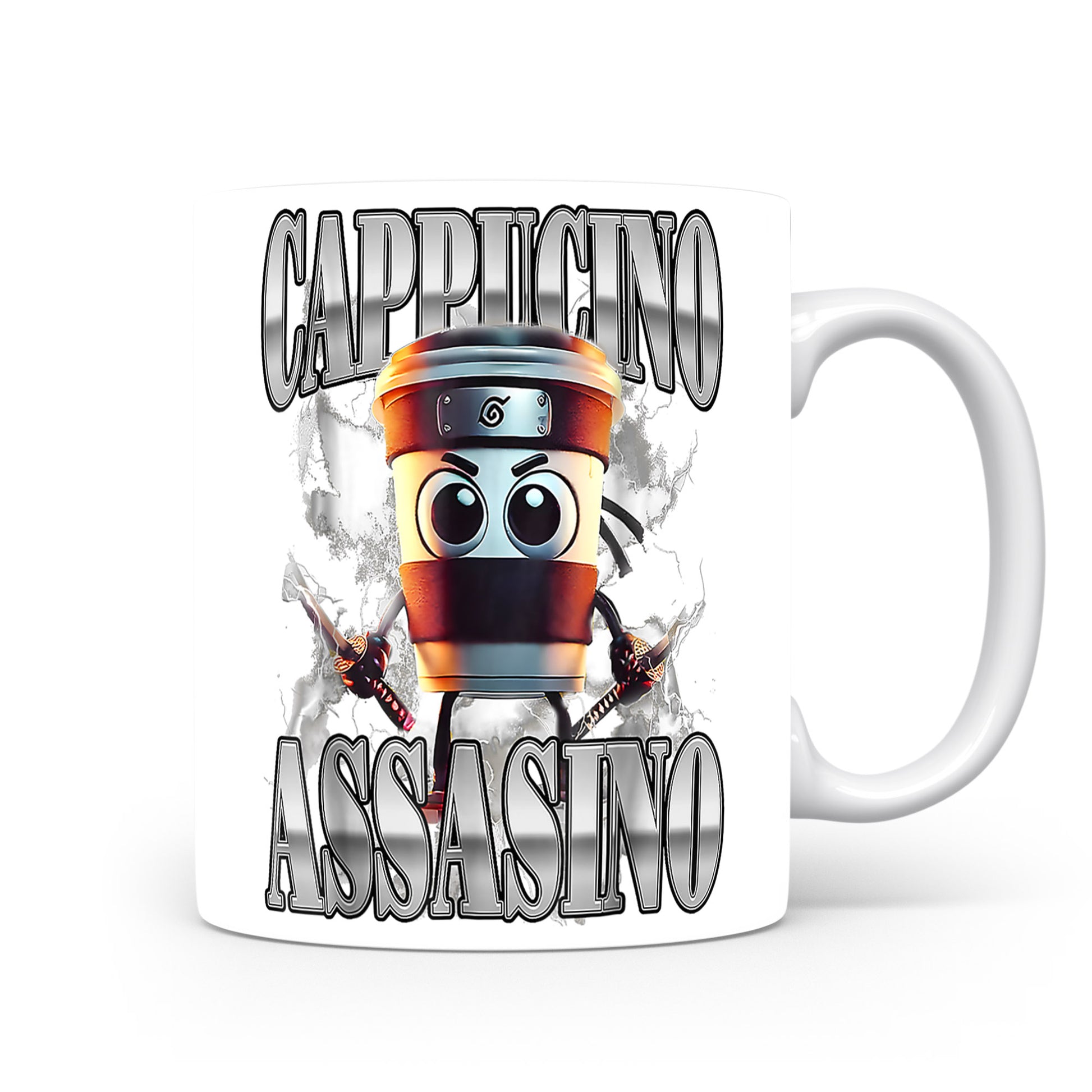 Hrnek s italským brainrotem – Cappuccino Assassino — bílá exploze