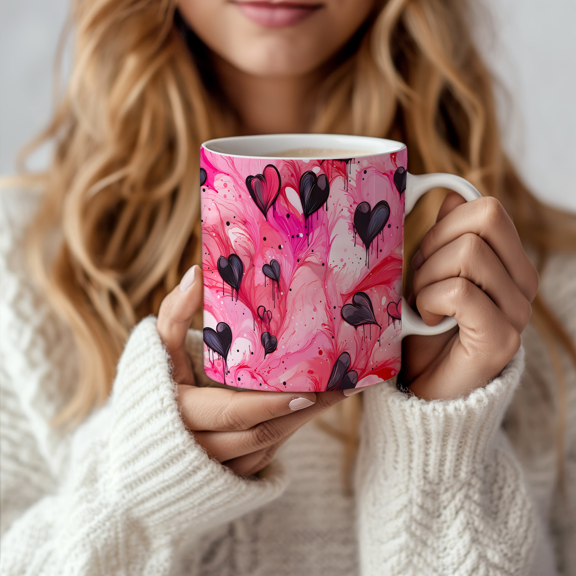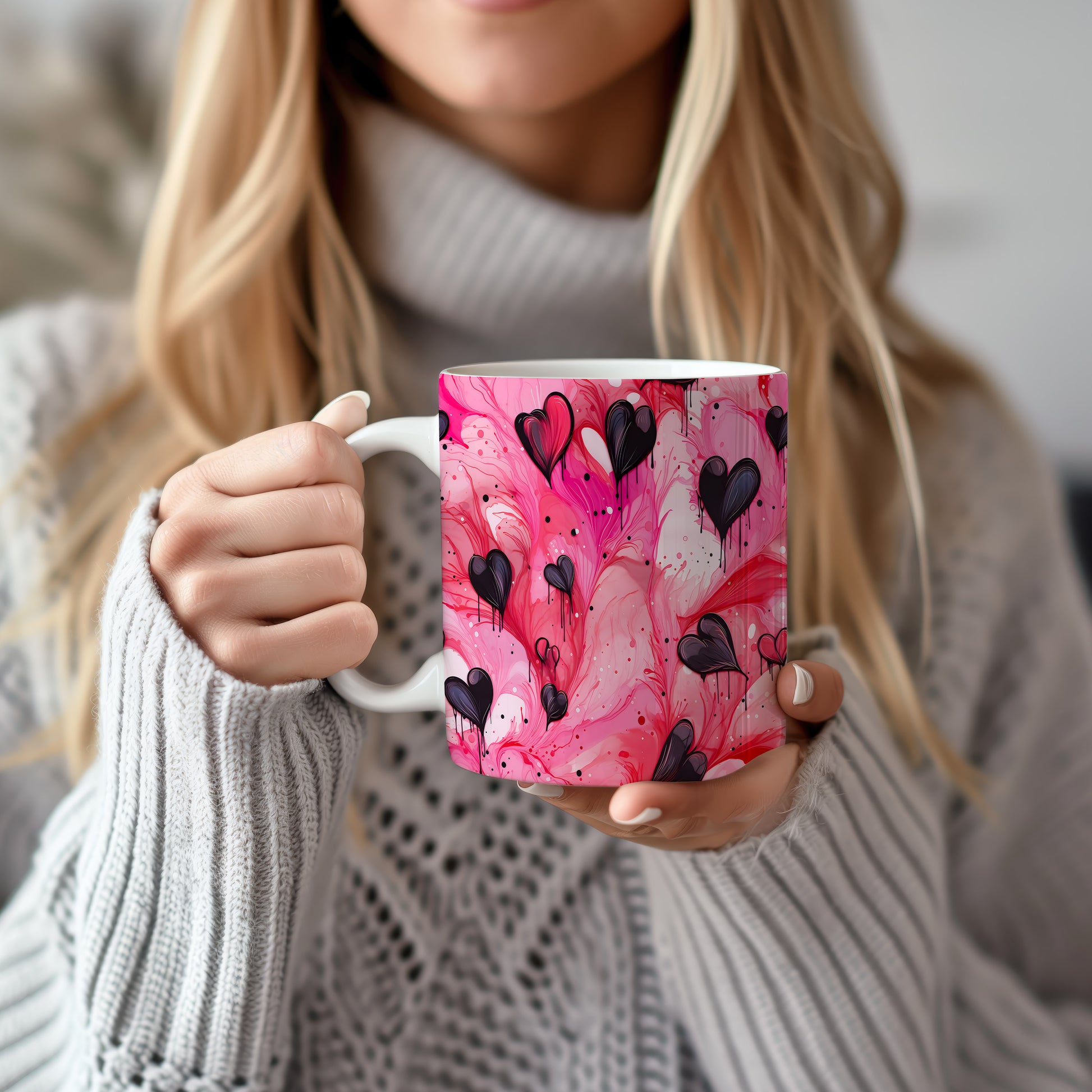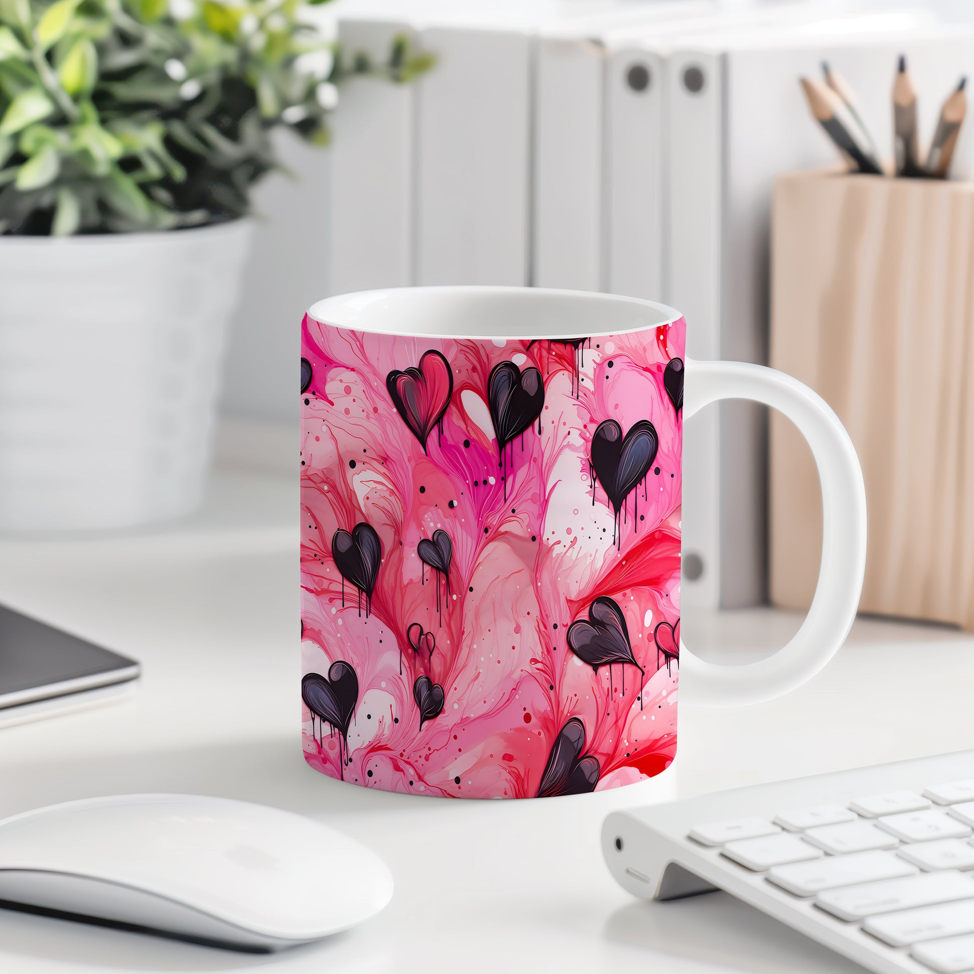 Objevte kouzlo lásky s naším hrnkem s černými srdci na růžovém pozadí. Tento výrazný design přináší do každé chvíle romantiku a vášeň. Ideální jako dárek pro milovanou osobu nebo pro zkrášlení vašeho domova.