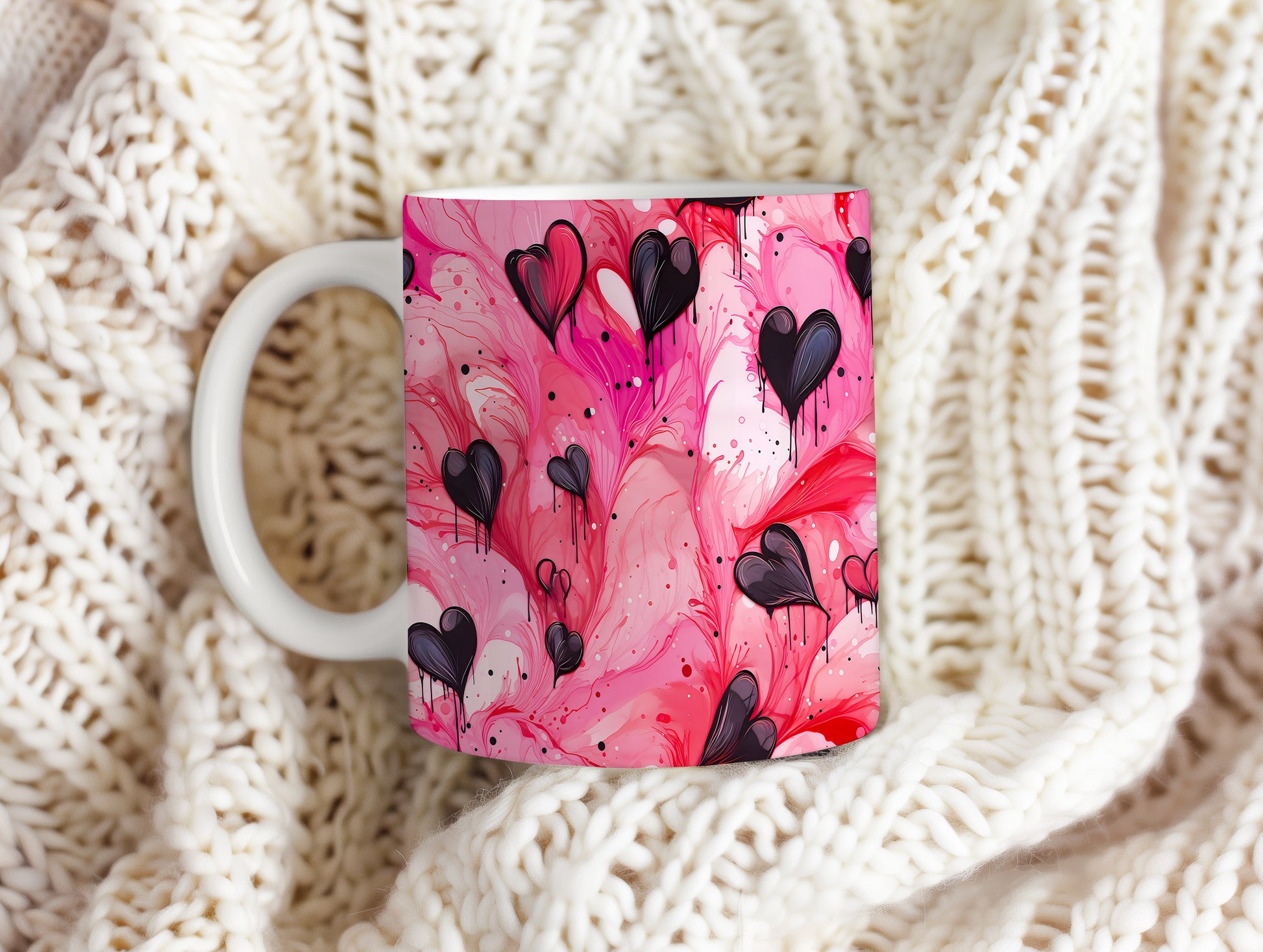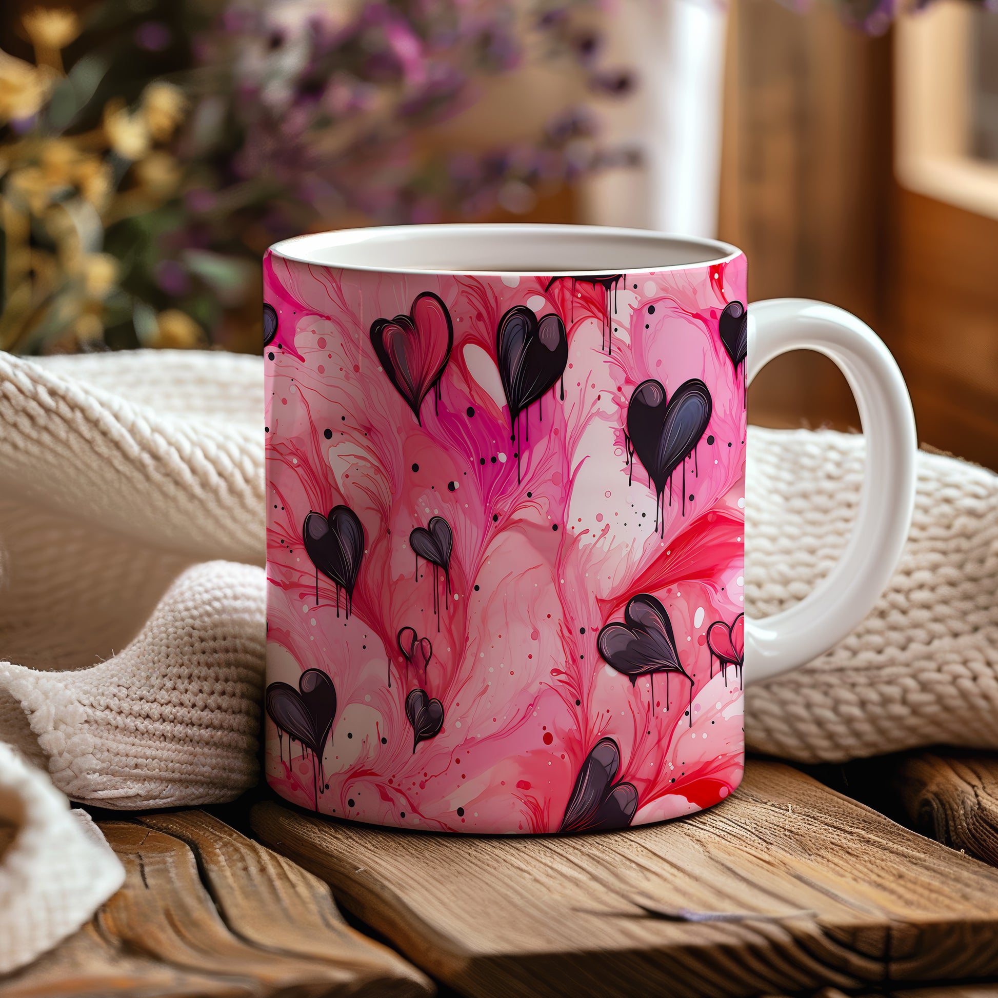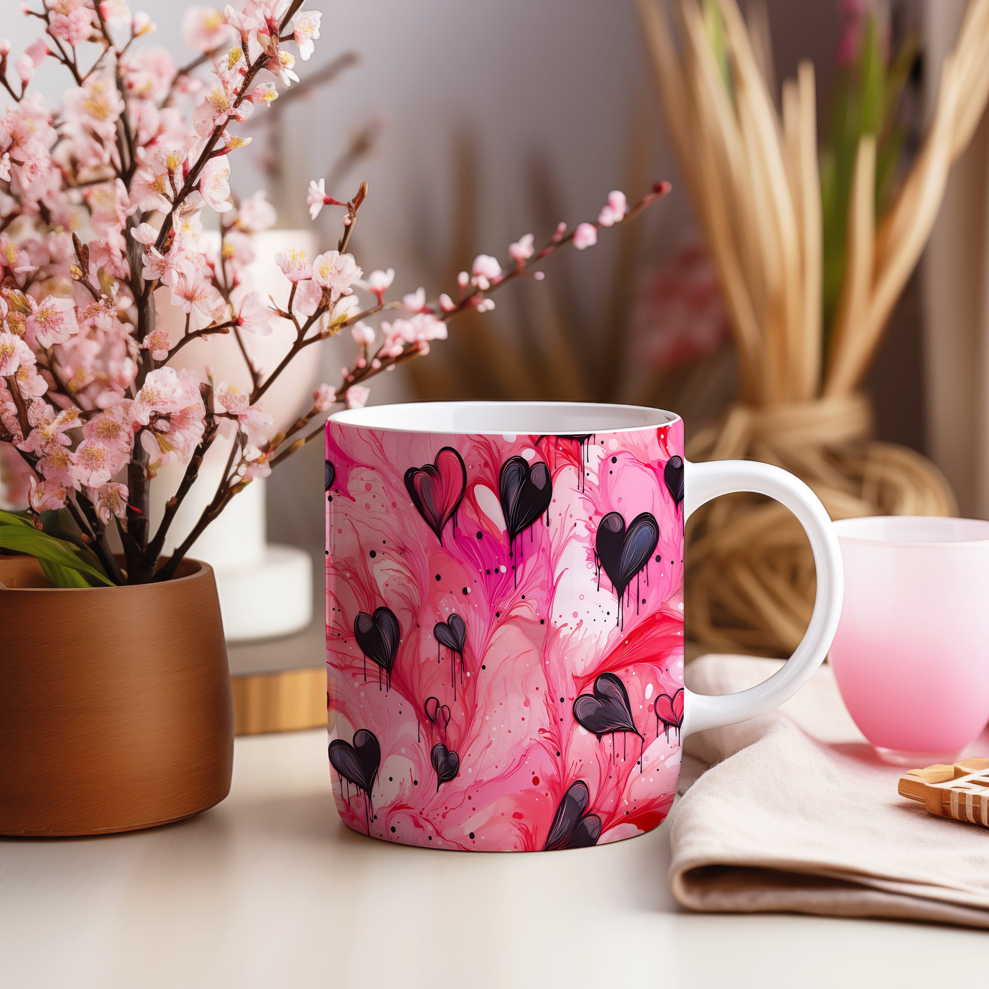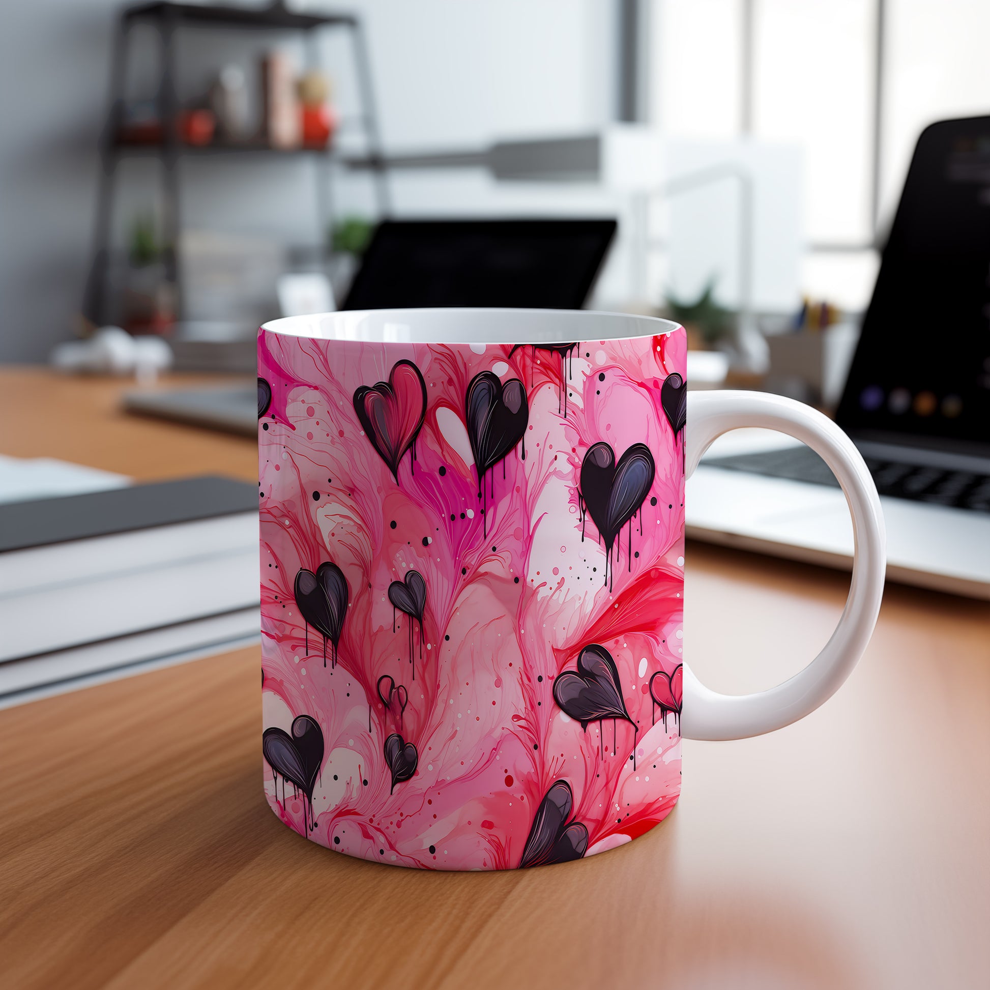 Hrnek s černými srdci na růžovém pozadí