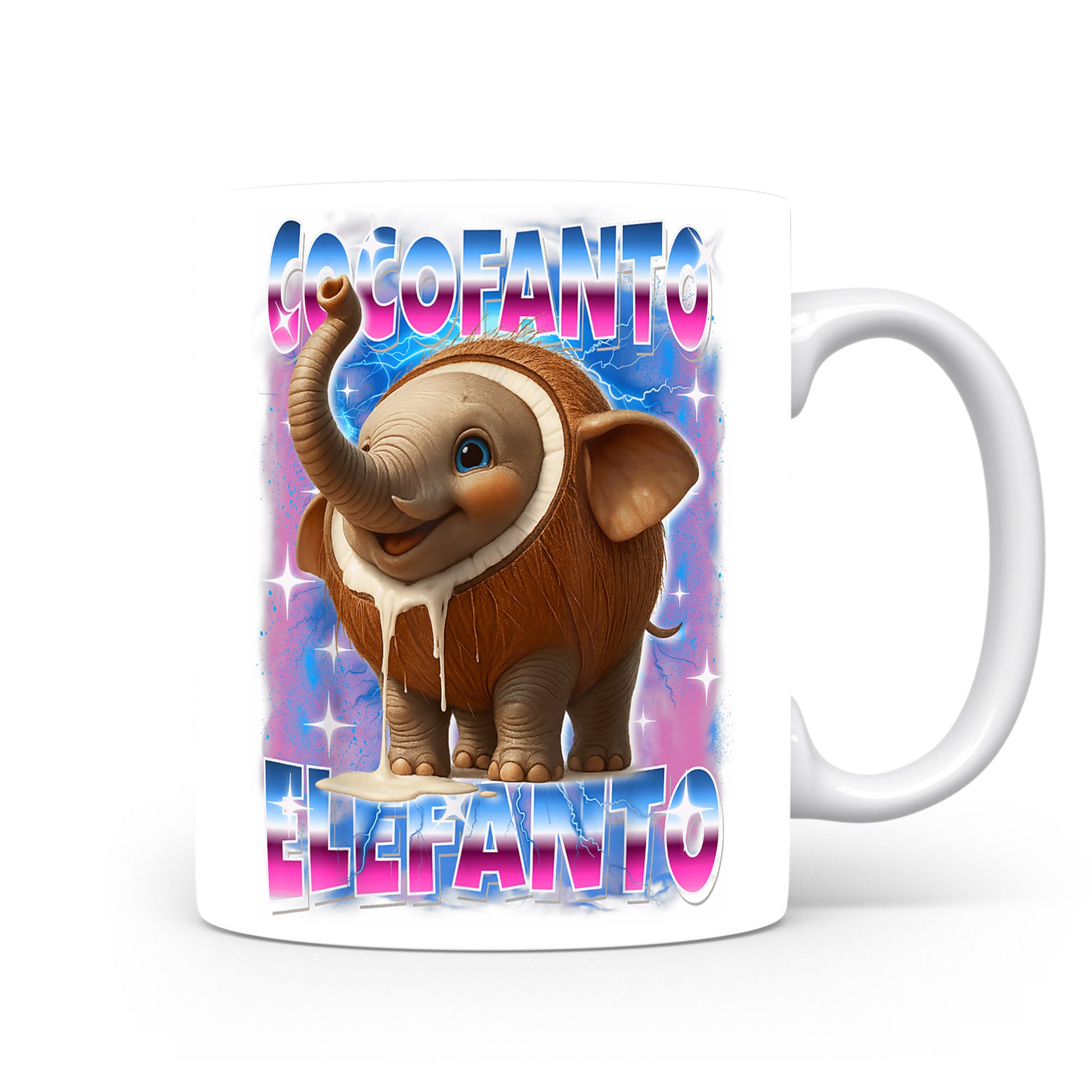 Design inspirovaný italským brainrotem: Cocofanto Elefanto — disco slůně. Lesklý keramický hrnek 330 ml.