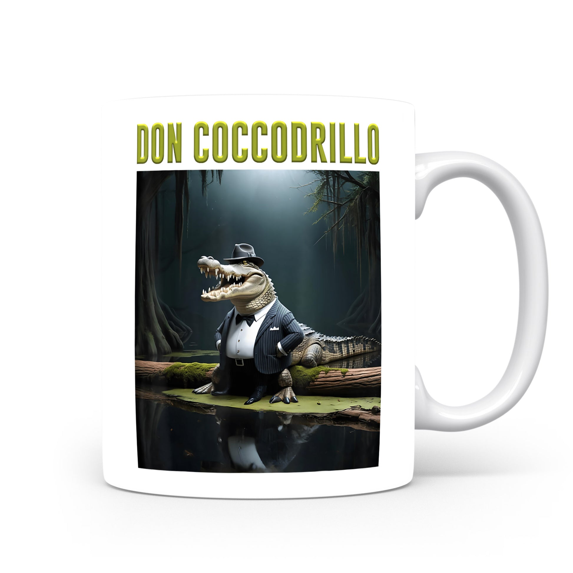 Design inspirovaný italským brainrotem: Don Coccodrillo — mafián krokodýl. Lesklý keramický hrnek 330 ml.