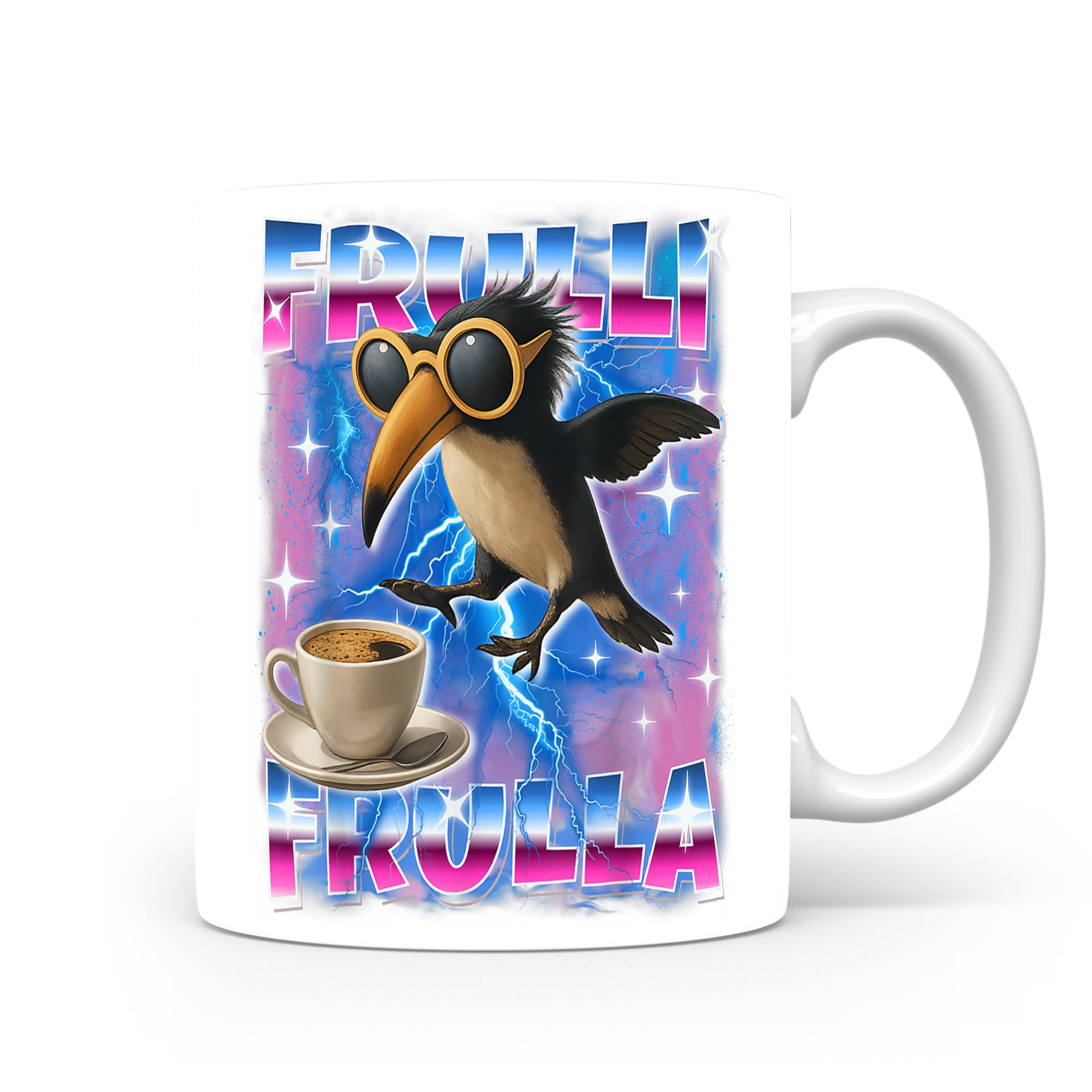Design inspirovaný italským brainrotem: Fruli Frula — tučňák s kávou. Lesklý keramický hrnek 330 ml.