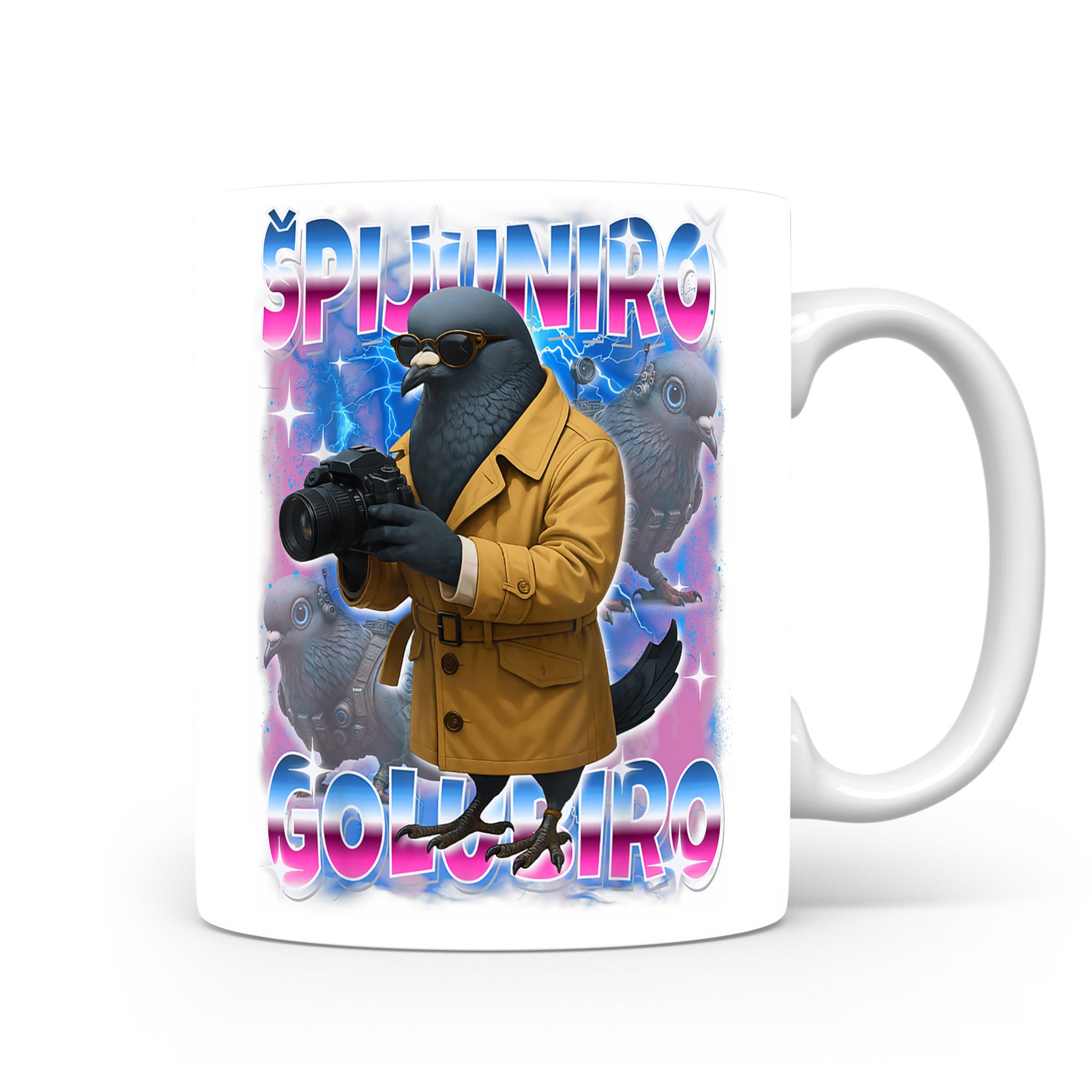 Vtipný hrnek s motivem Špijuniro Golubiro – holubí špion s fotoaparátem, ideální dárek.