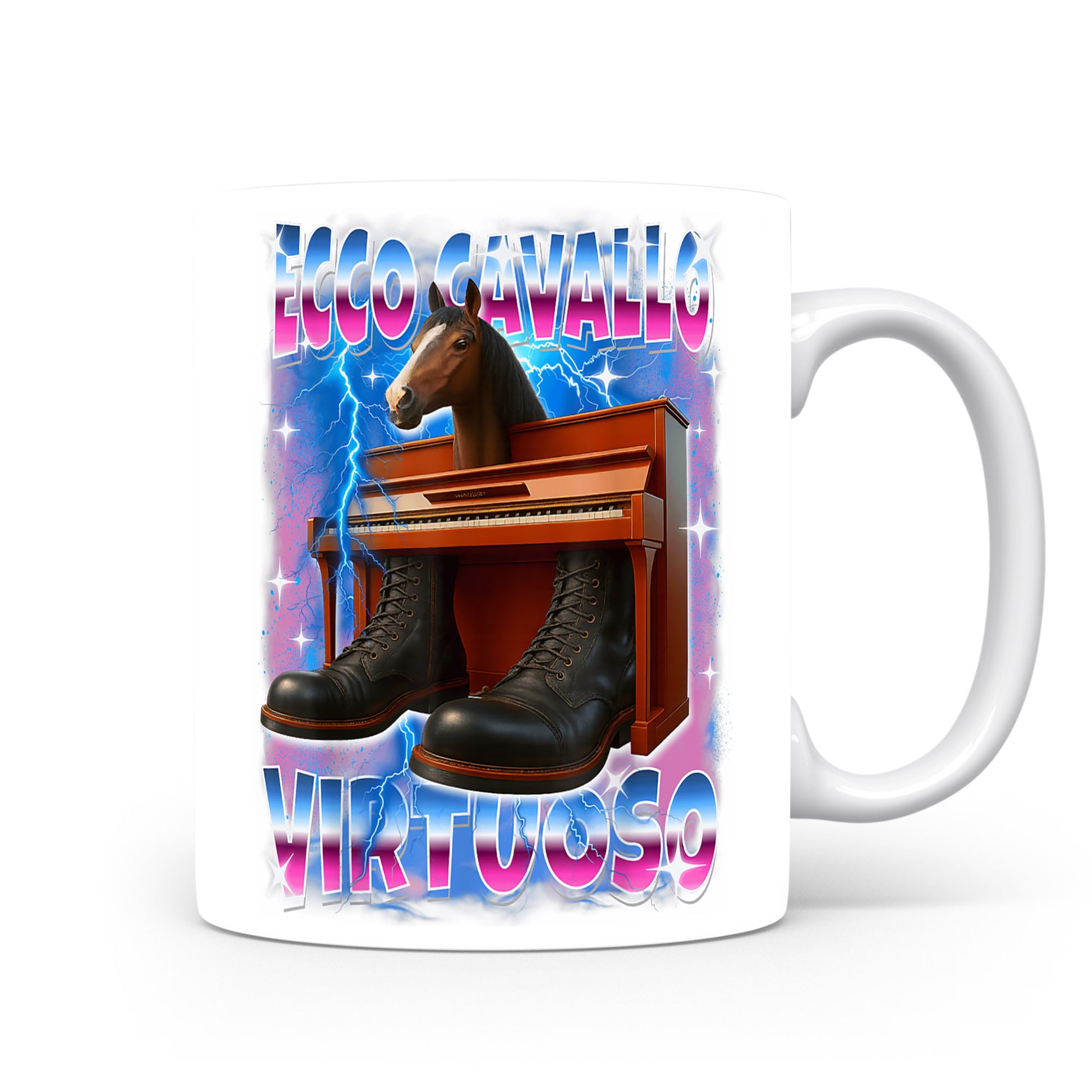 Design inspirovaný italským brainrotem: Kboots Mllosso — boty na podpatku (modrá aura). Lesklý keramický hrnek 330 ml.