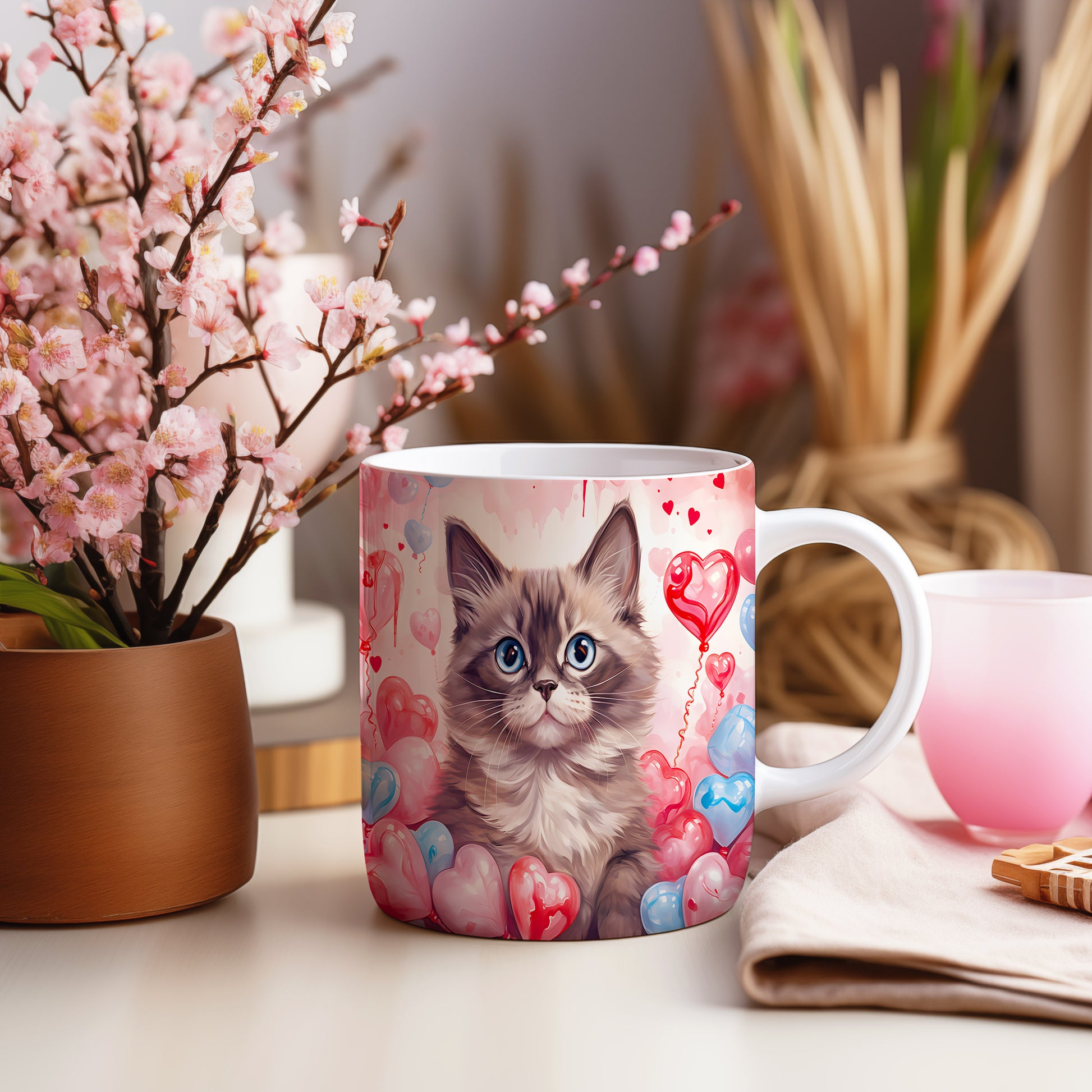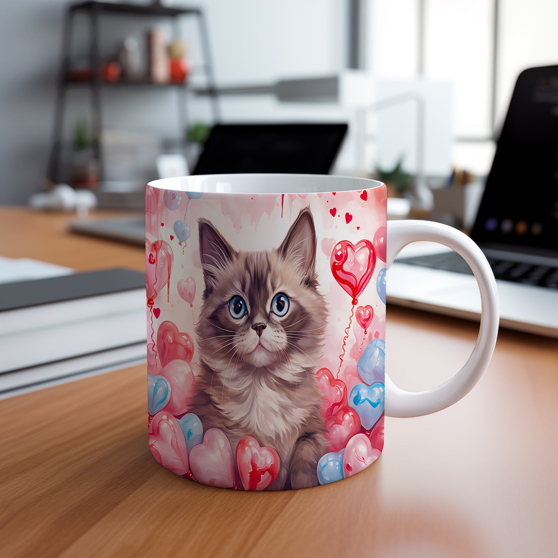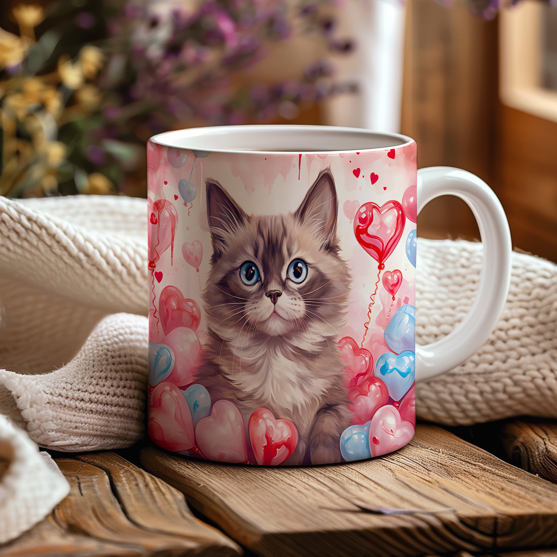 Vychutnejte si svou kávu s hrnkem, který vás zahřeje u srdce. Roztomilá kočička obklopená pastelovými srdíčky přinese úsměv na tvář každému milovníkovi zvířat.