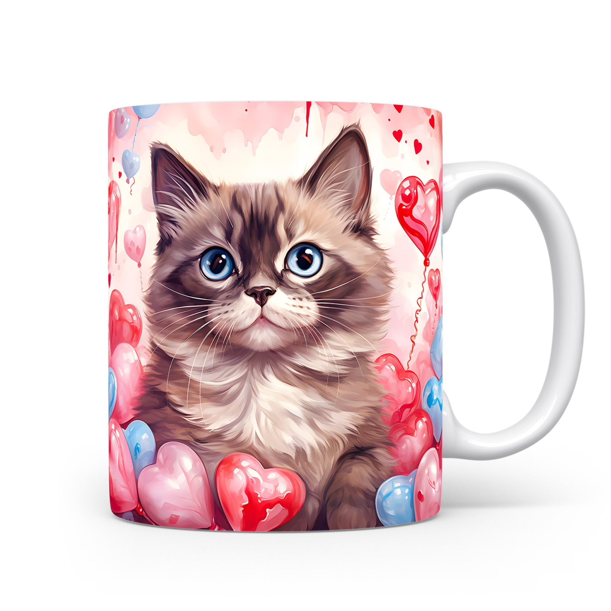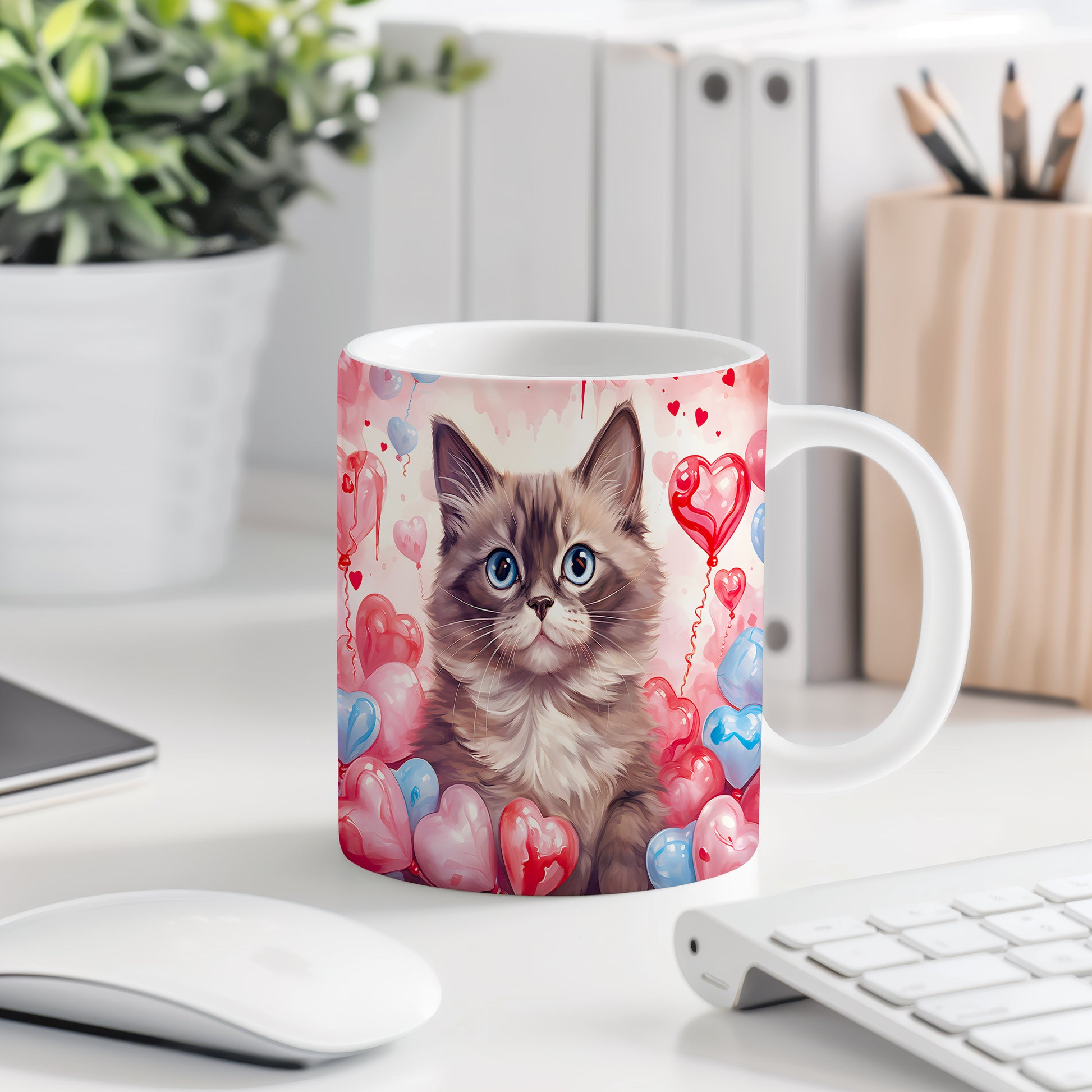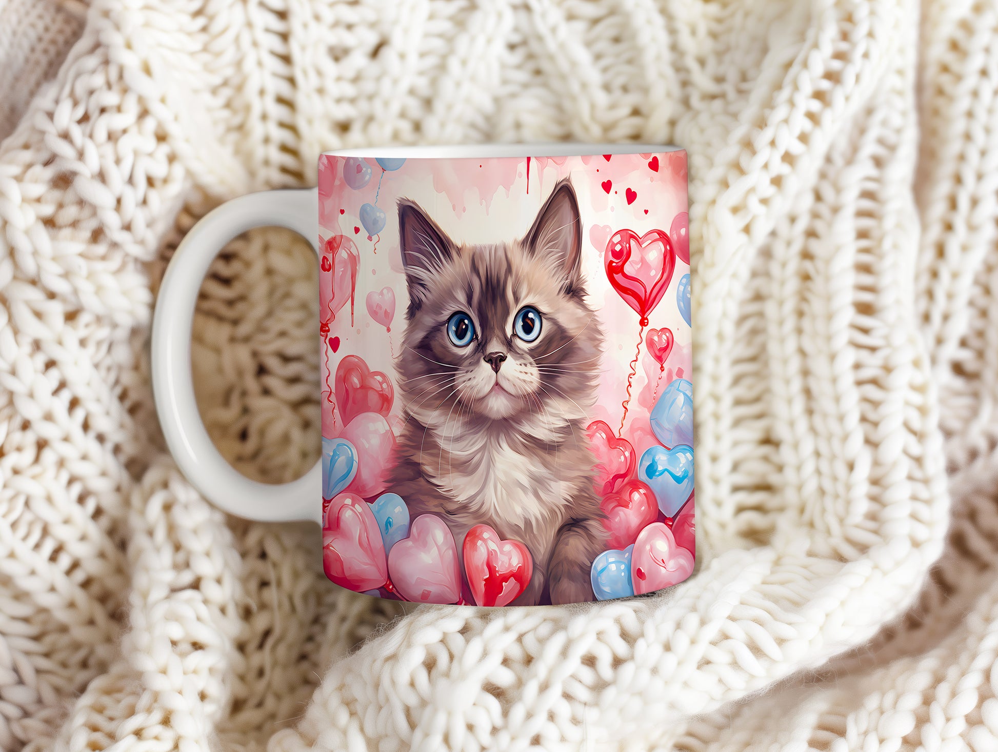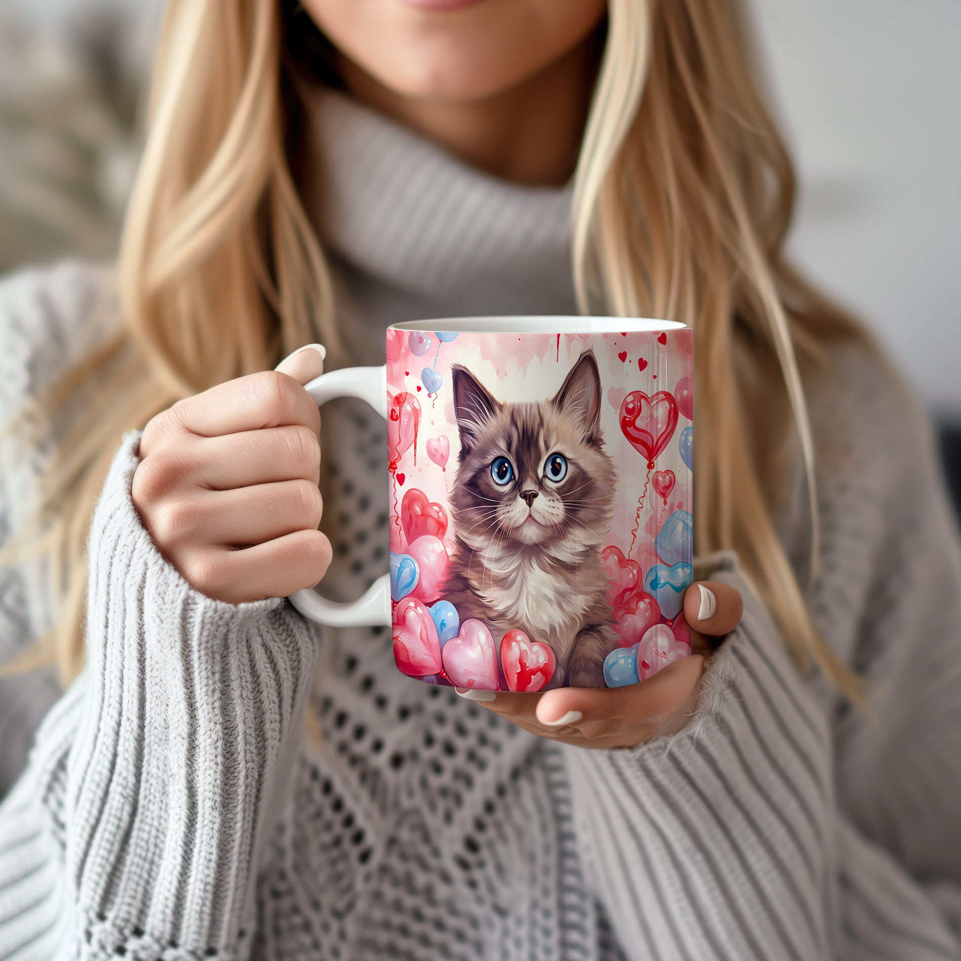 Vychutnejte si svou kávu s hrnkem, který vás zahřeje u srdce. Roztomilá kočička obklopená pastelovými srdíčky přinese úsměv na tvář každému milovníkovi zvířat.