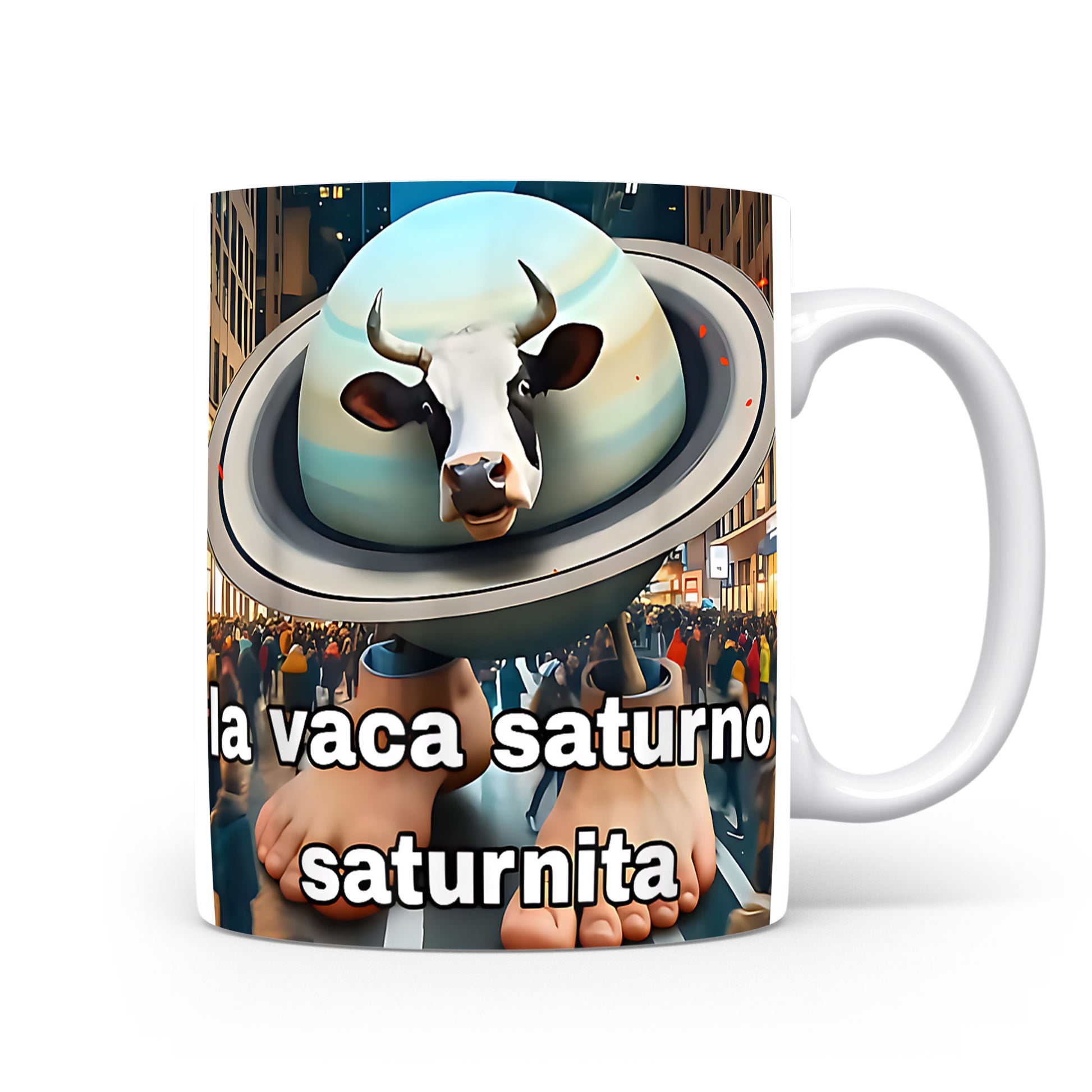 Design inspirovaný italským brainrotem: La Vaca Saturno — Saturnita (víko + kráva). Lesklý keramický hrnek 330 ml.