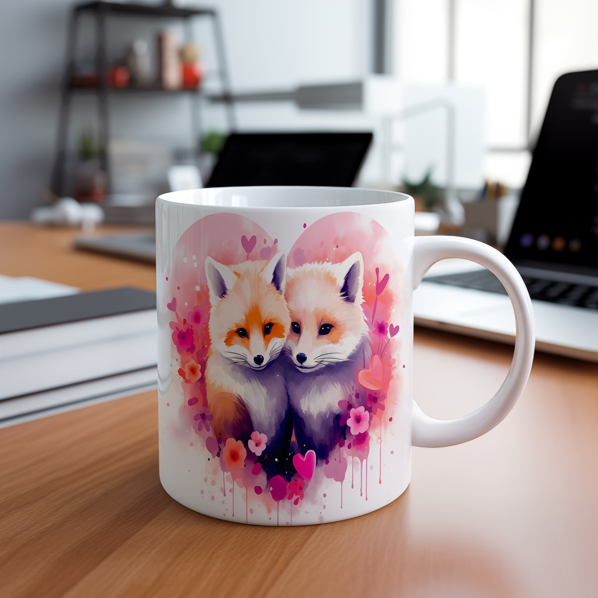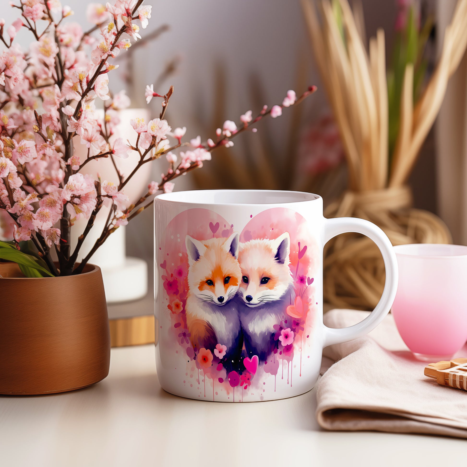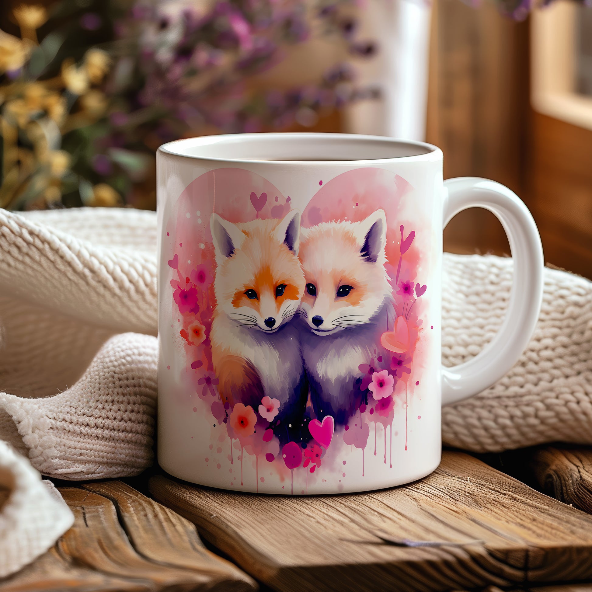 Objevte kouzlo tohoto hrnku s nádherným motivem lišek. Jemné pastelové barvy a romantické květiny přinášejí do vašeho dne radost a pohodu. Ideální dárek pro milovníky přírody a zvířat.