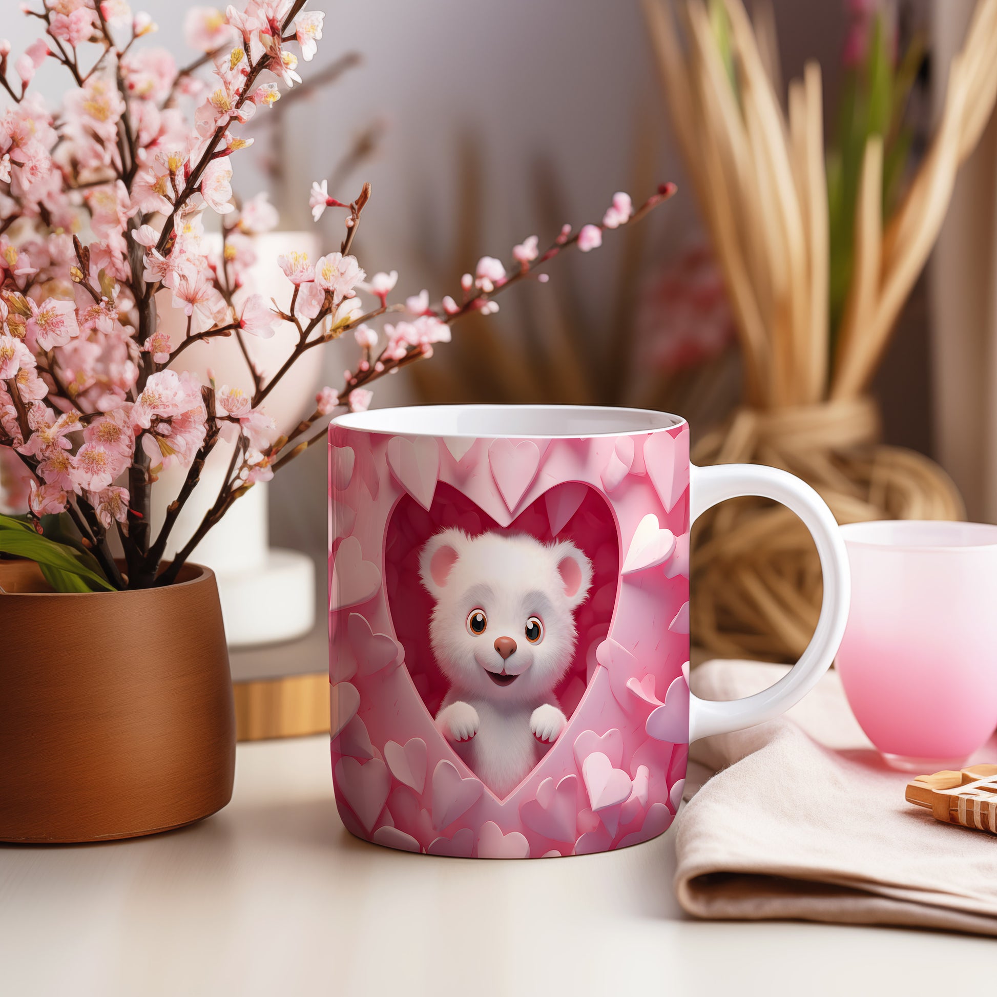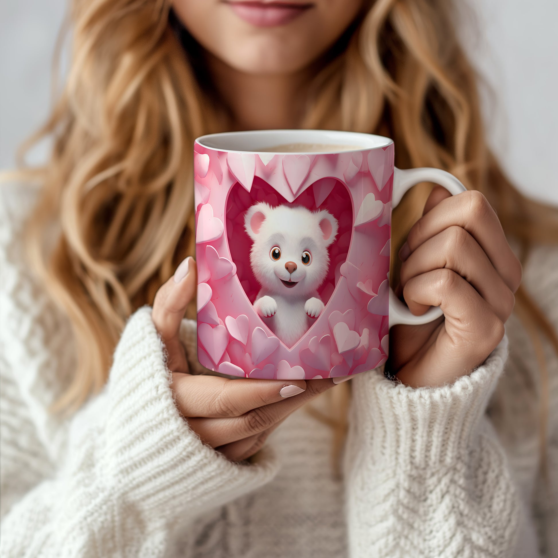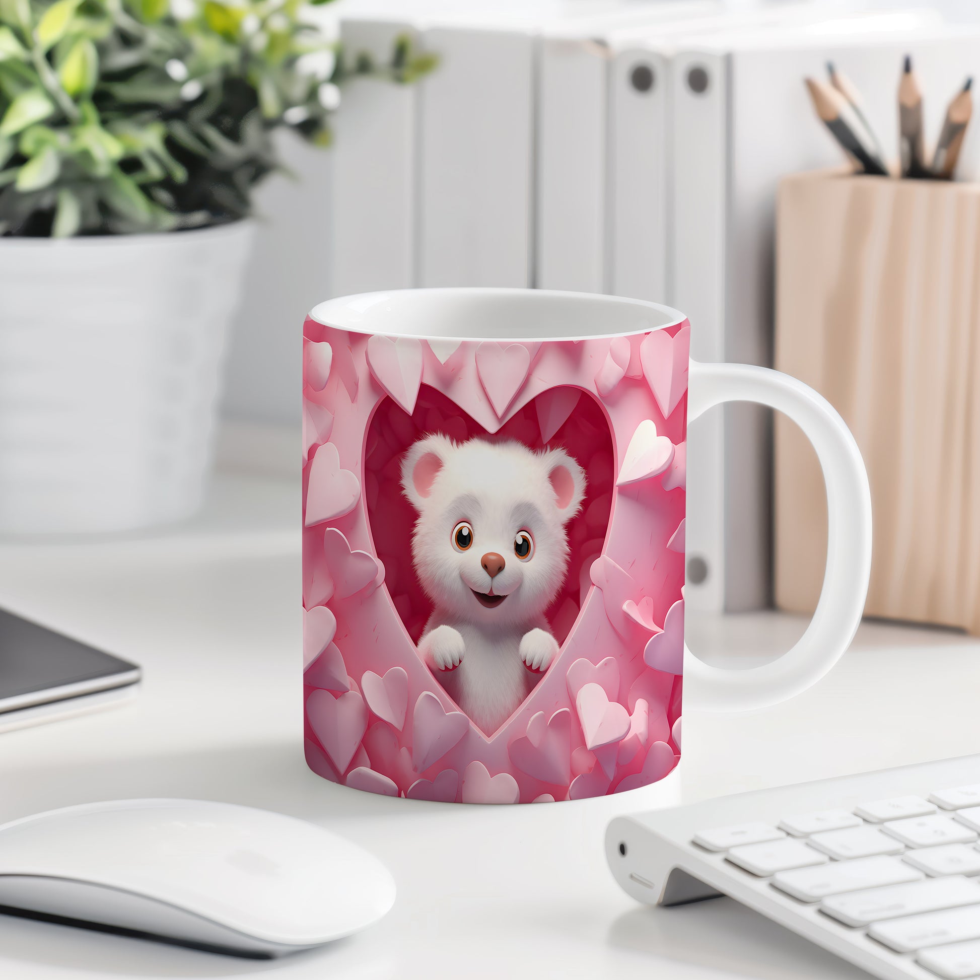 Roztomilý hrnek s bílým medvídkem obklopeným růžovými srdci zahřeje každé ráno. Přináší nádech něžnosti a radosti do vašeho dne. Ideální dárek pro milovníky roztomilých motivů.