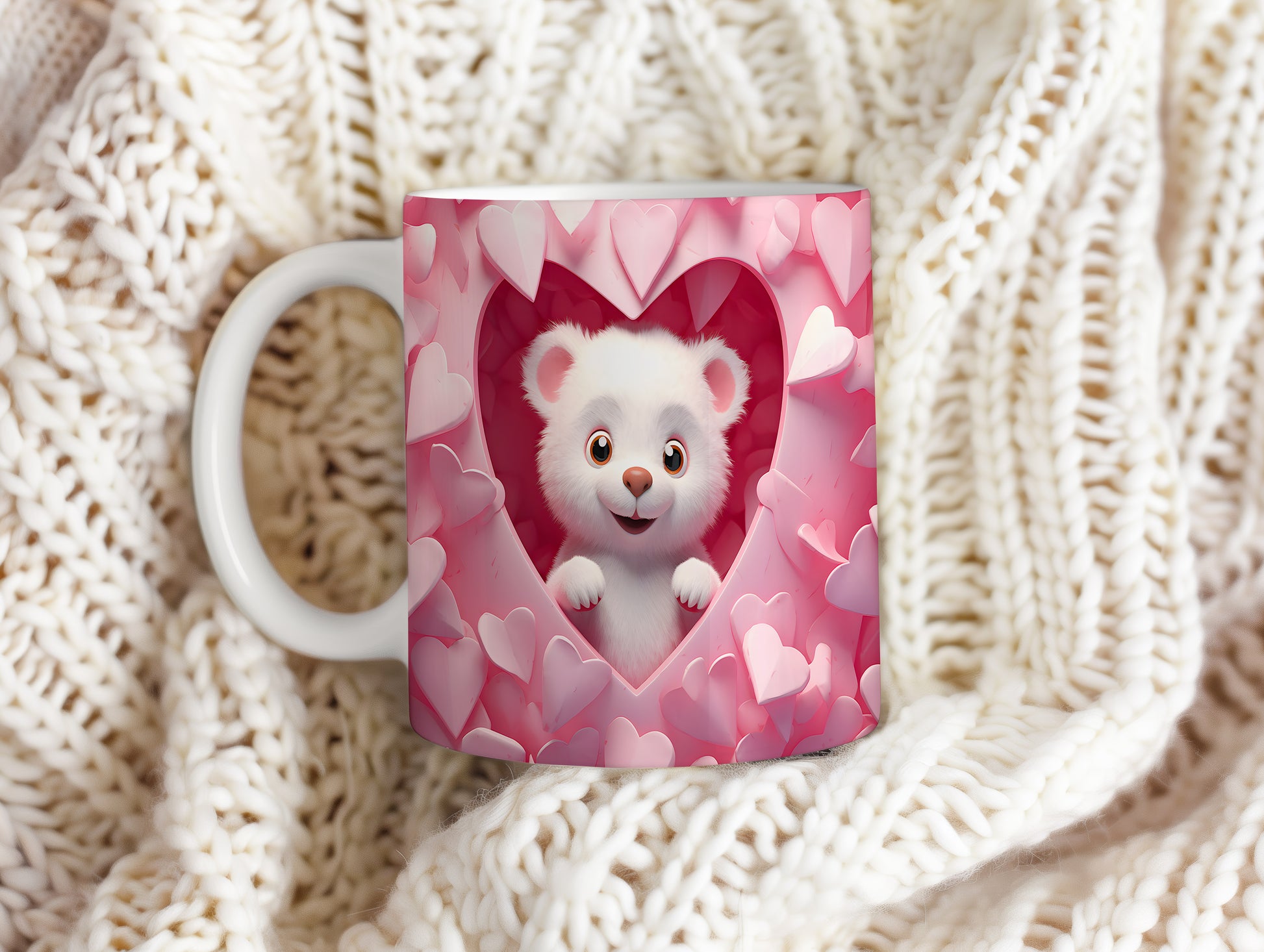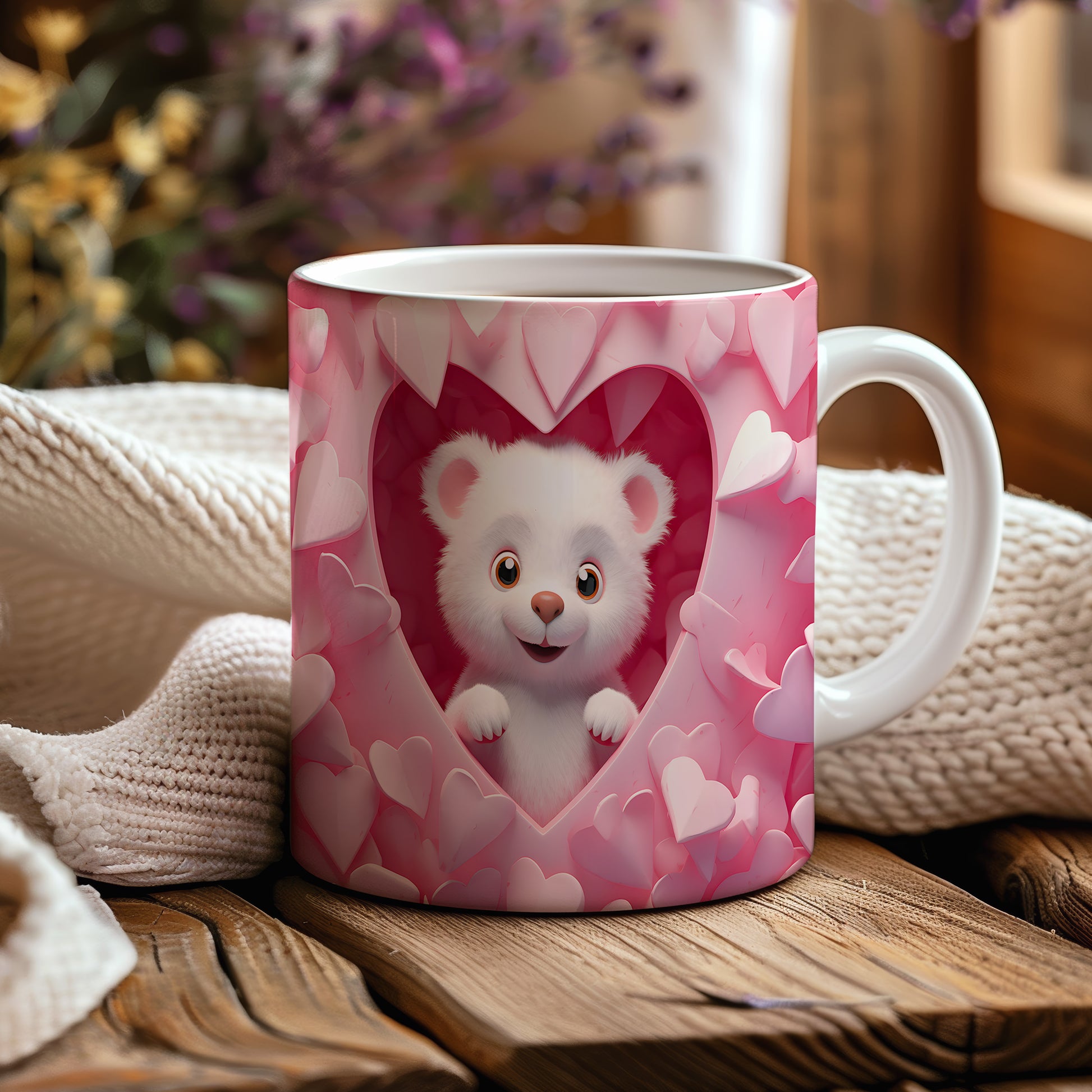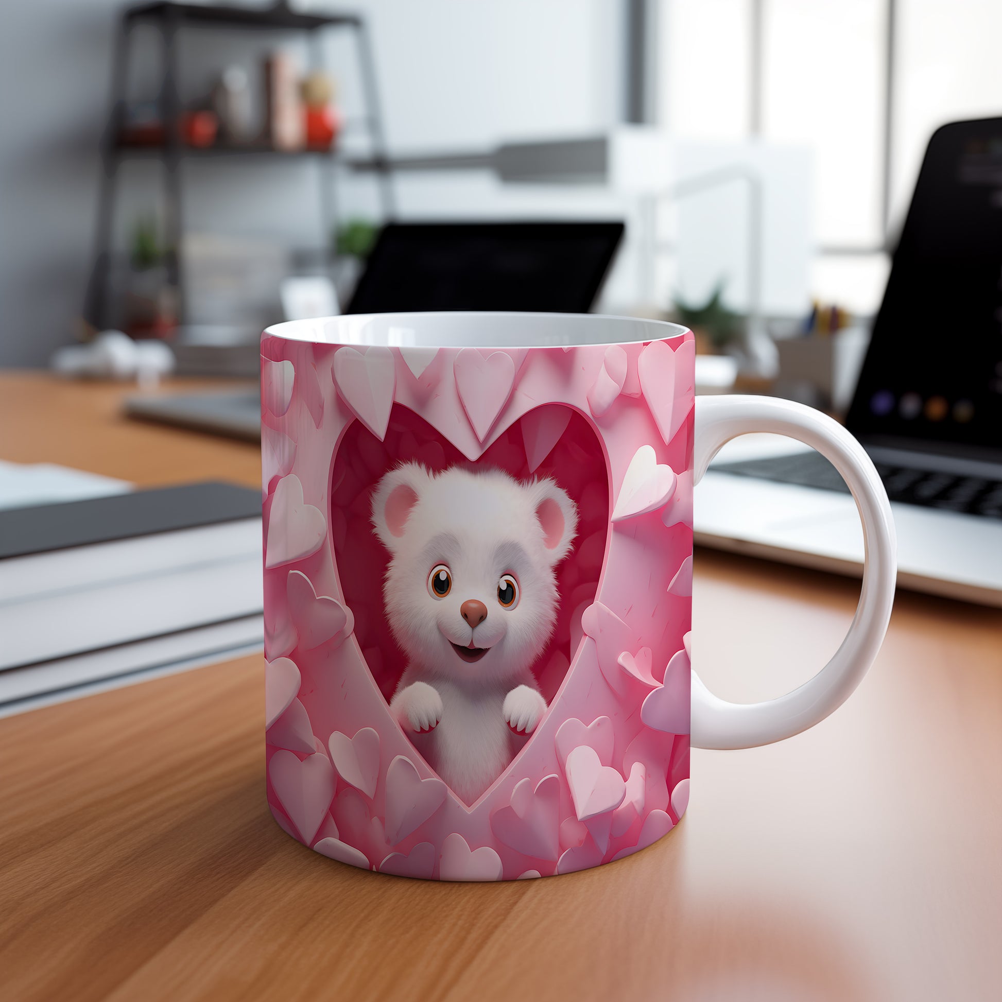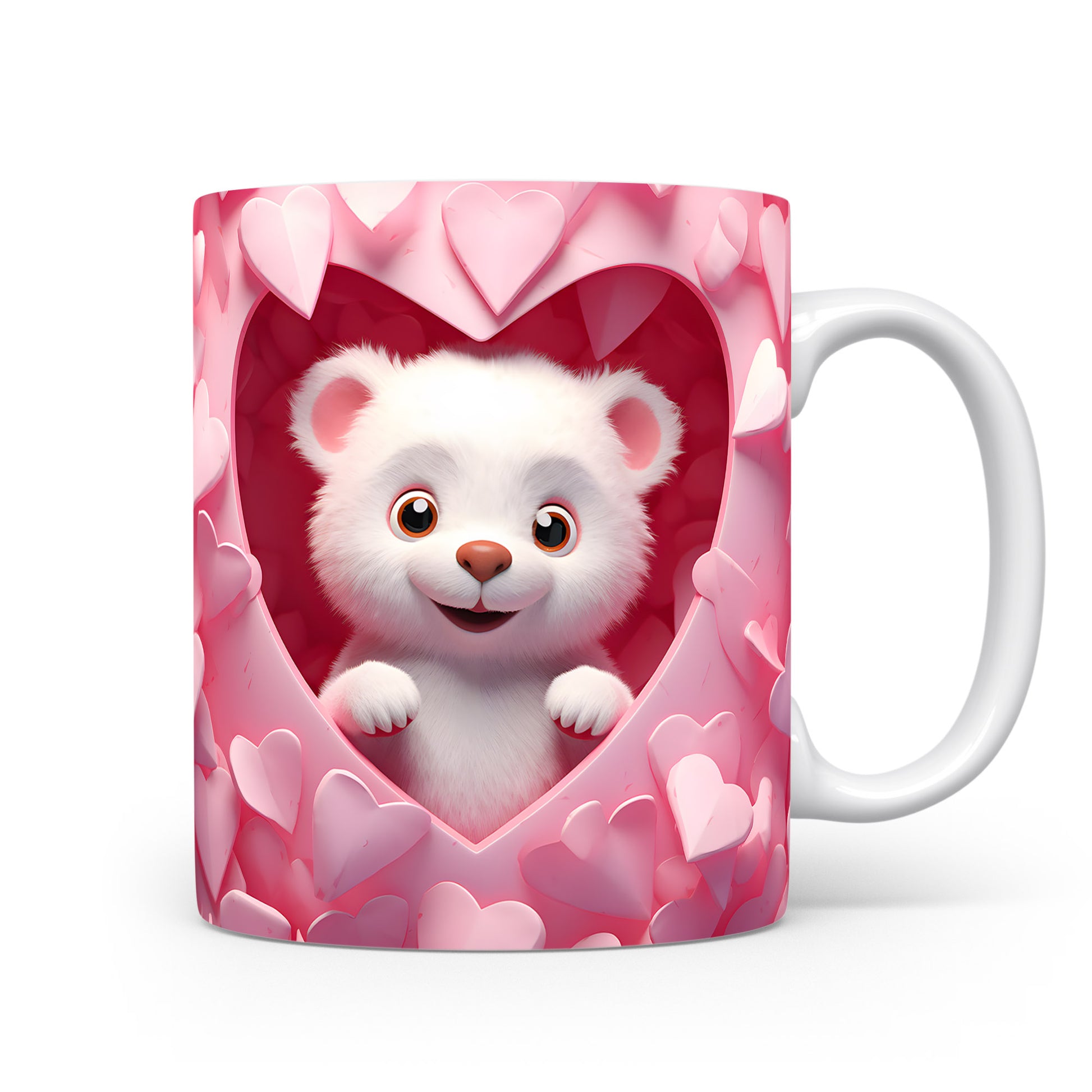Roztomilý hrnek s bílým medvídkem obklopeným růžovými srdci zahřeje každé ráno. Přináší nádech něžnosti a radosti do vašeho dne. Ideální dárek pro milovníky roztomilých motivů.