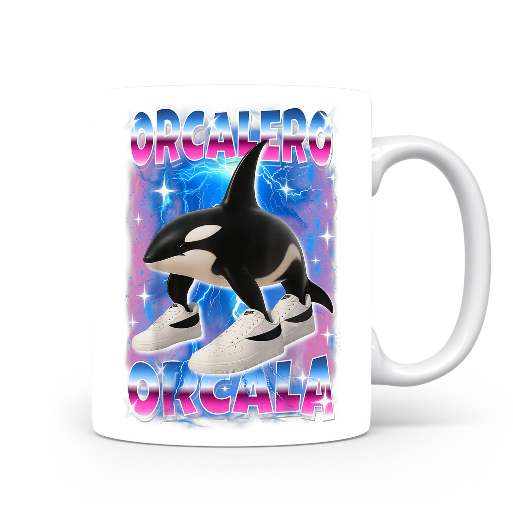 Design inspirovaný italským brainrotem: Orcamero Circala — kosatka. Lesklý keramický hrnek 330 ml.