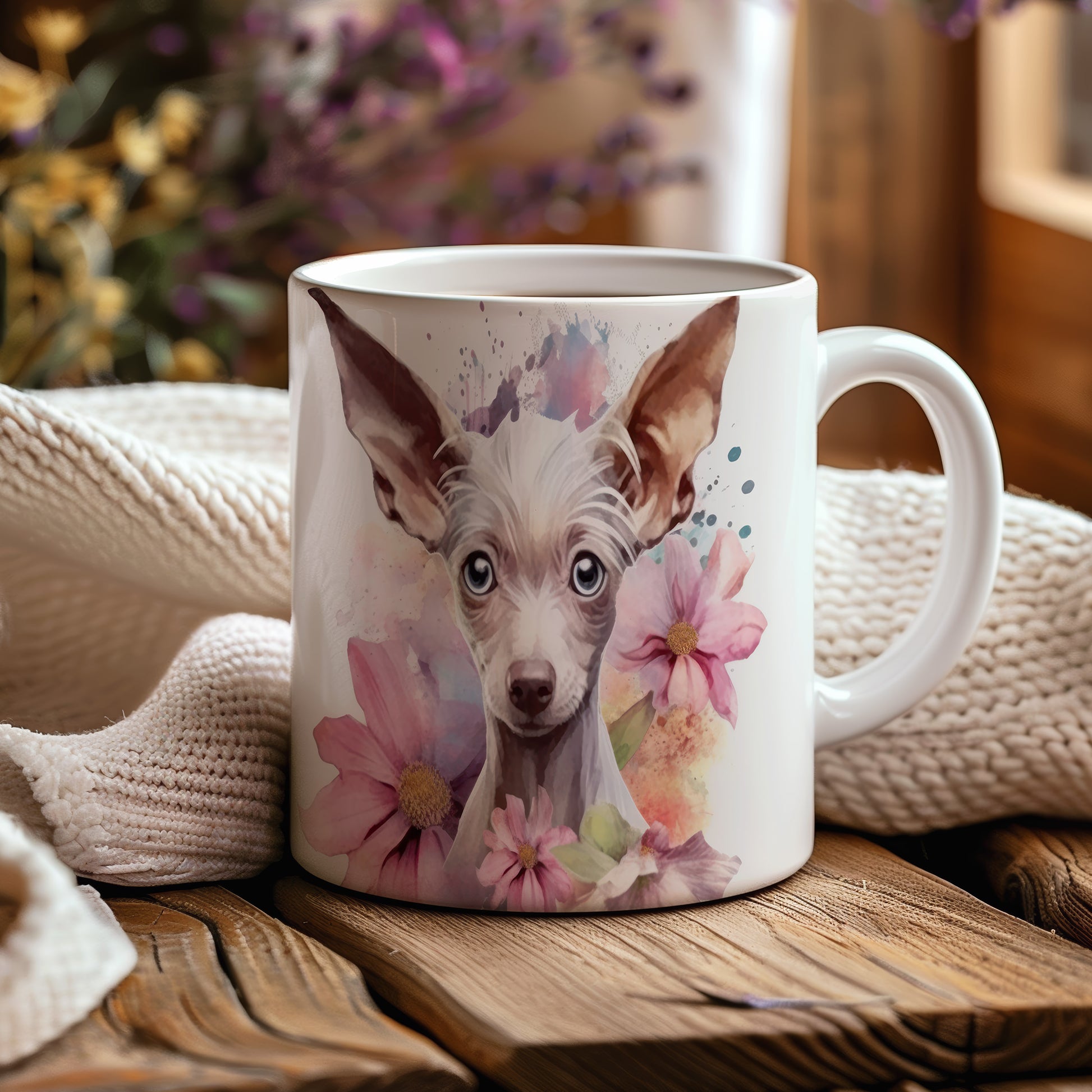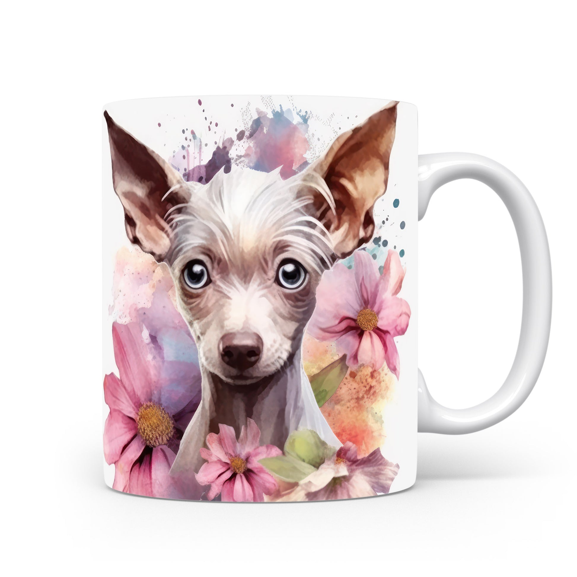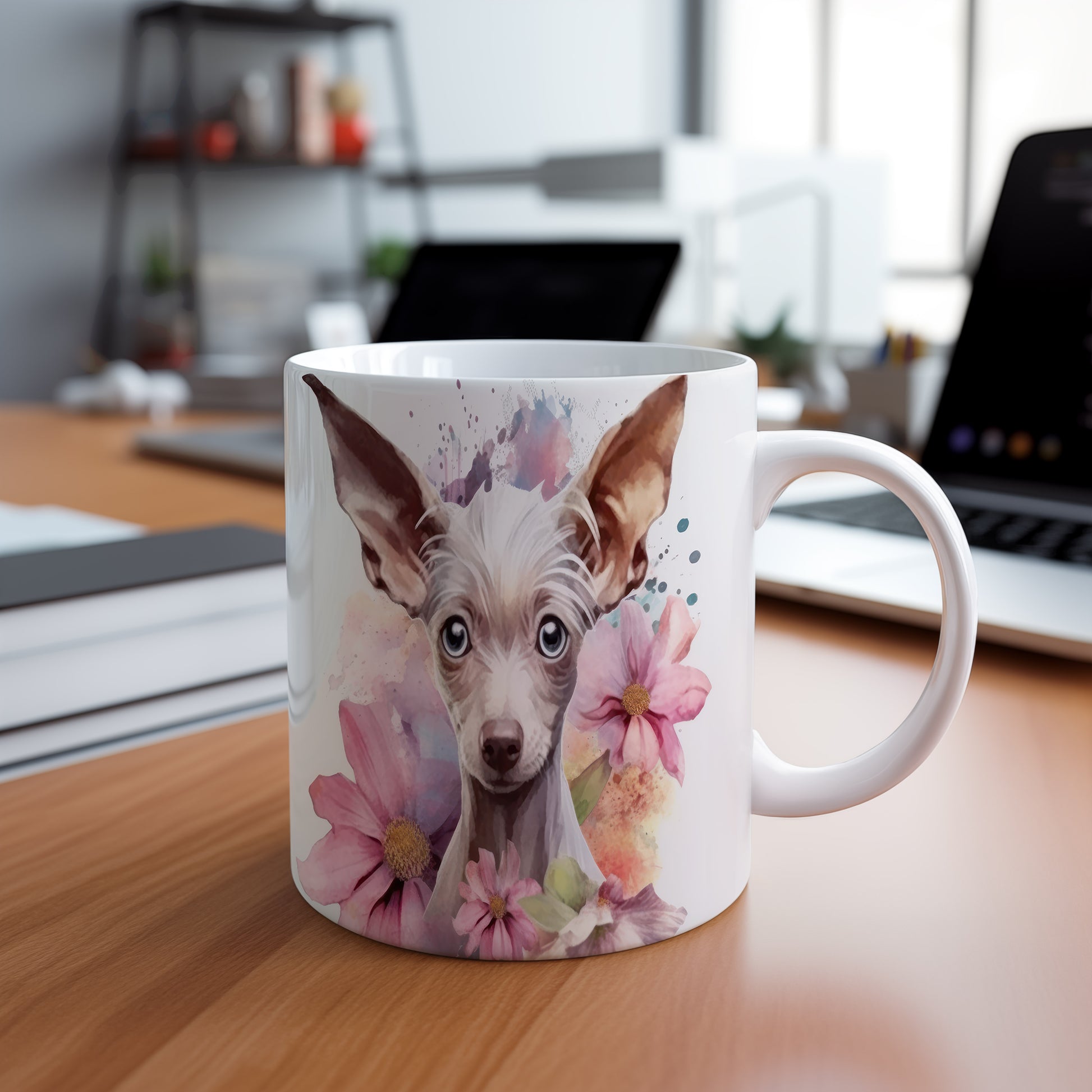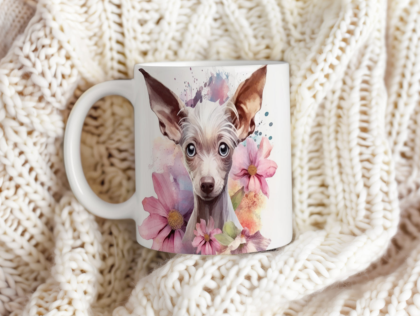 Hrnek s portrétem čínského chocholatého psa a květinovým motivem
