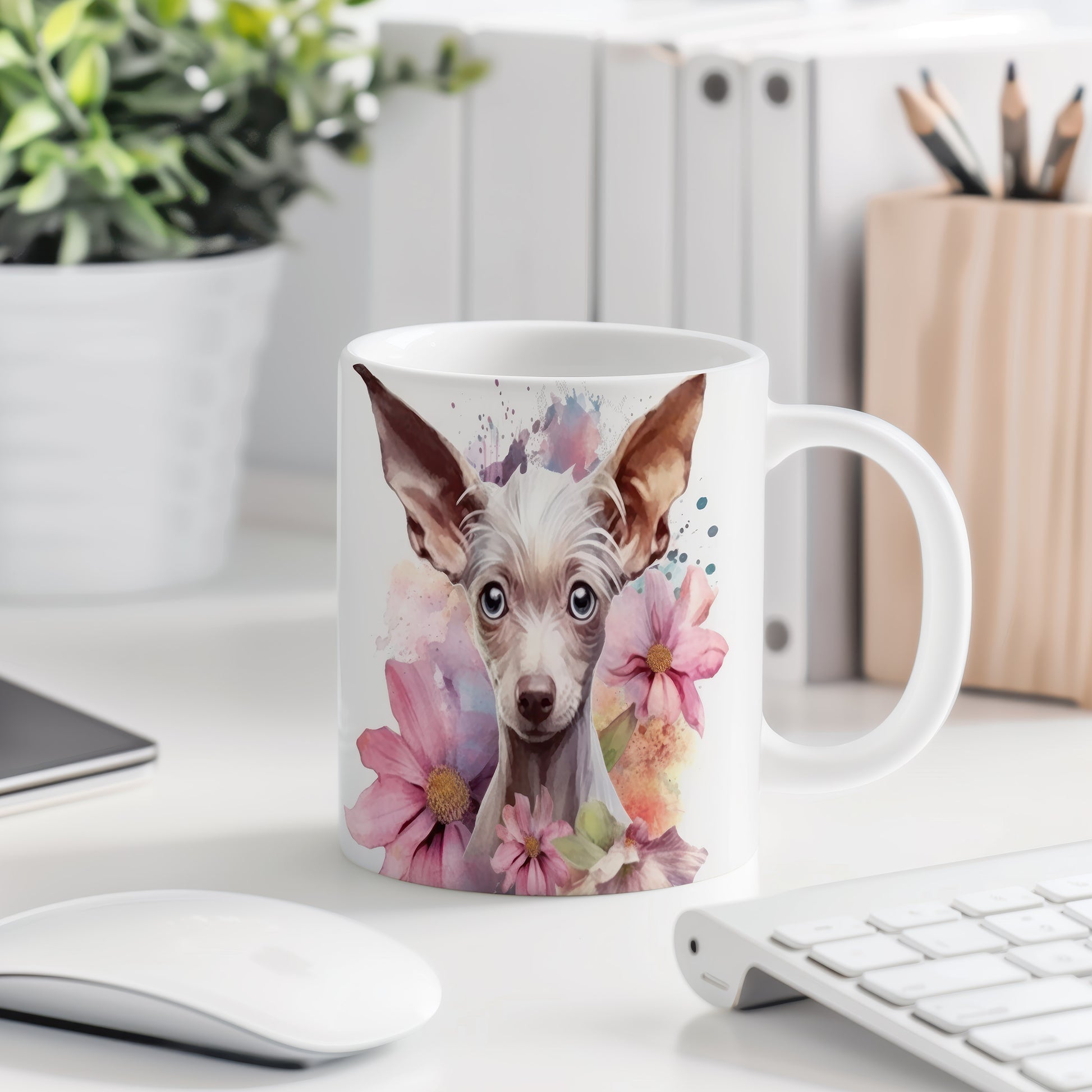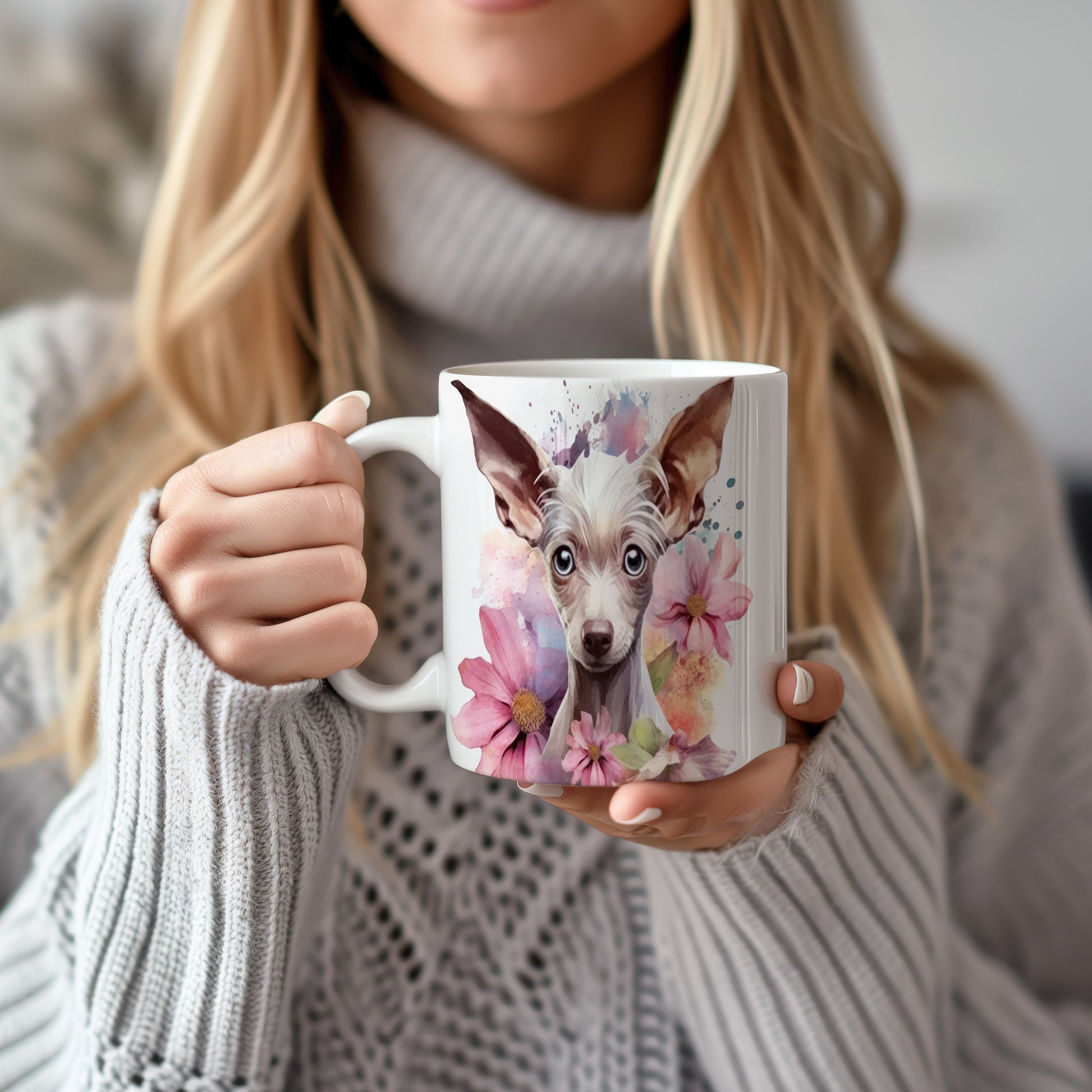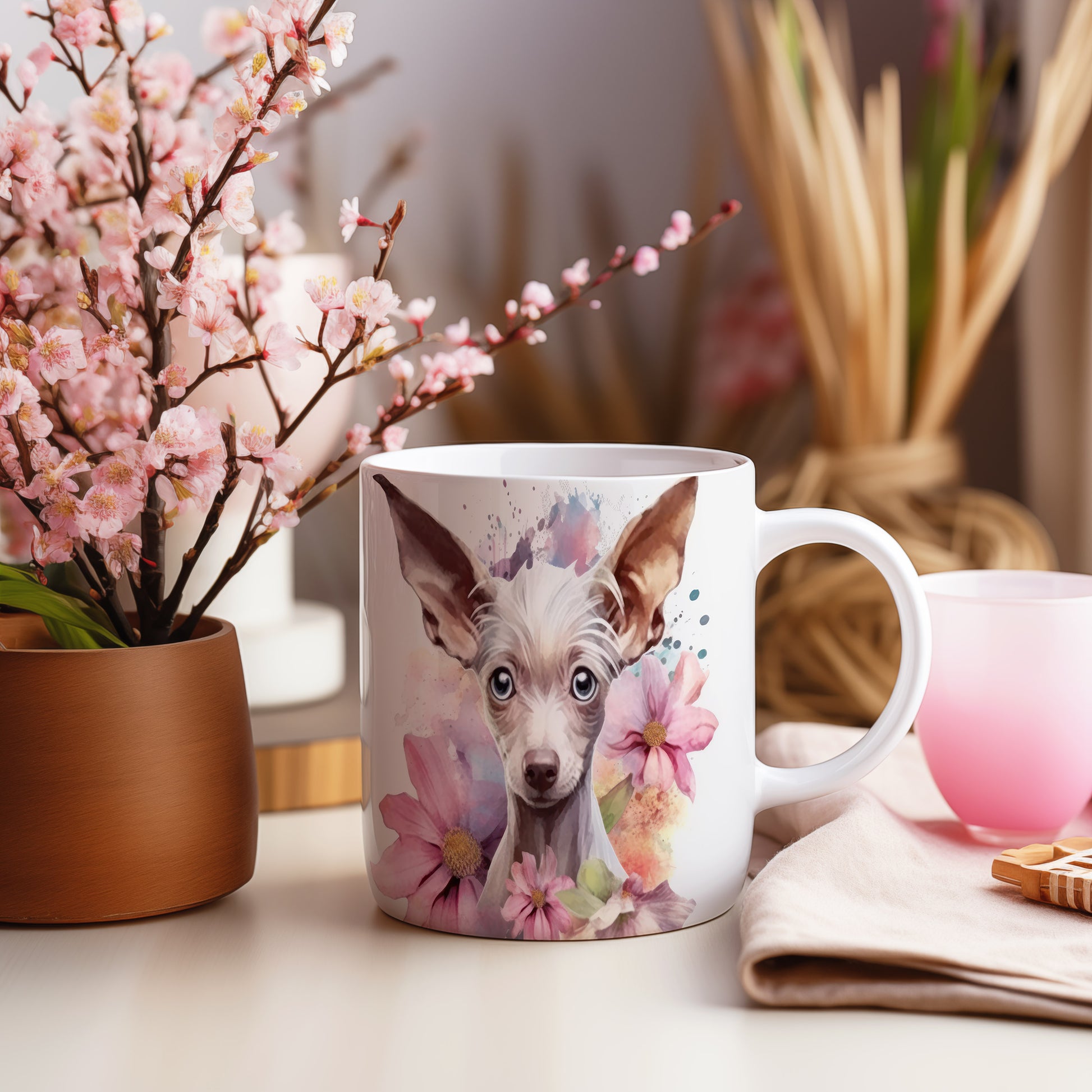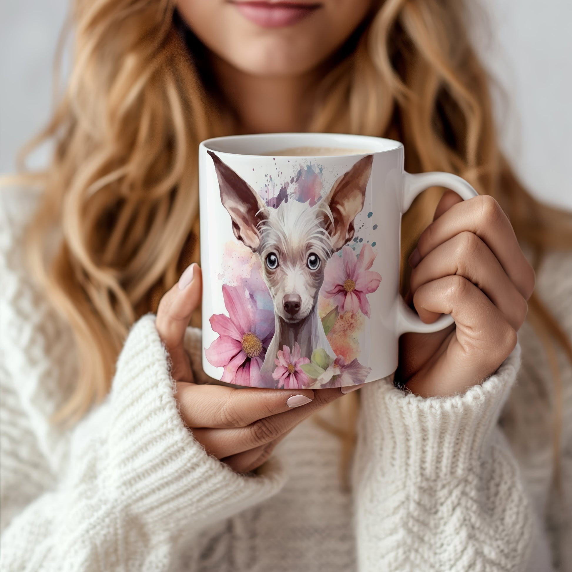 Hrnek s portrétem čínského chocholatého psa a květinovým motivem