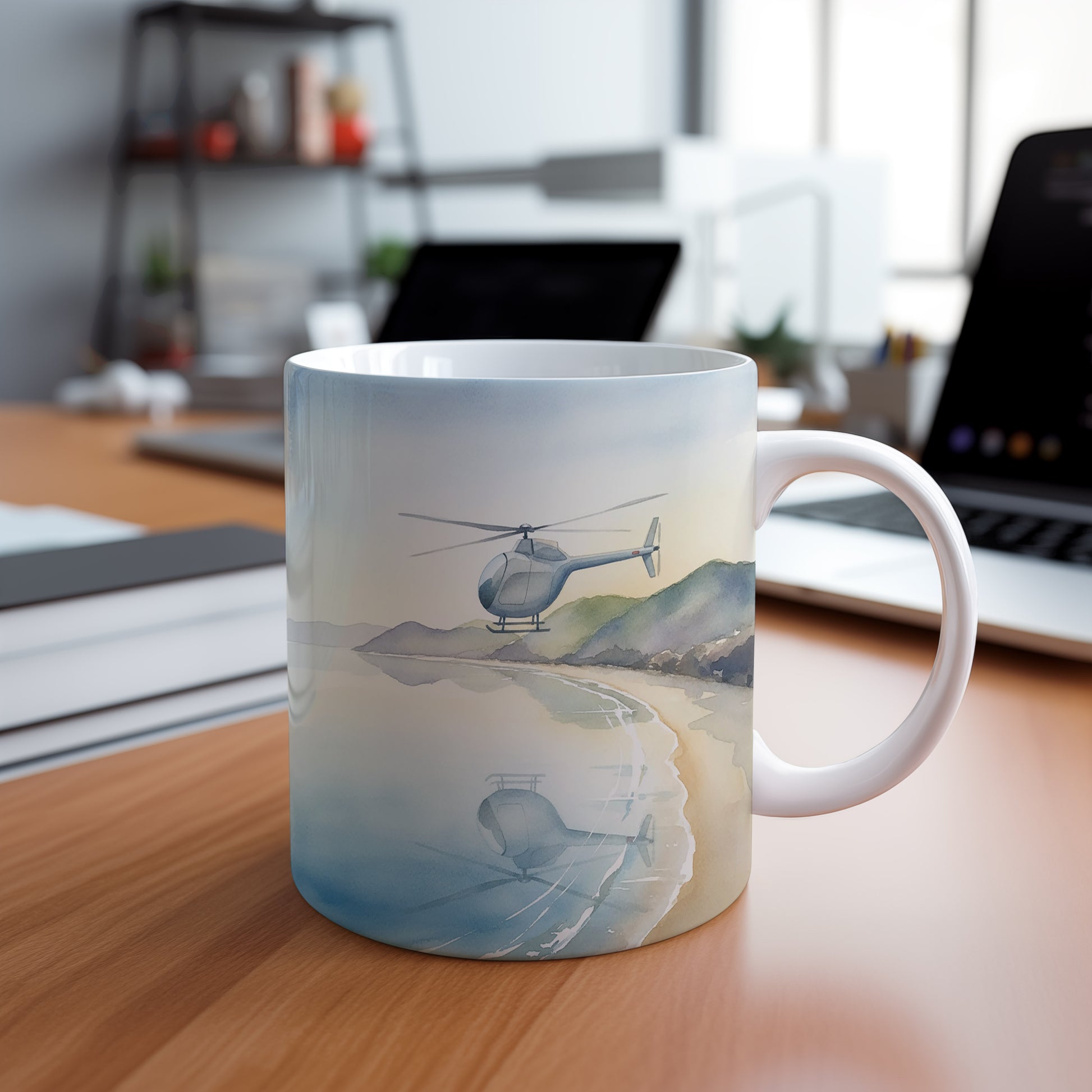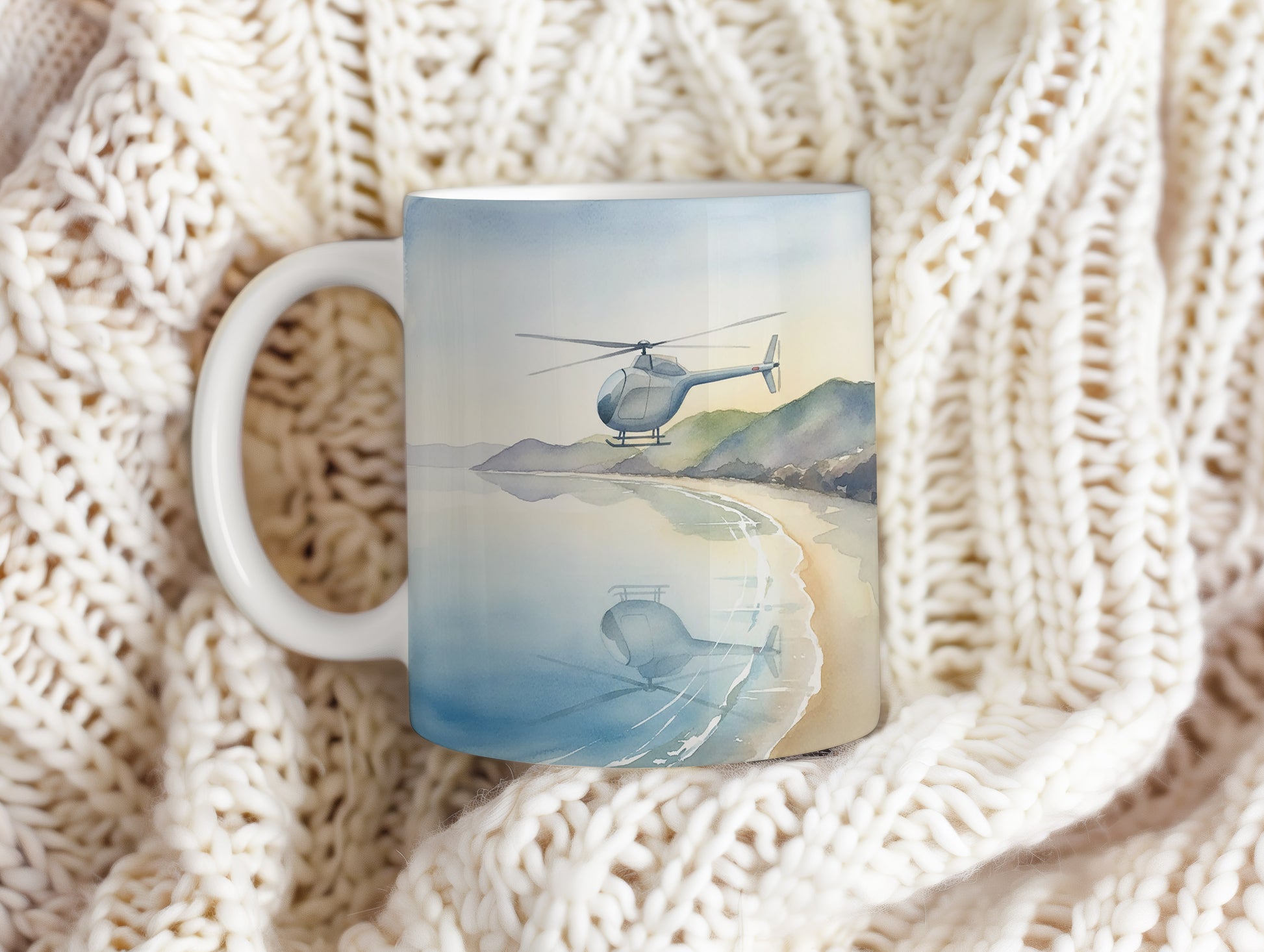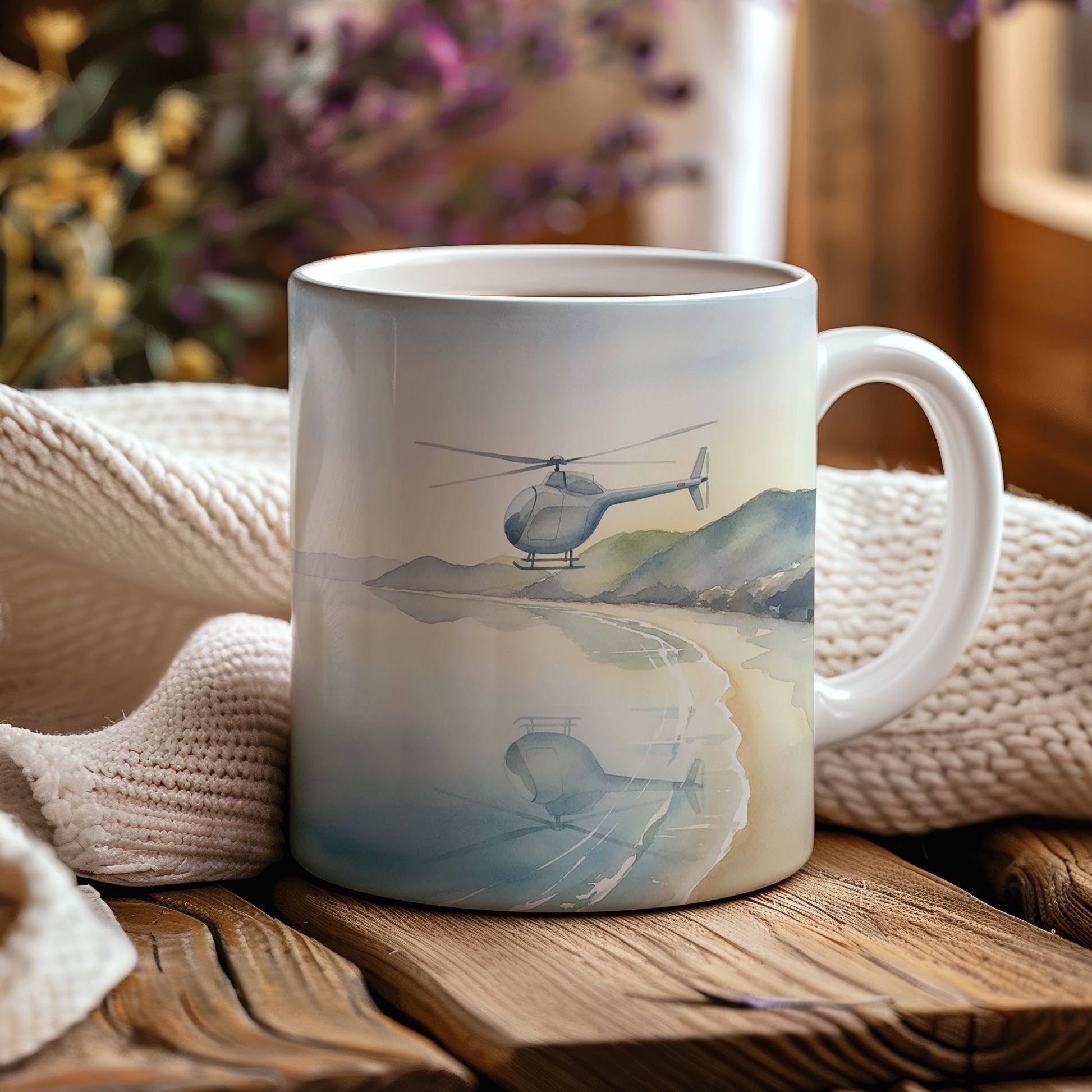 Hrnek s akvarelovou helikoptérou nad pobřežím