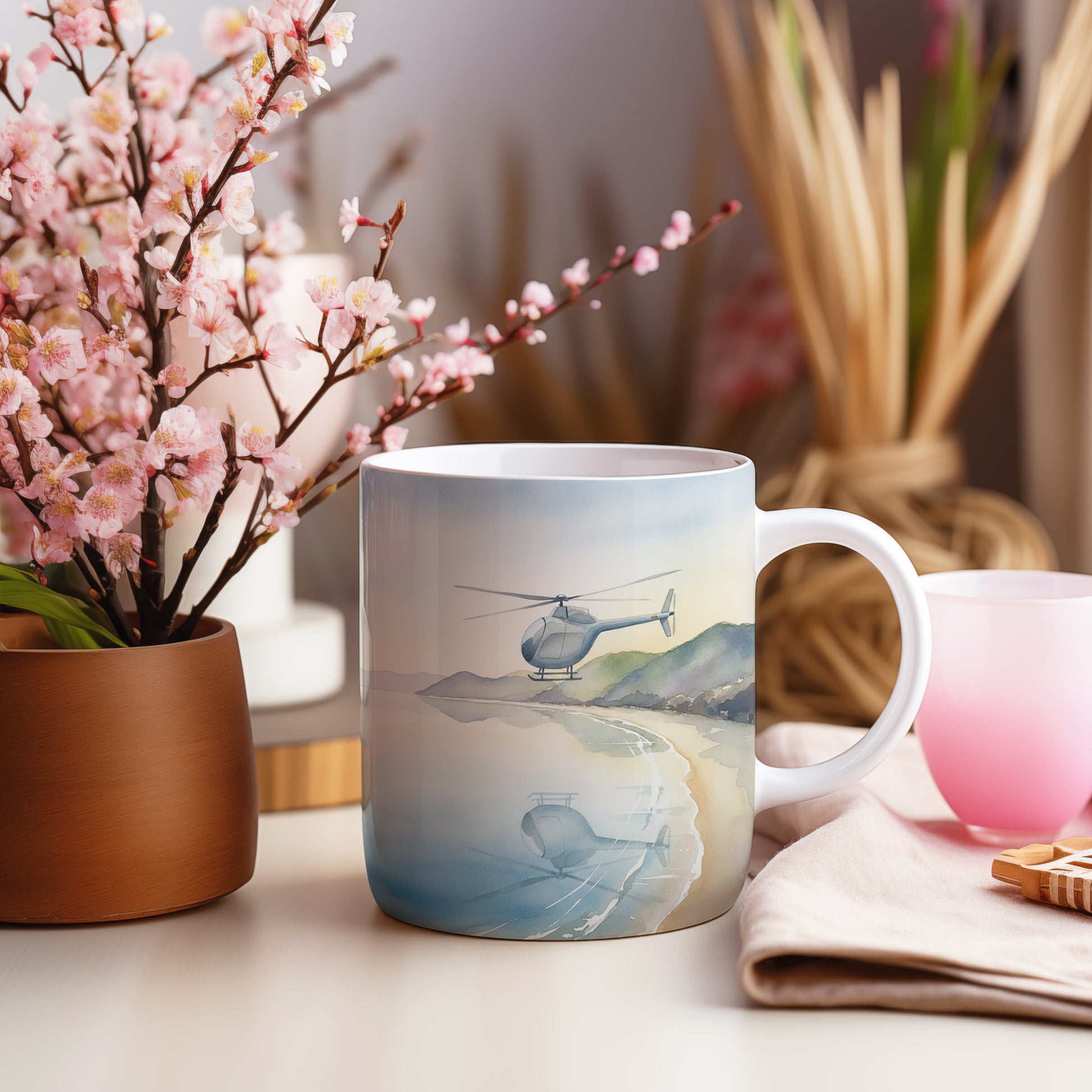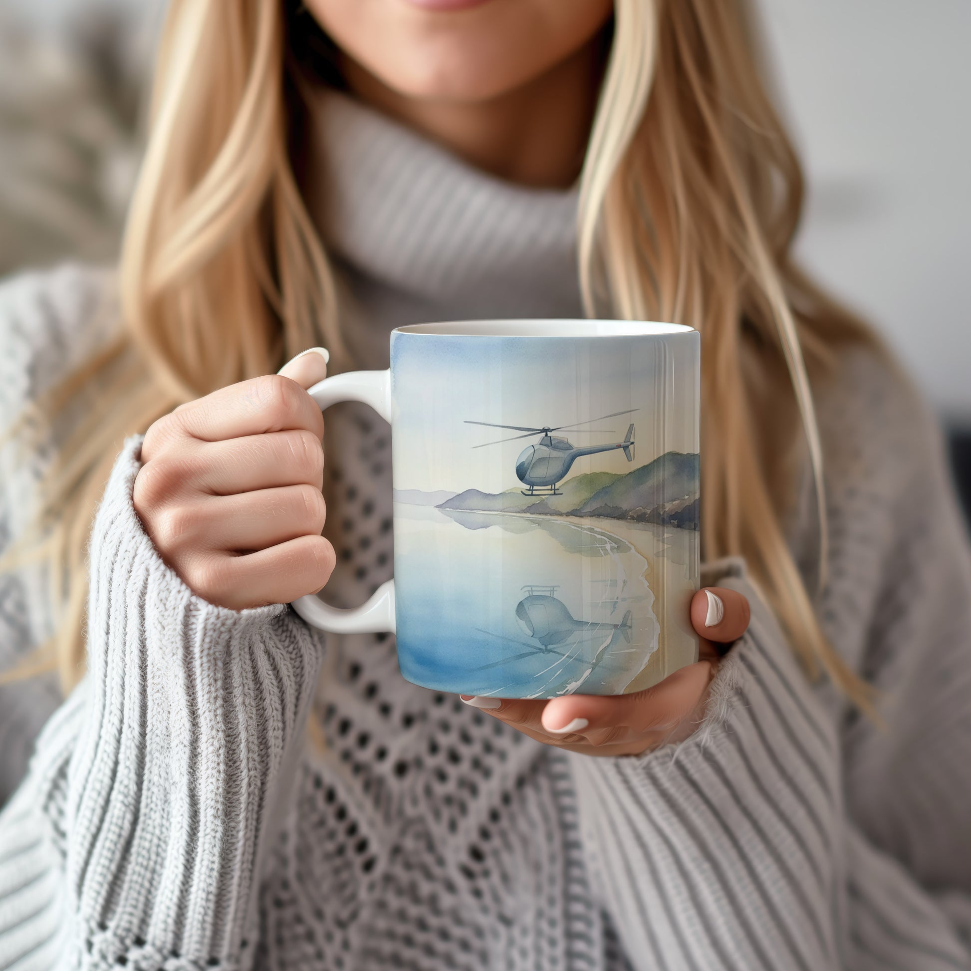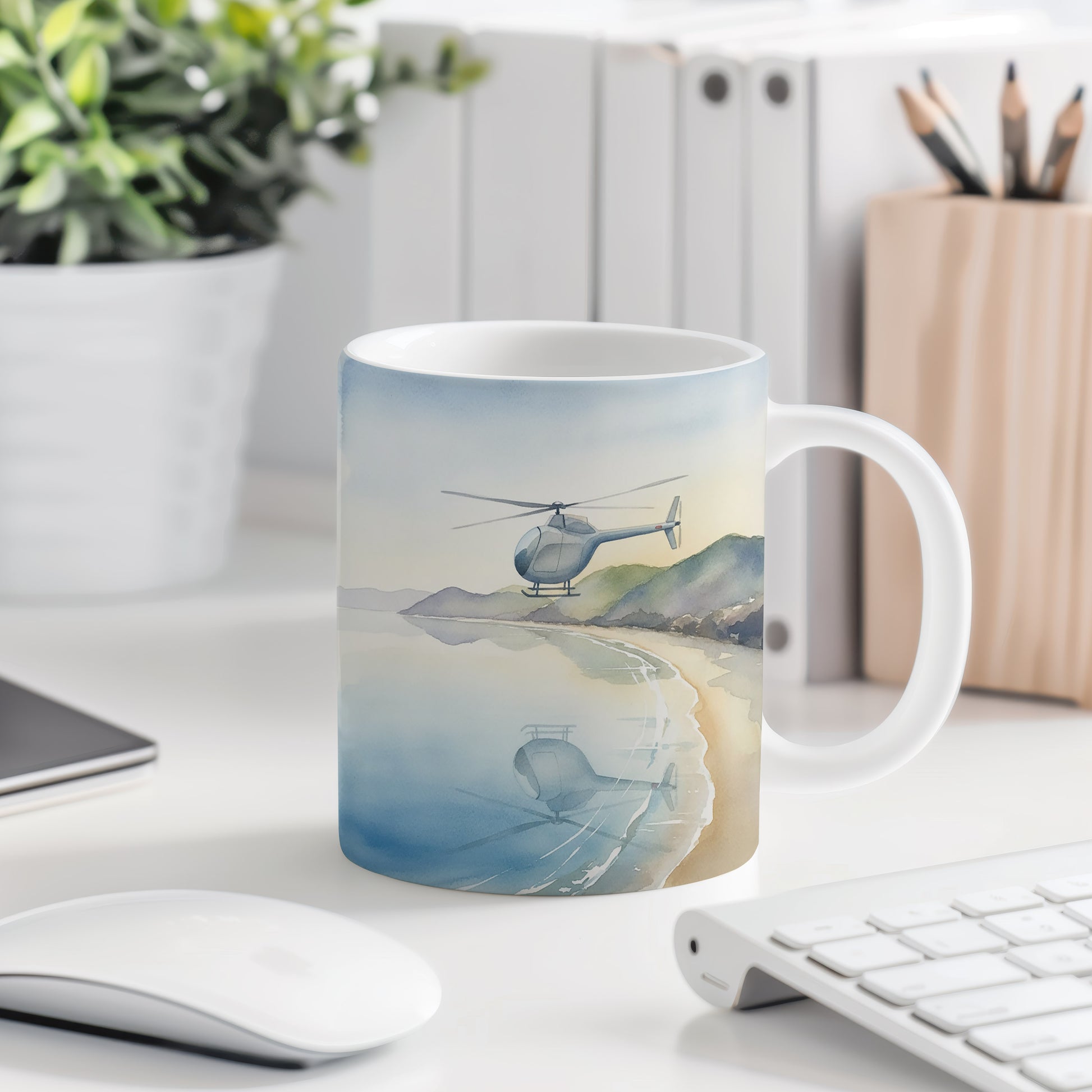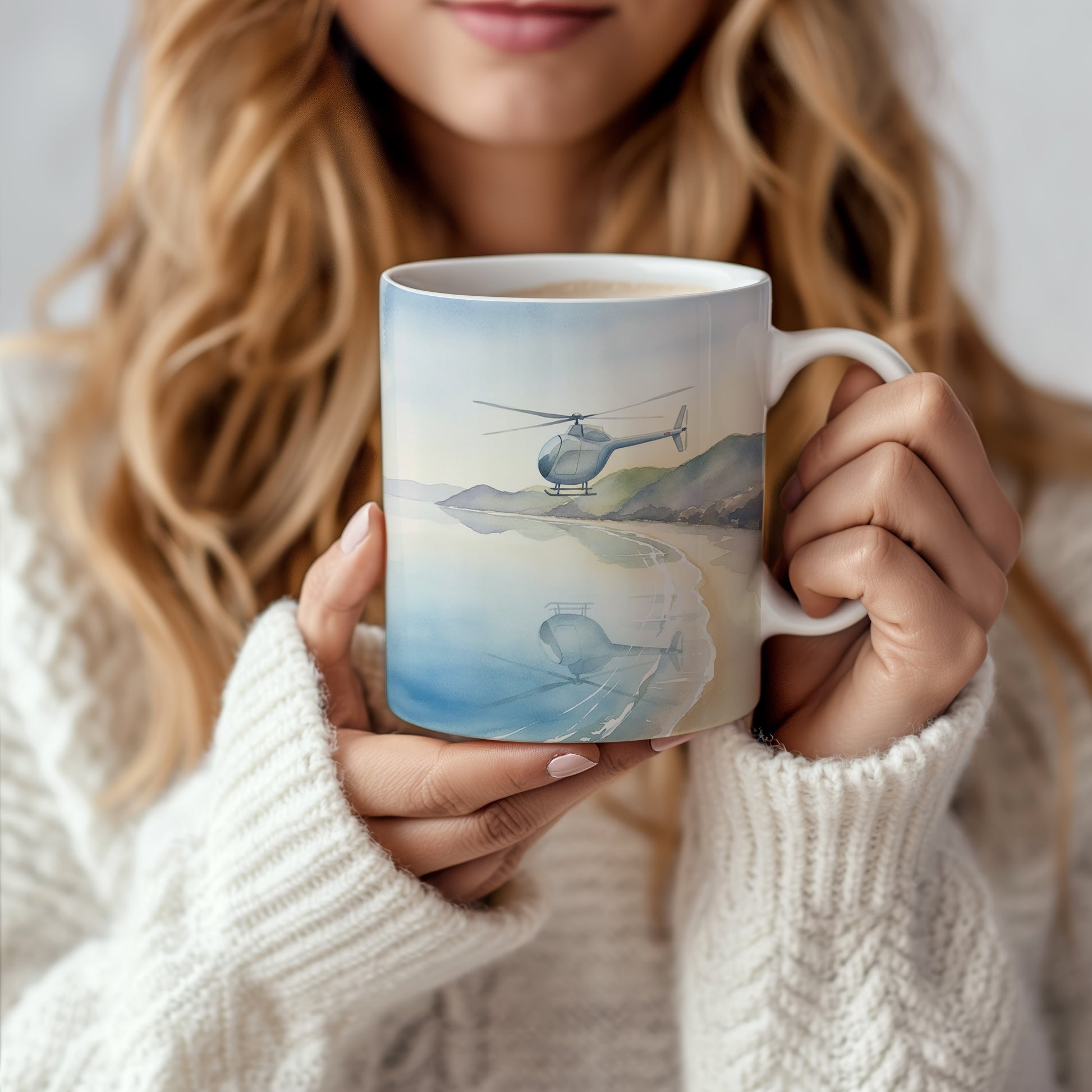 Hrnek s akvarelovou helikoptérou nad pobřežím