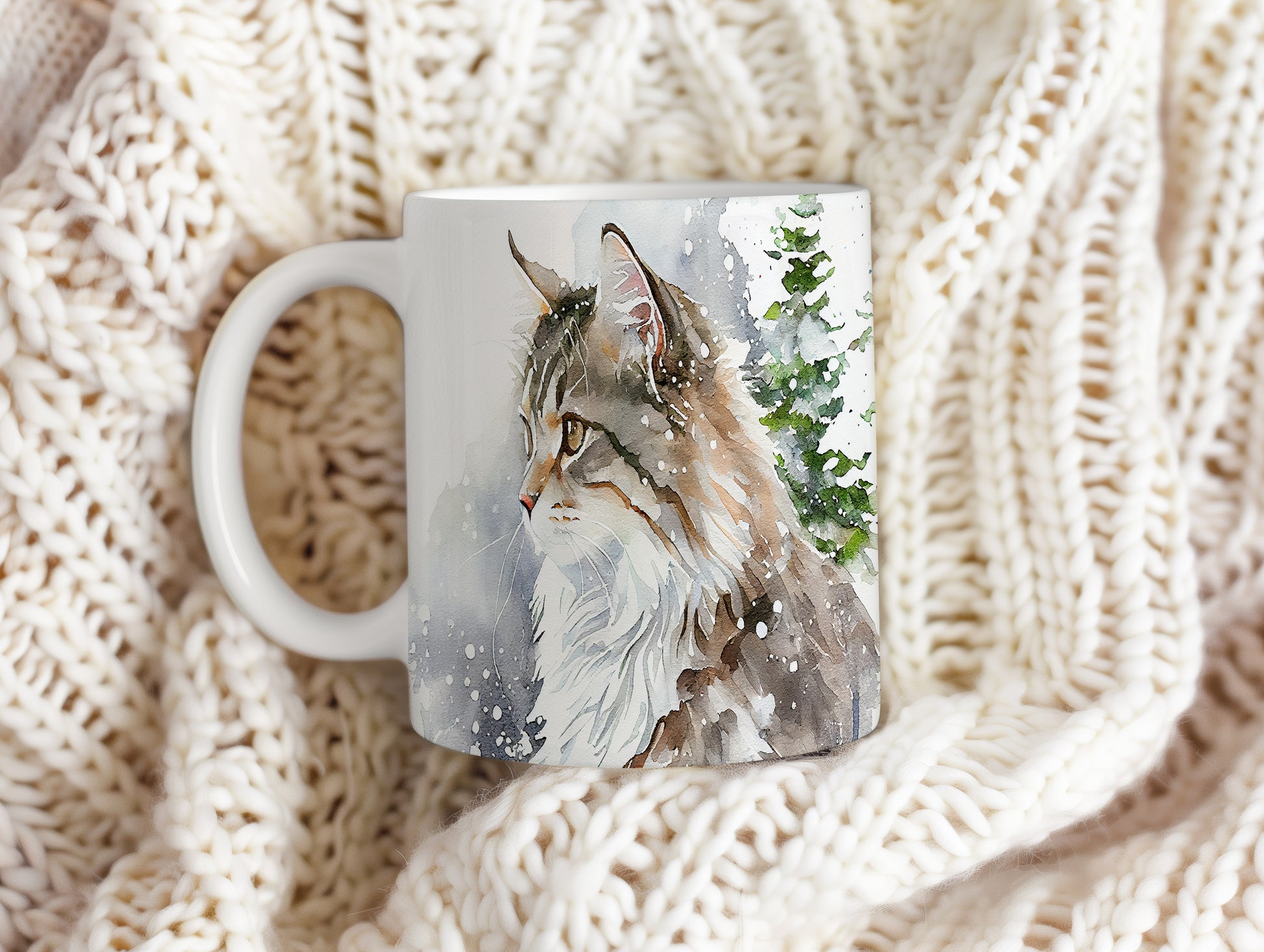 Hrnek s akvarelovou kočkou v zasněžené krajině