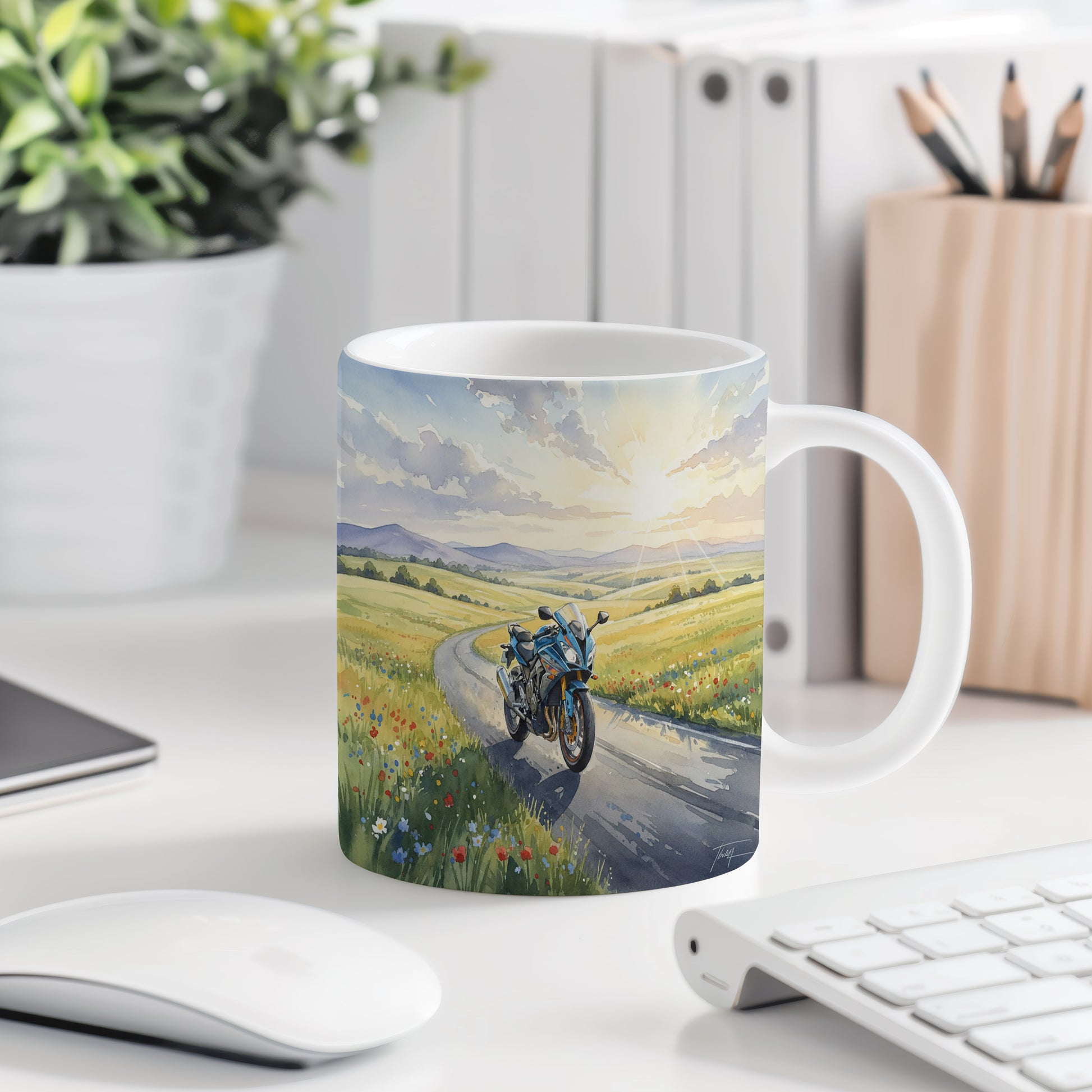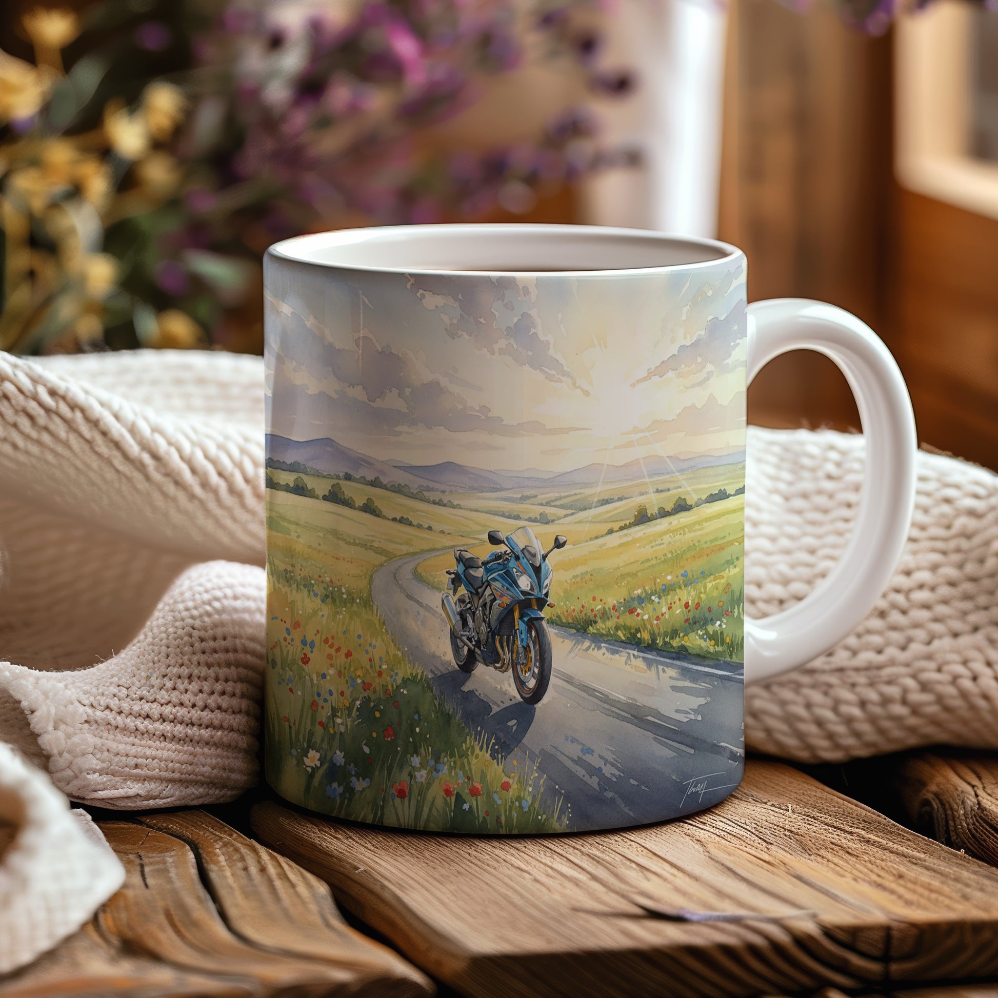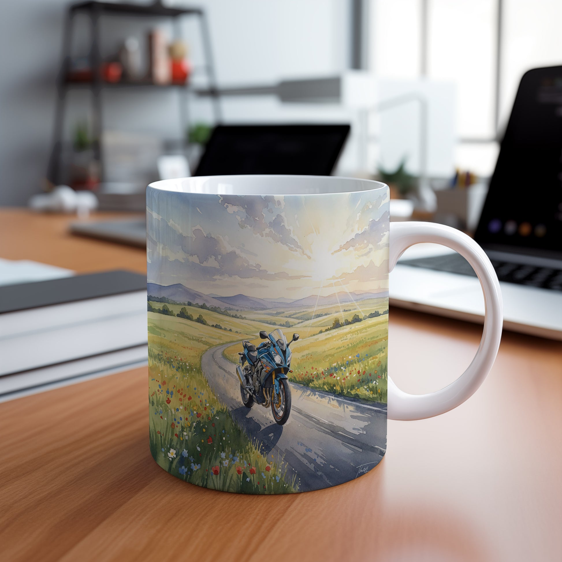 Objevte kouzlo jízdy s hrnkem, na kterém je akvarelová motorka projíždějící malebnou venkovskou krajinou. Hrnek 330 ml – vhodný do myčky i mikrovlnky.