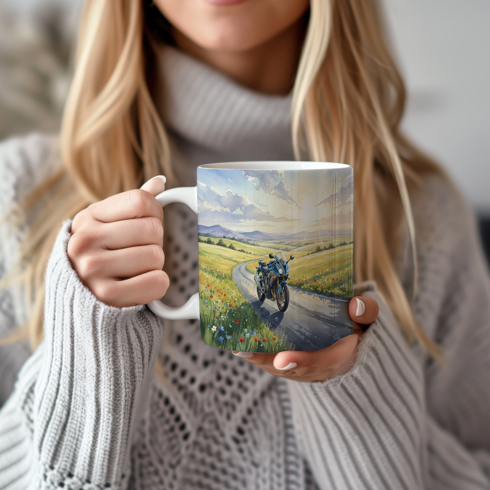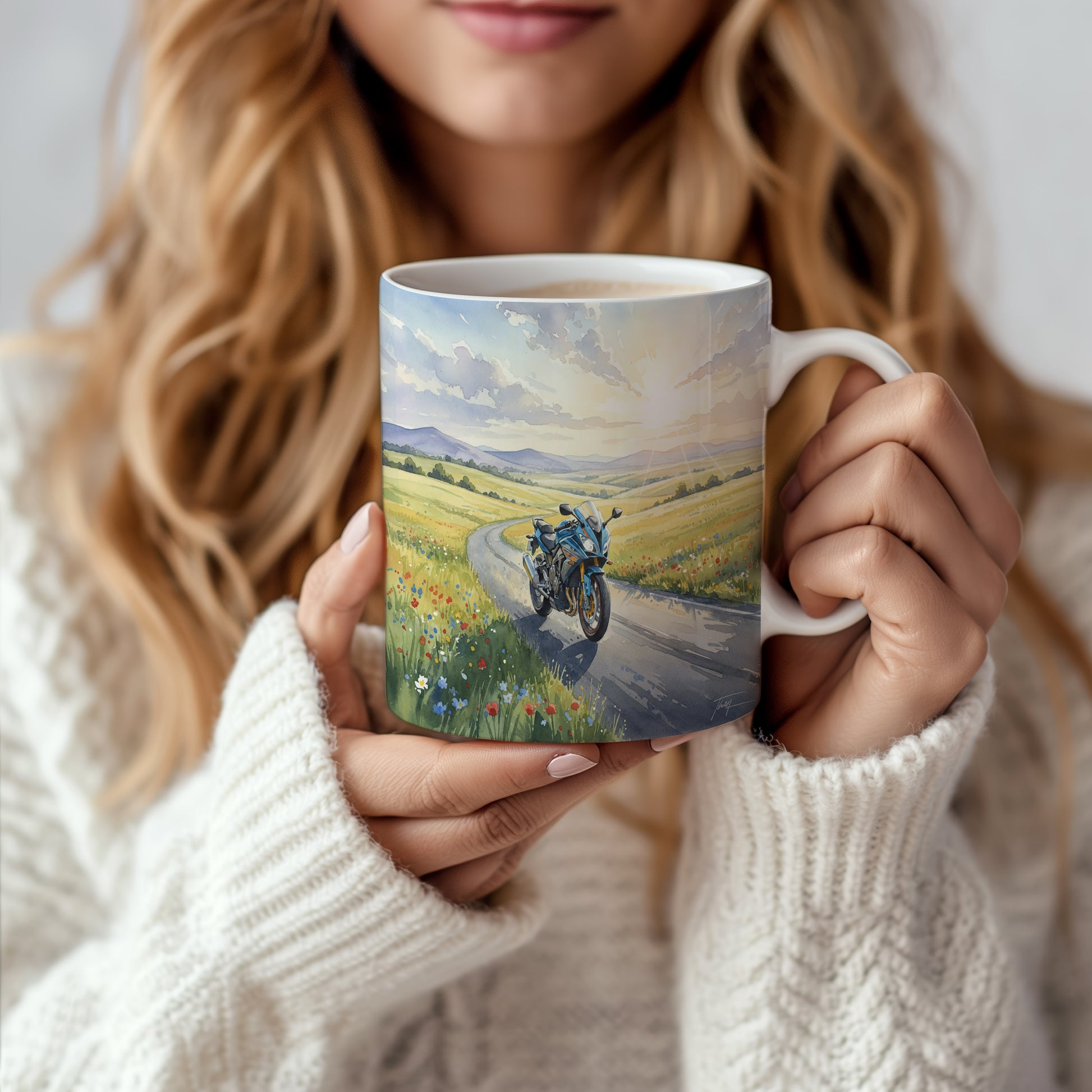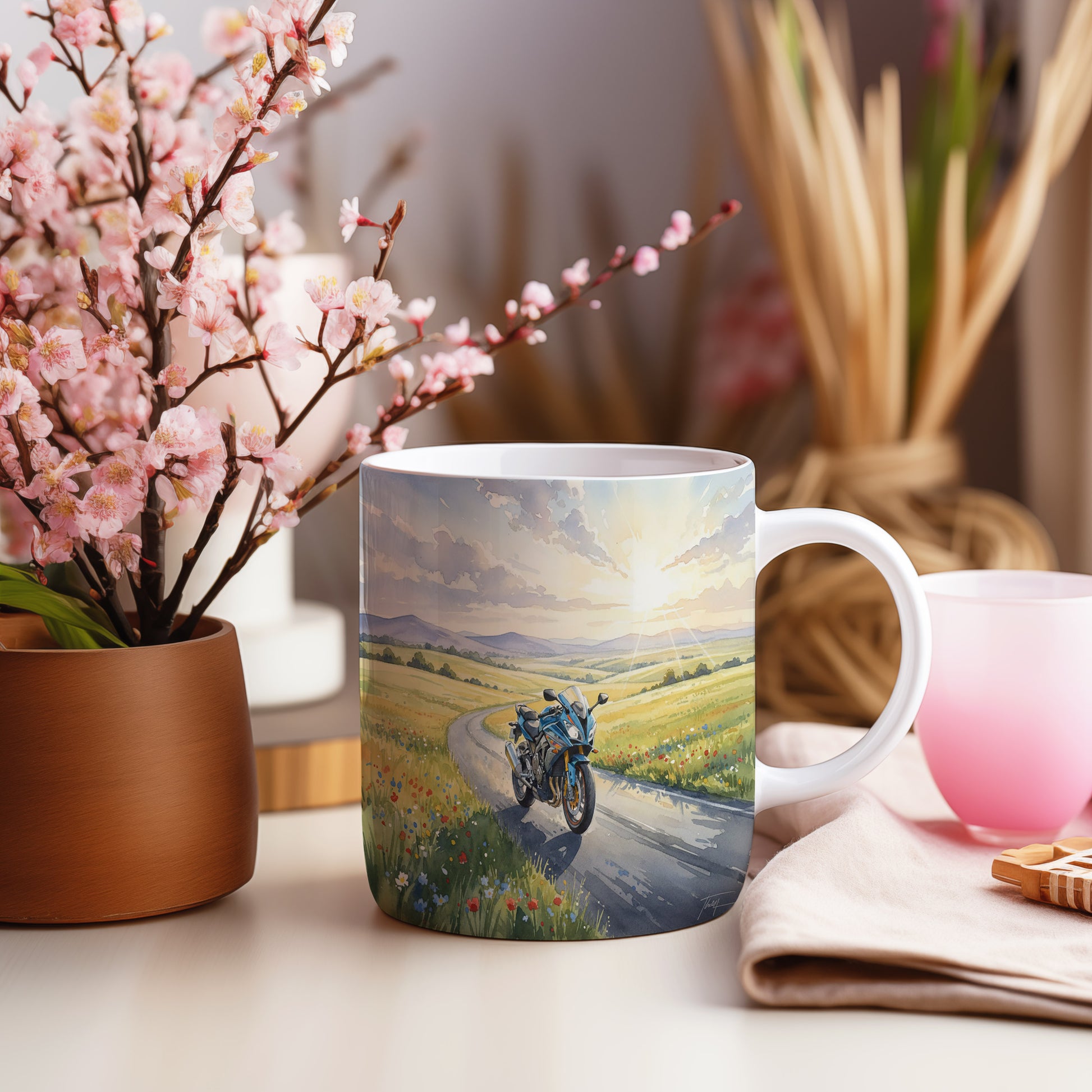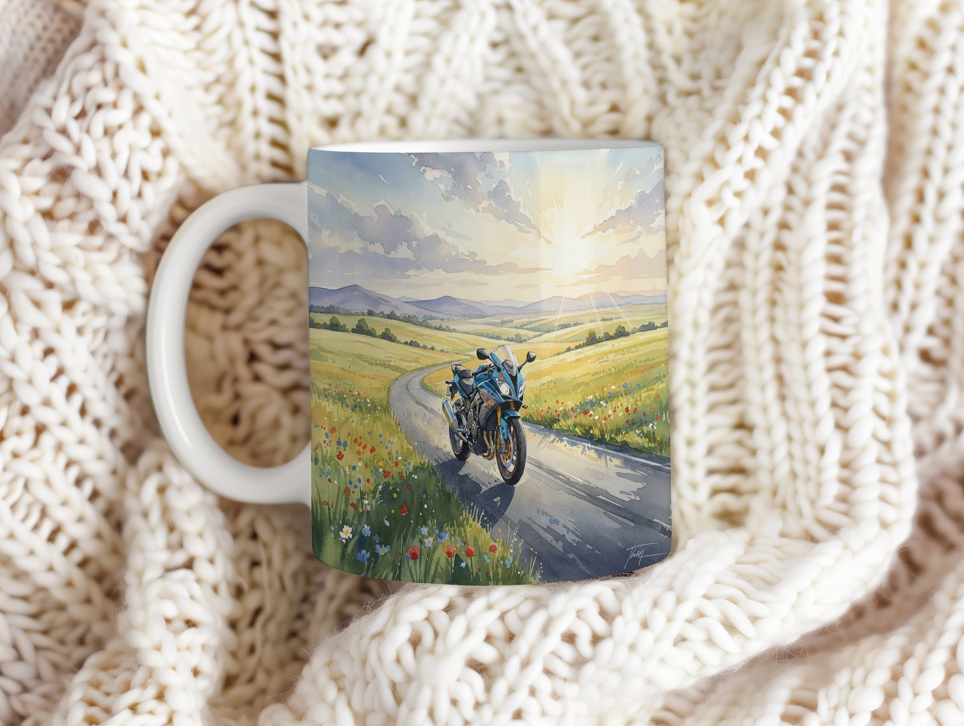 Objevte kouzlo jízdy s hrnkem, na kterém je akvarelová motorka projíždějící malebnou venkovskou krajinou. Hrnek 330 ml – vhodný do myčky i mikrovlnky.