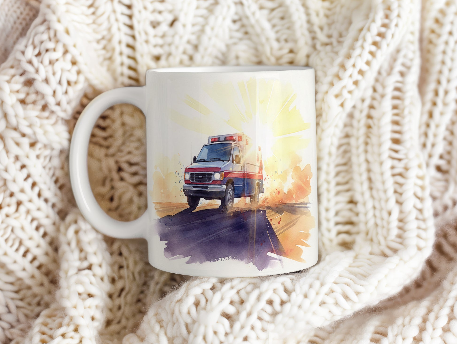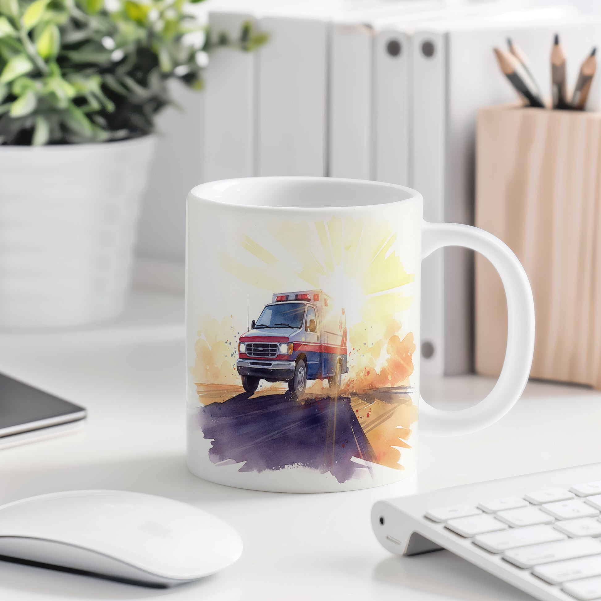 Objevte dynamiku a energii akvarelové sanitky projíždějící krajinou při západu slunce. Ideální dárek pro milovníky rychlé jízdy. Hrnek 330 ml – vhodný do myčky i mikrovlnky.
