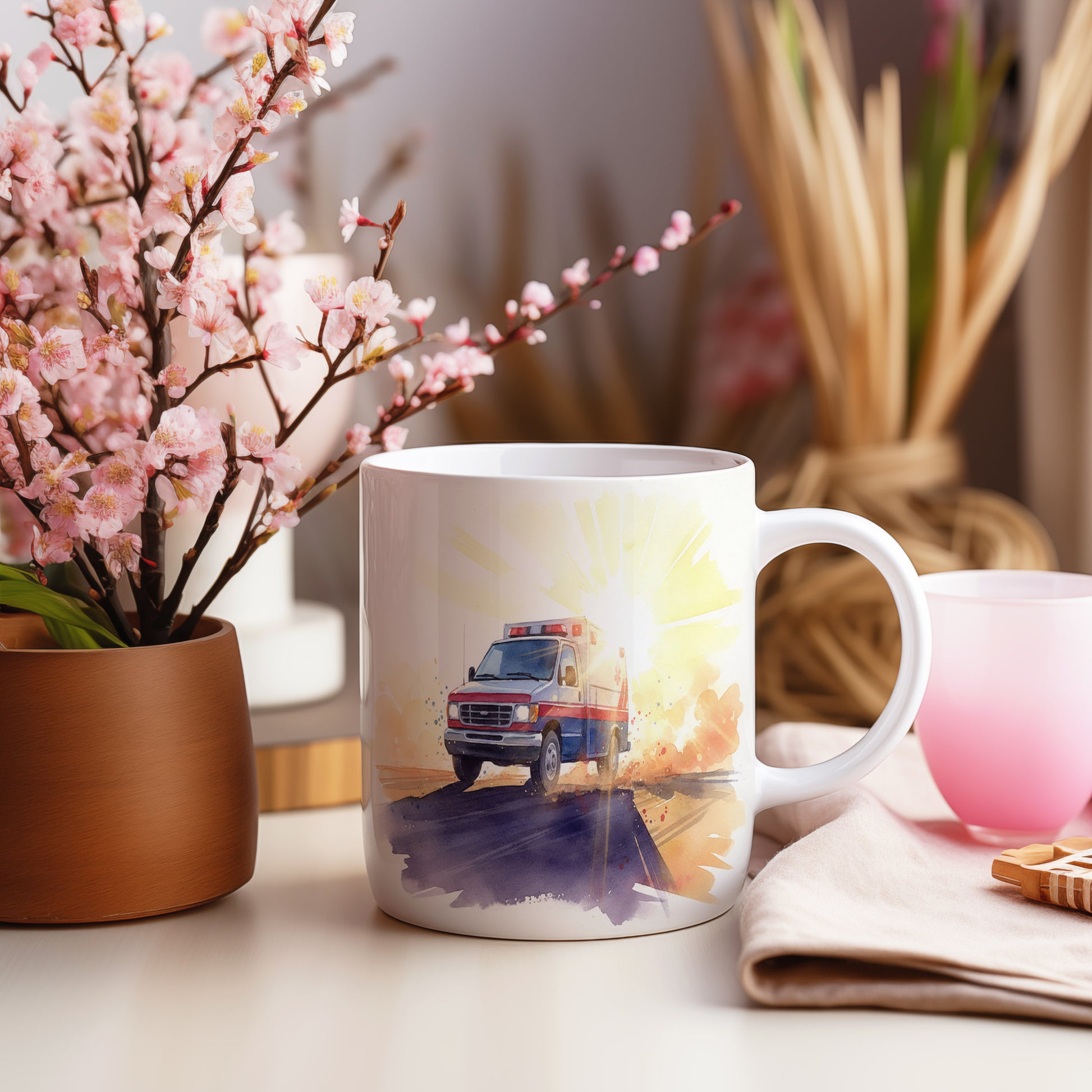 Hrnek s akvarelovou sanitkou při západu slunce