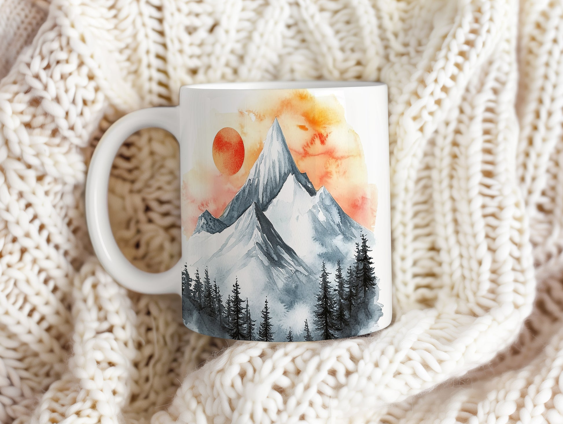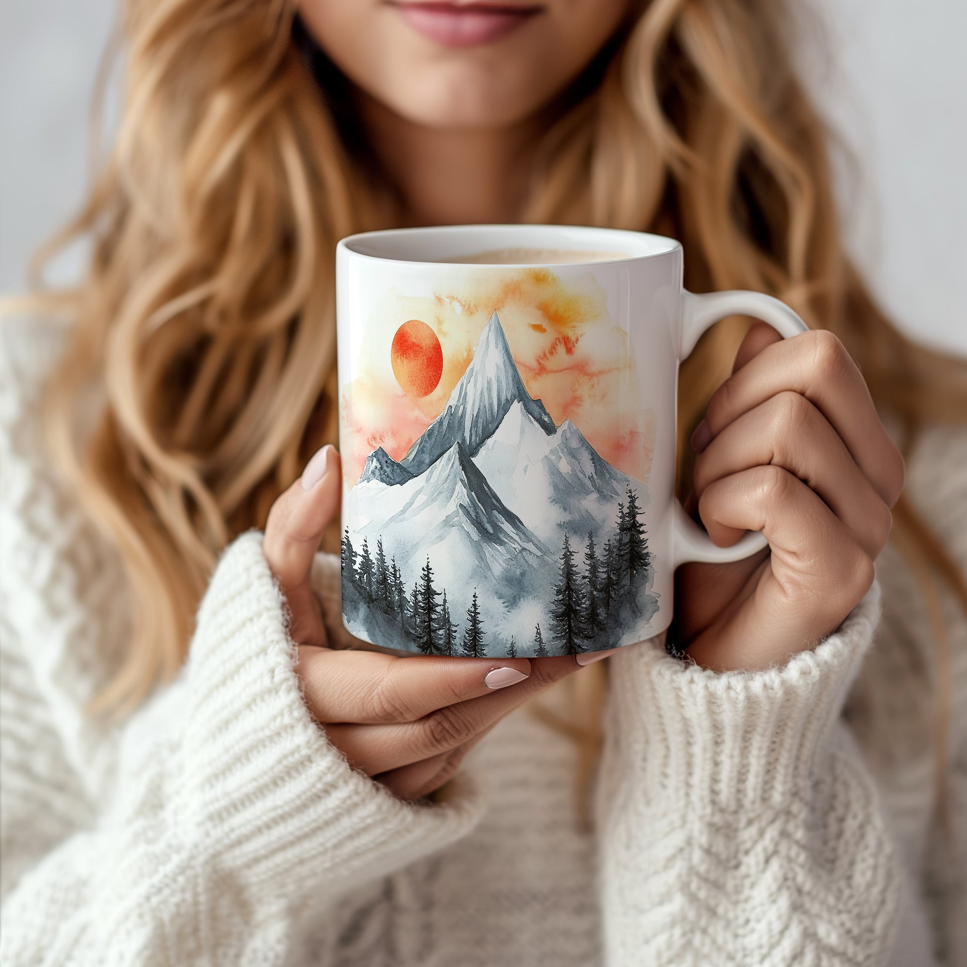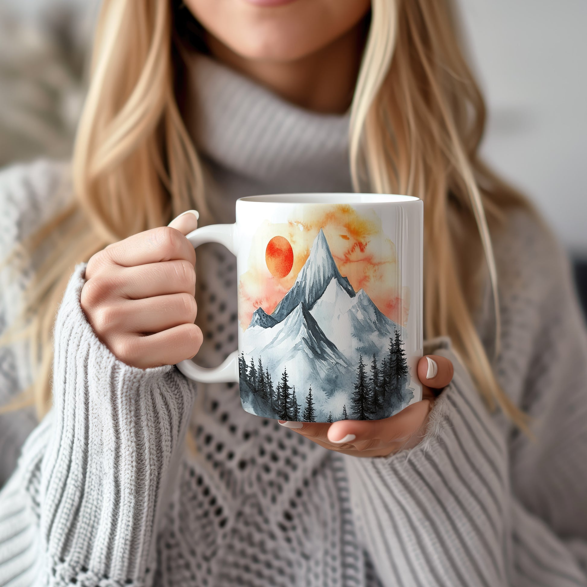 Hrnek s akvarelovými horami v oranžových a šedých tónech