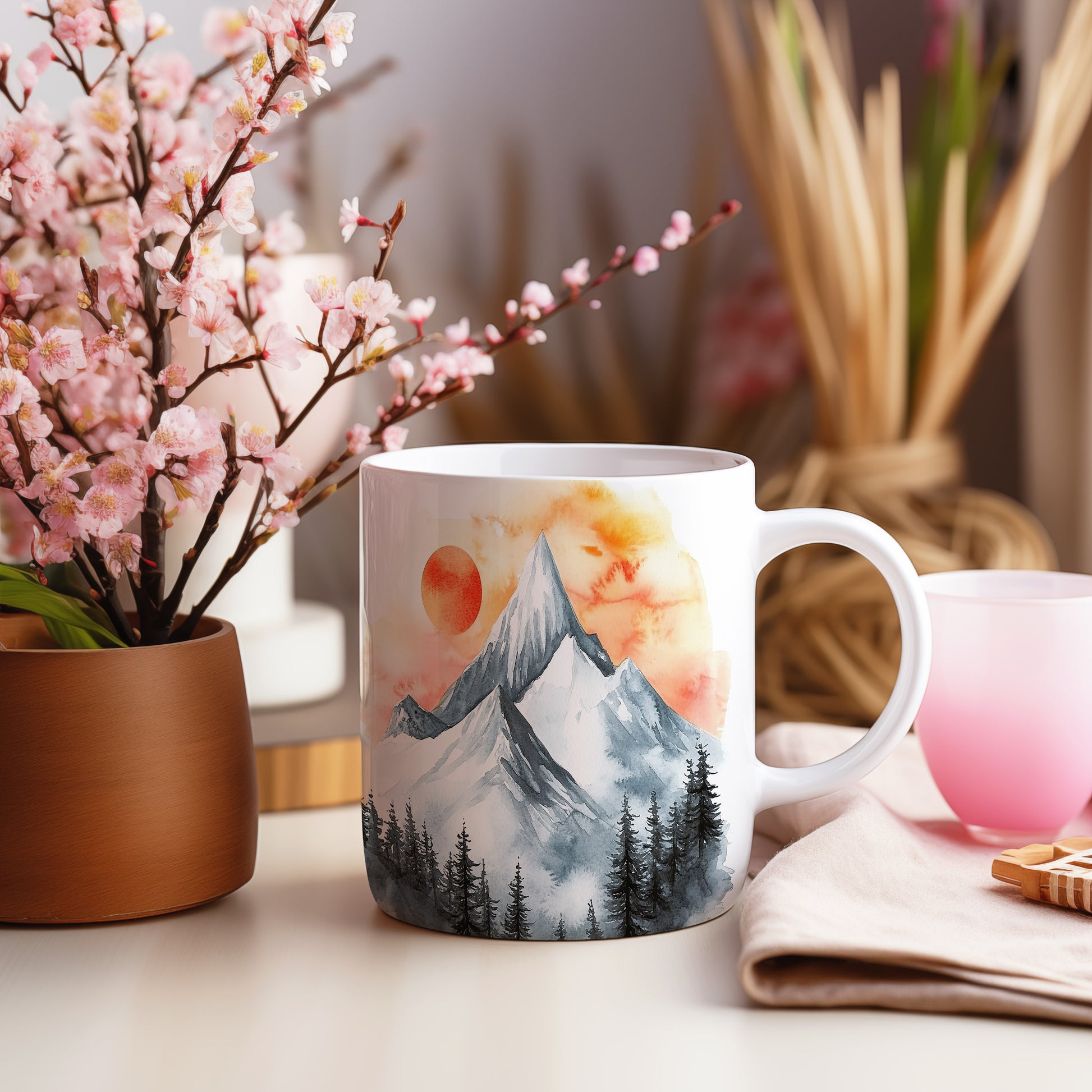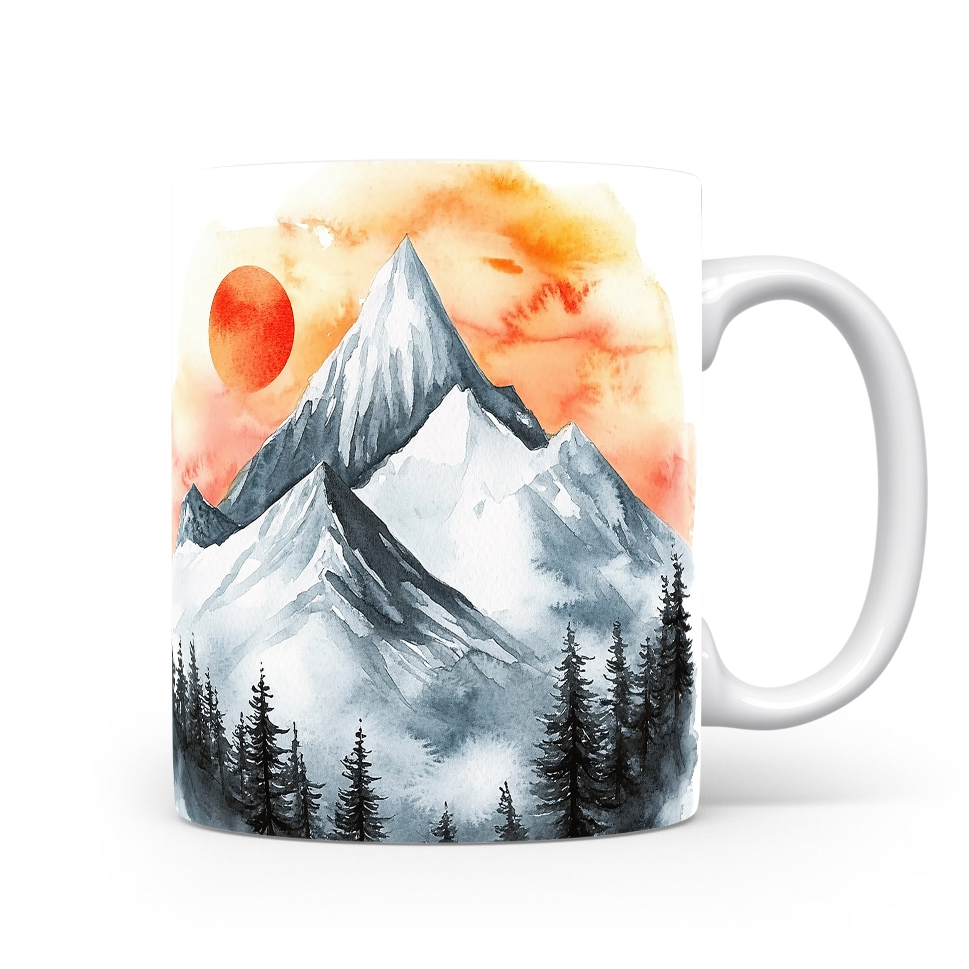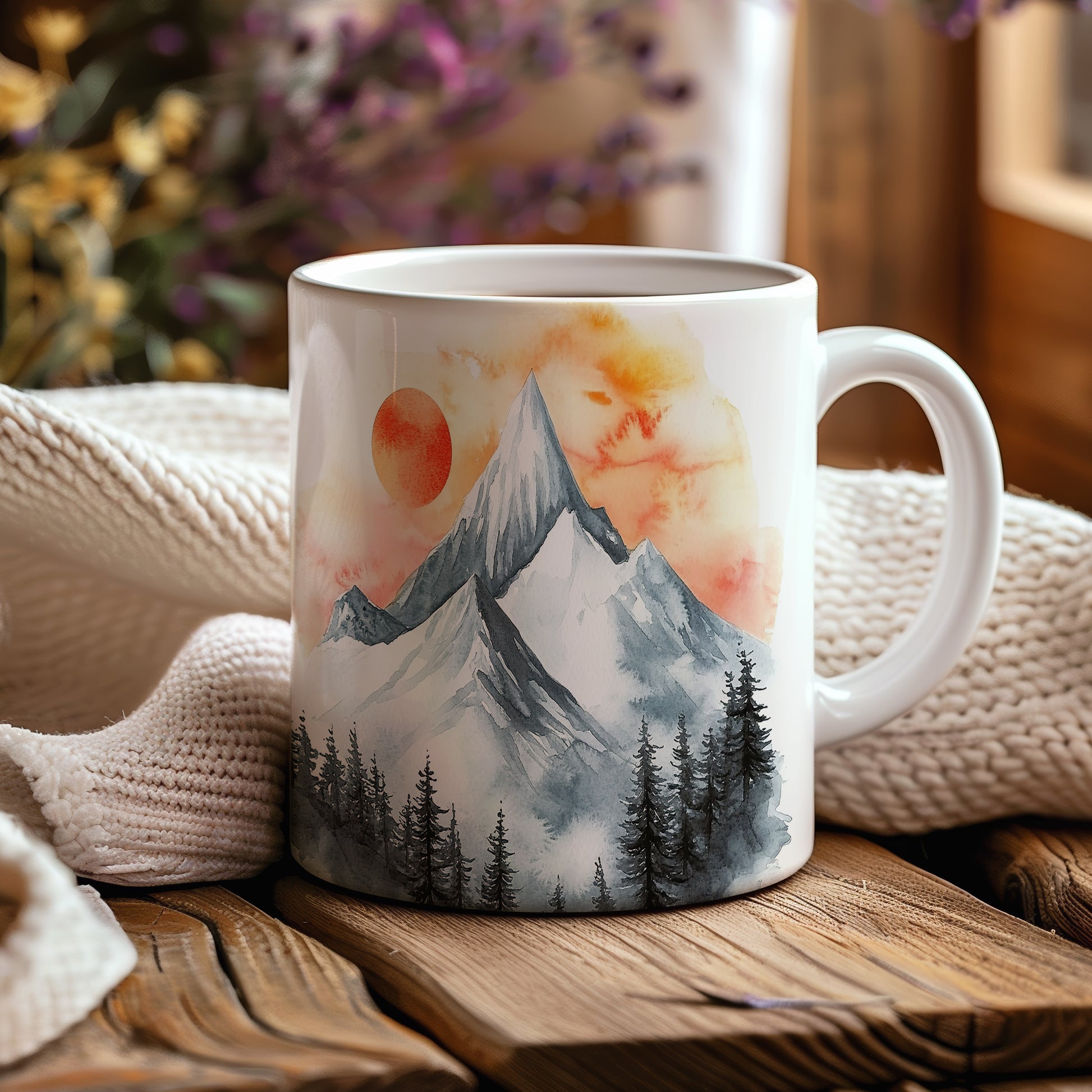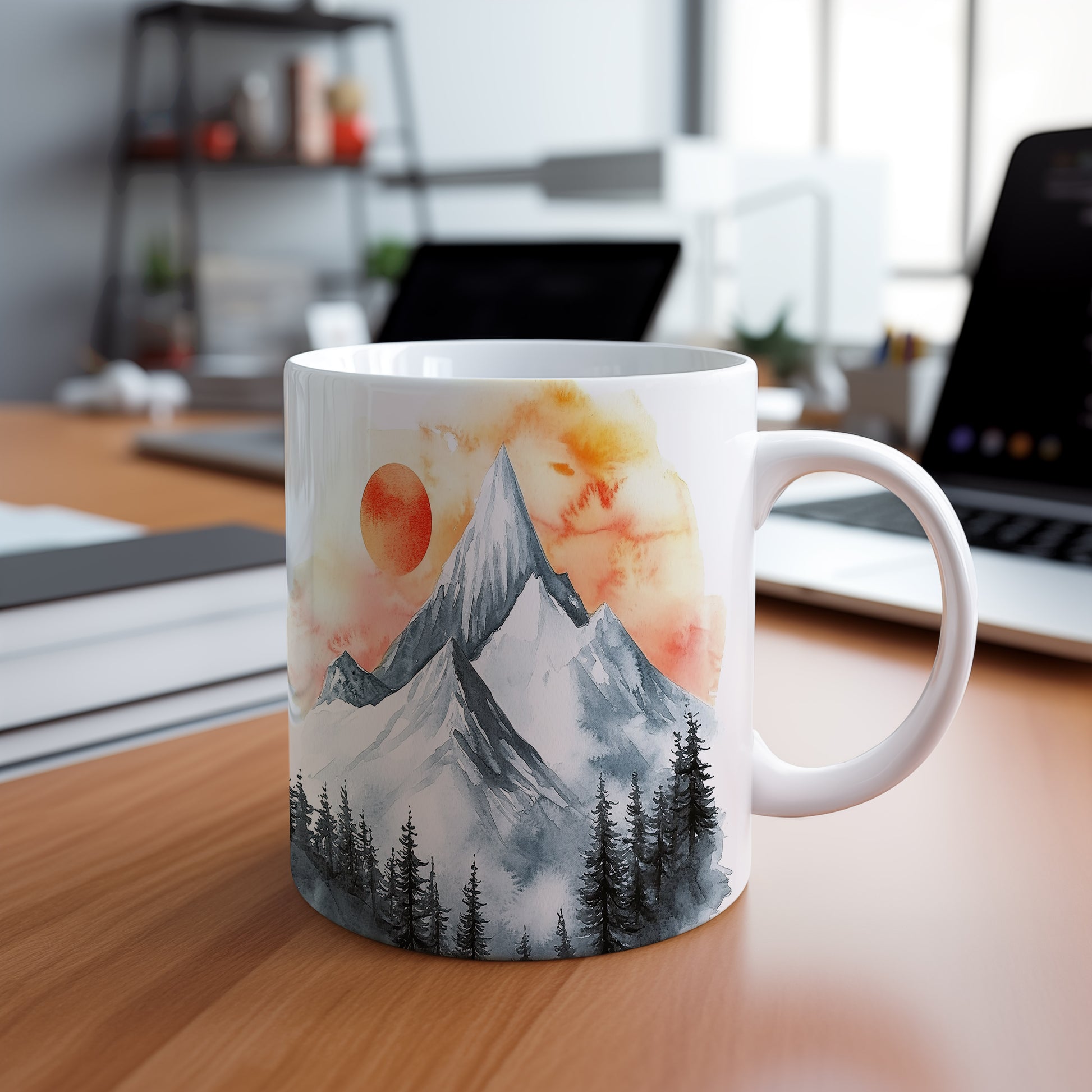 Hrnek s akvarelovými horami v oranžových a šedých tónech