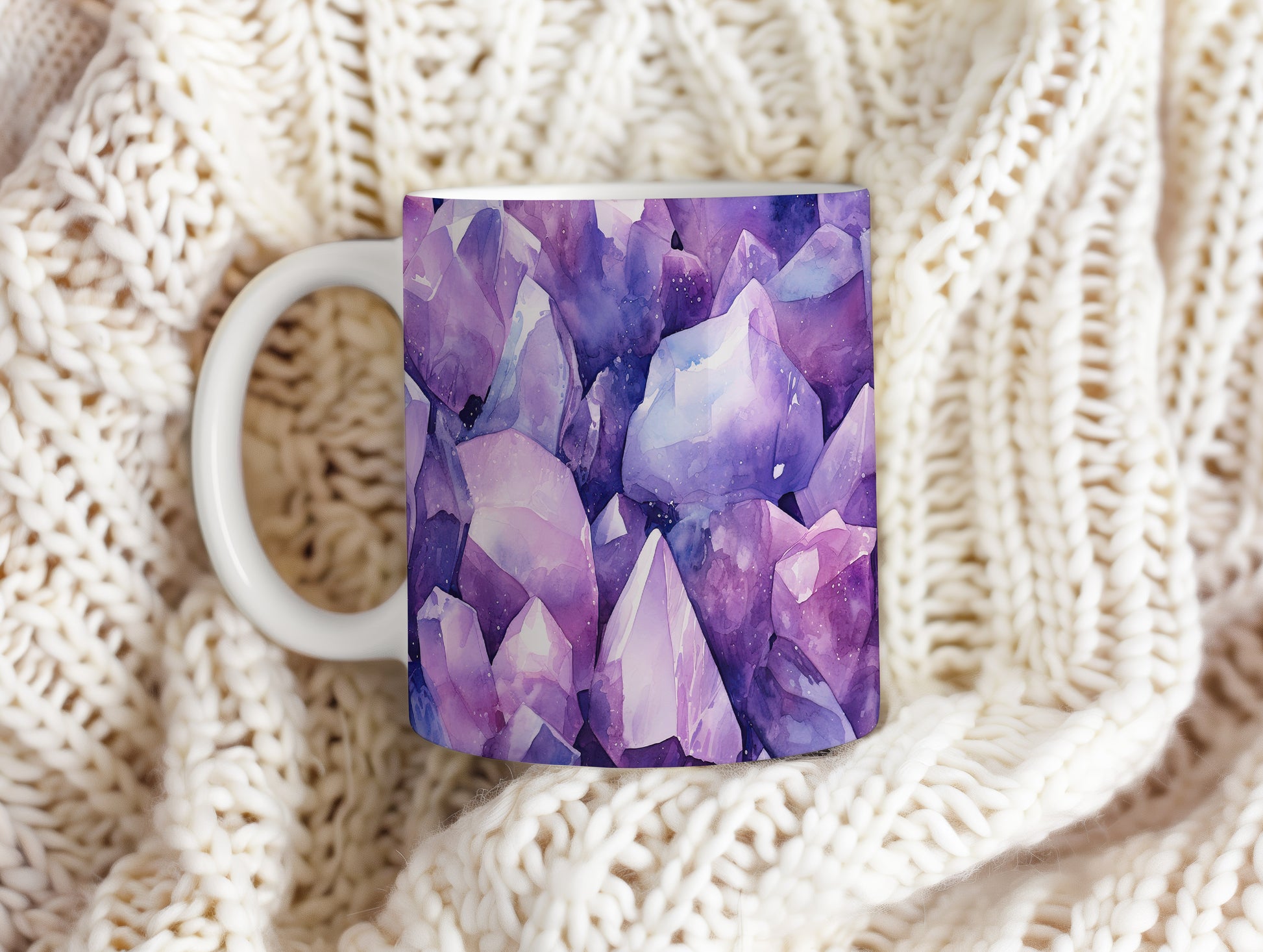 Hrnek s akvarelovými krystaly v fialových a modrých tónech