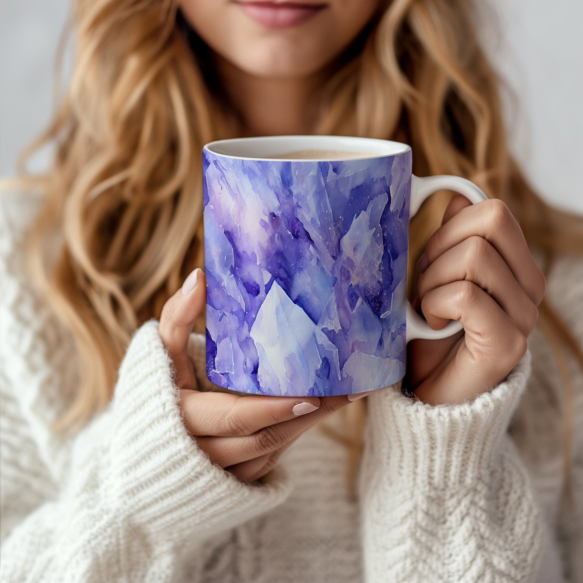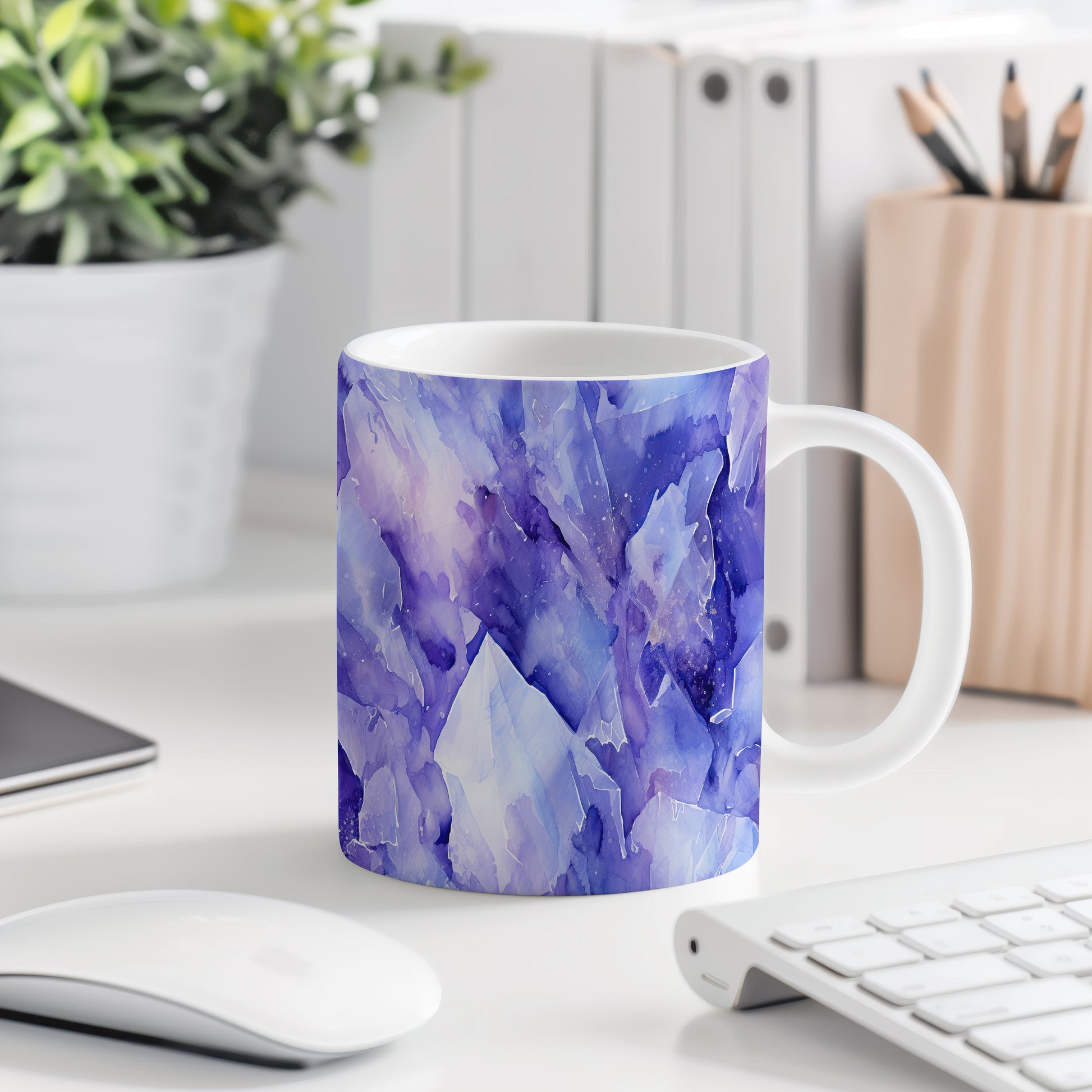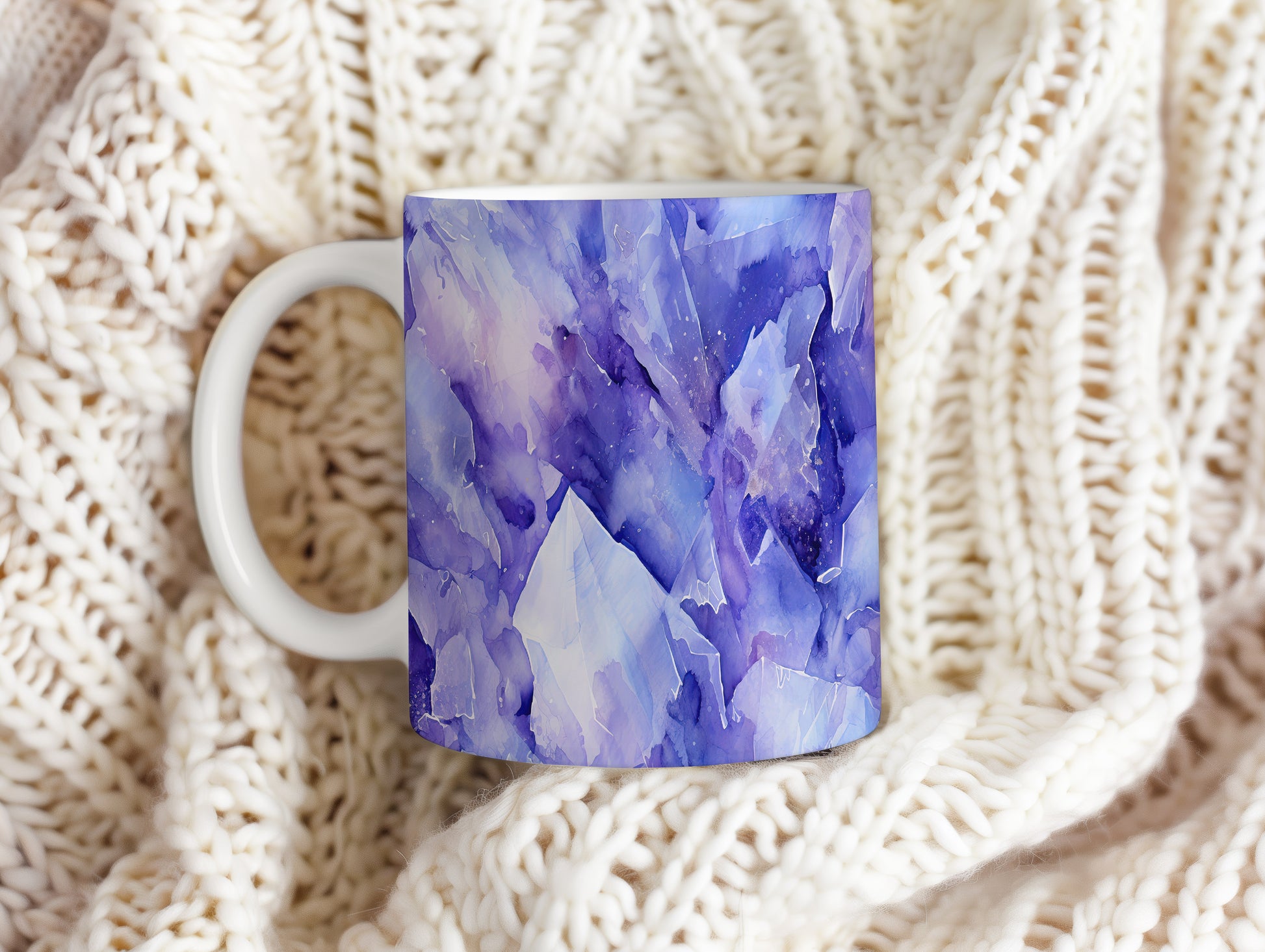 Hrnek s akvarelovými krystaly v modrých a fialových tónech