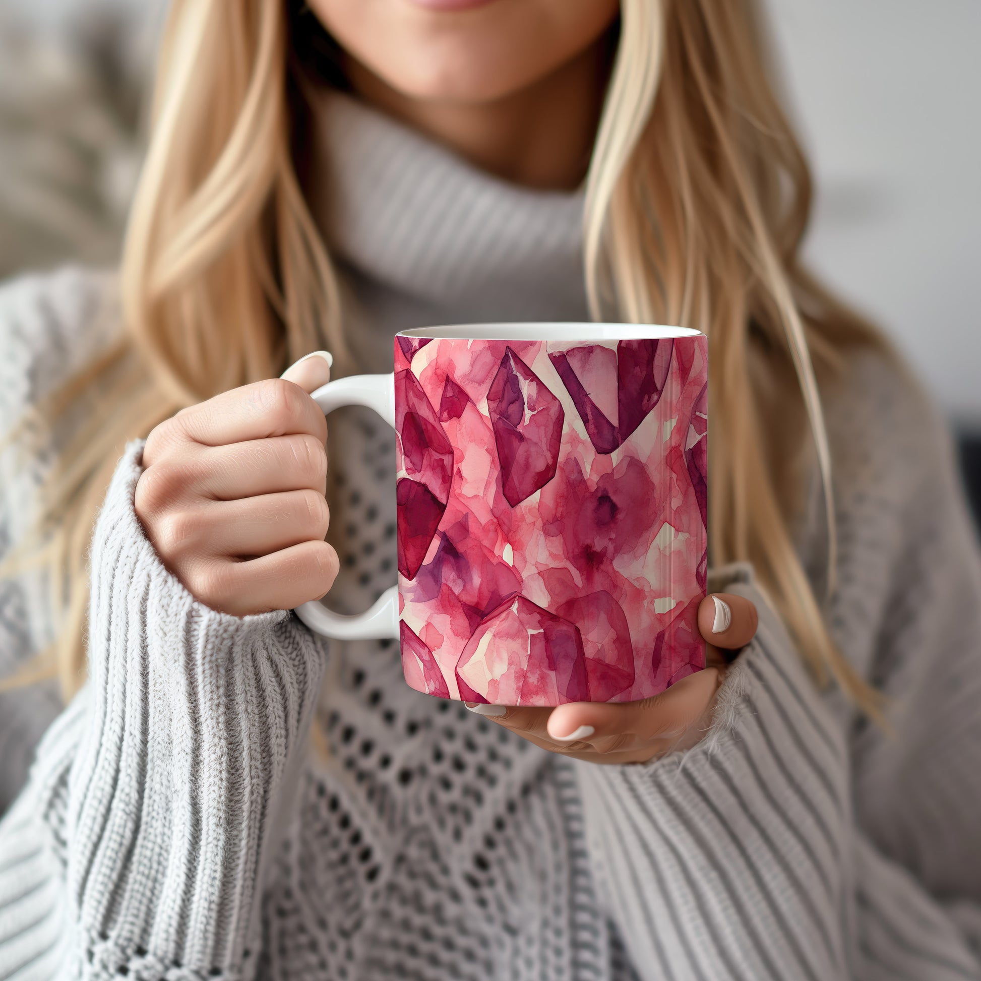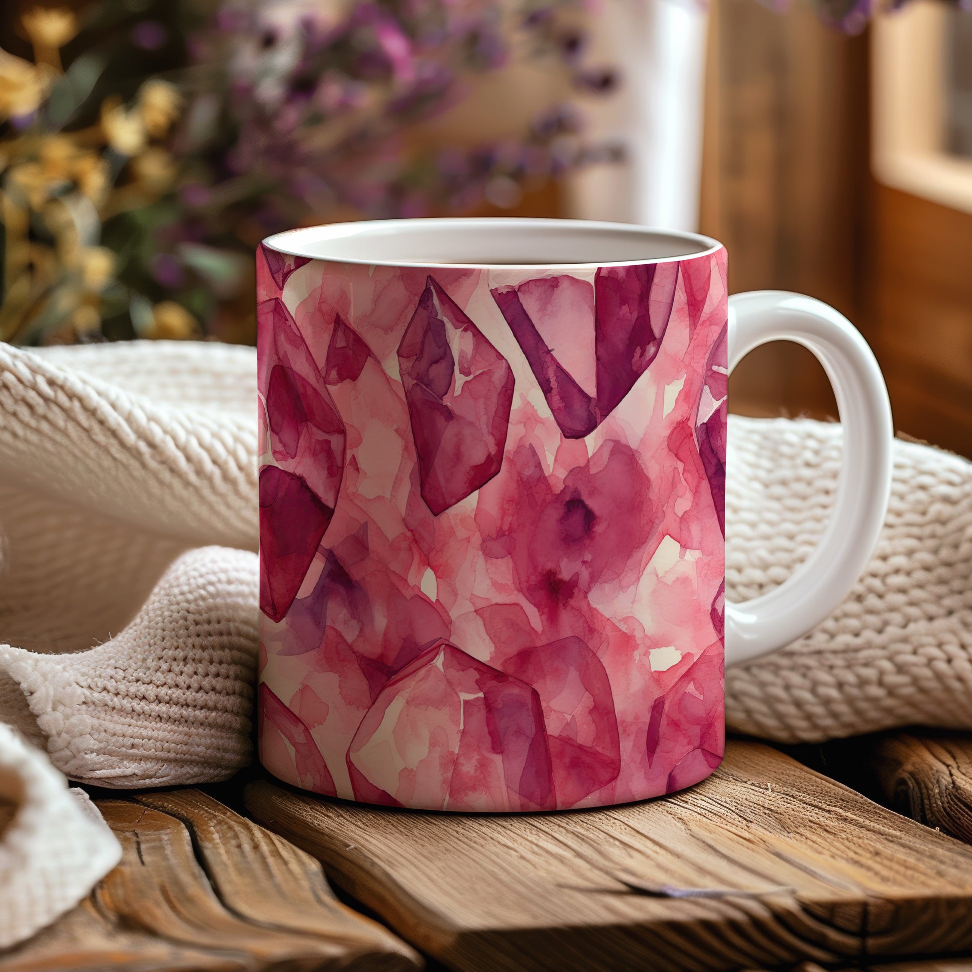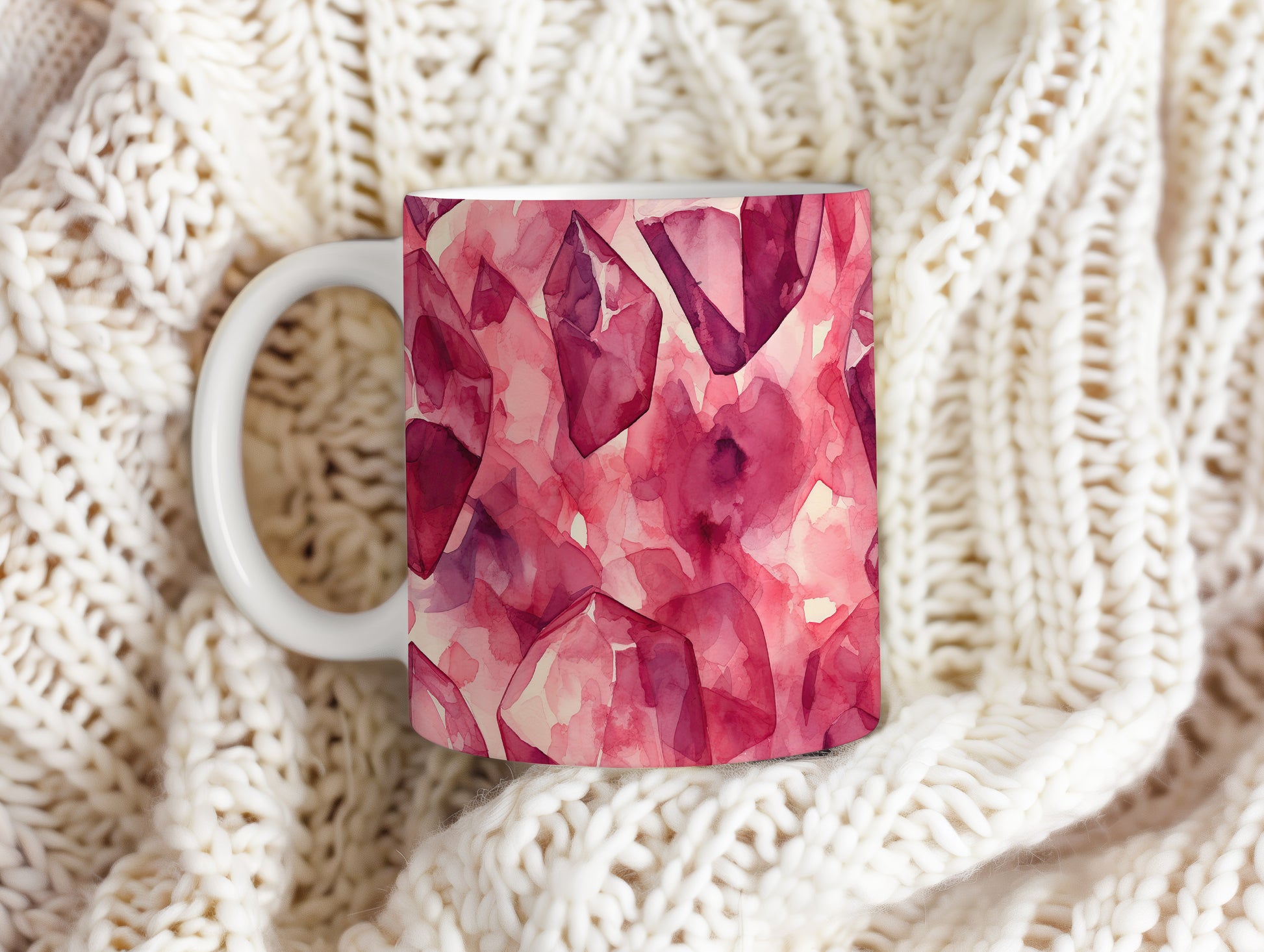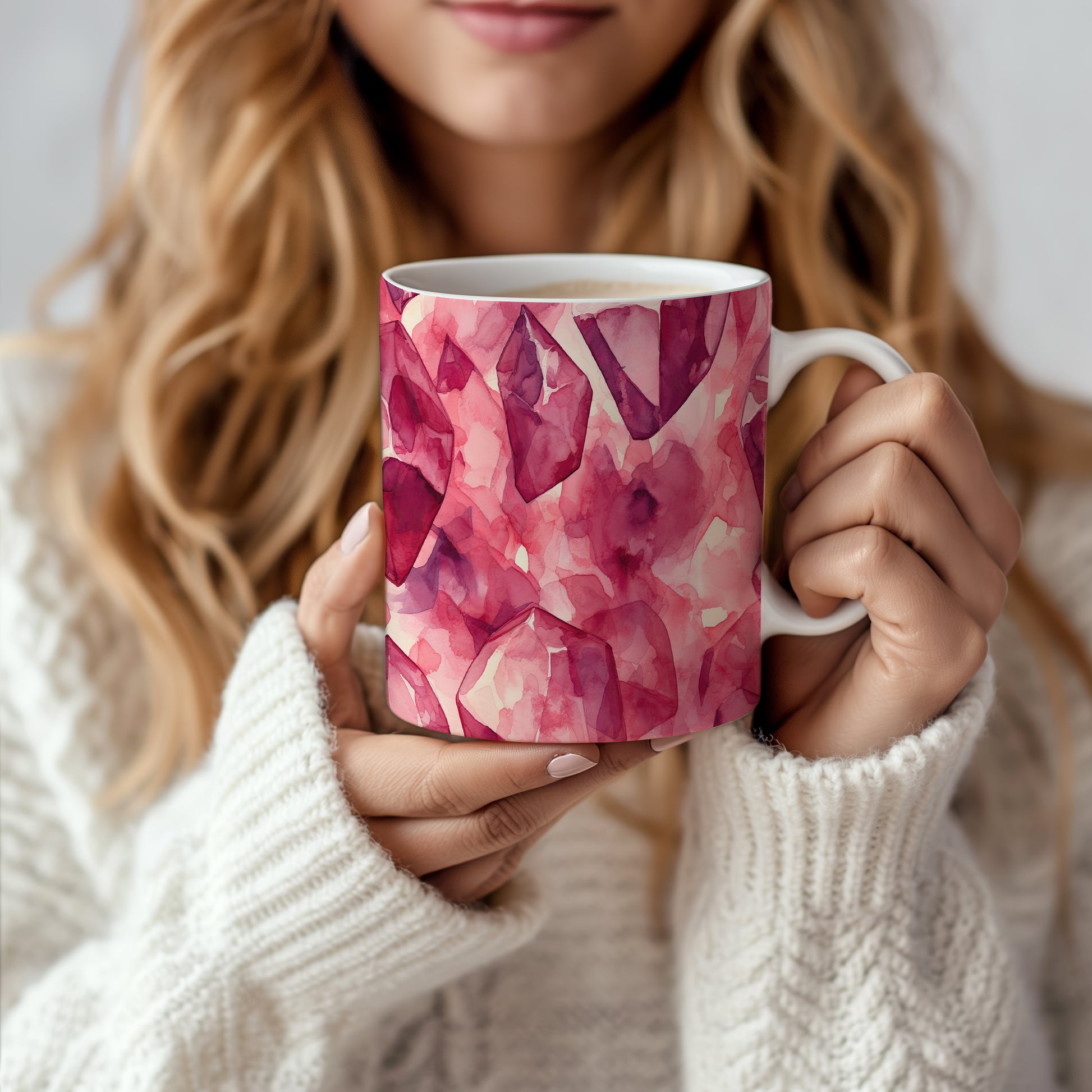 Hrnek s akvarelovými krystaly v růžových a červených tónech