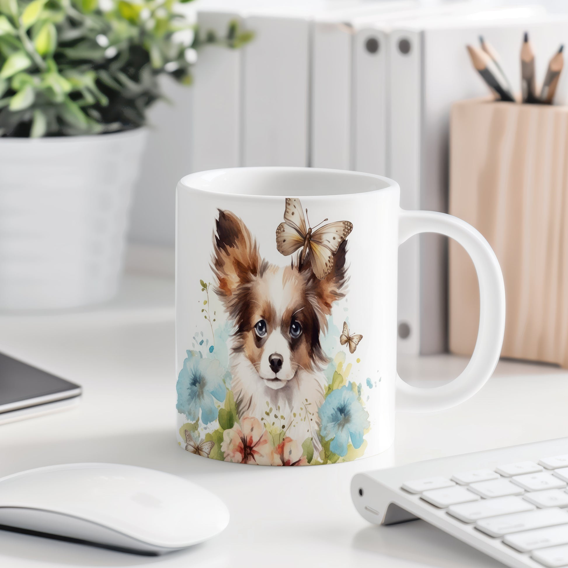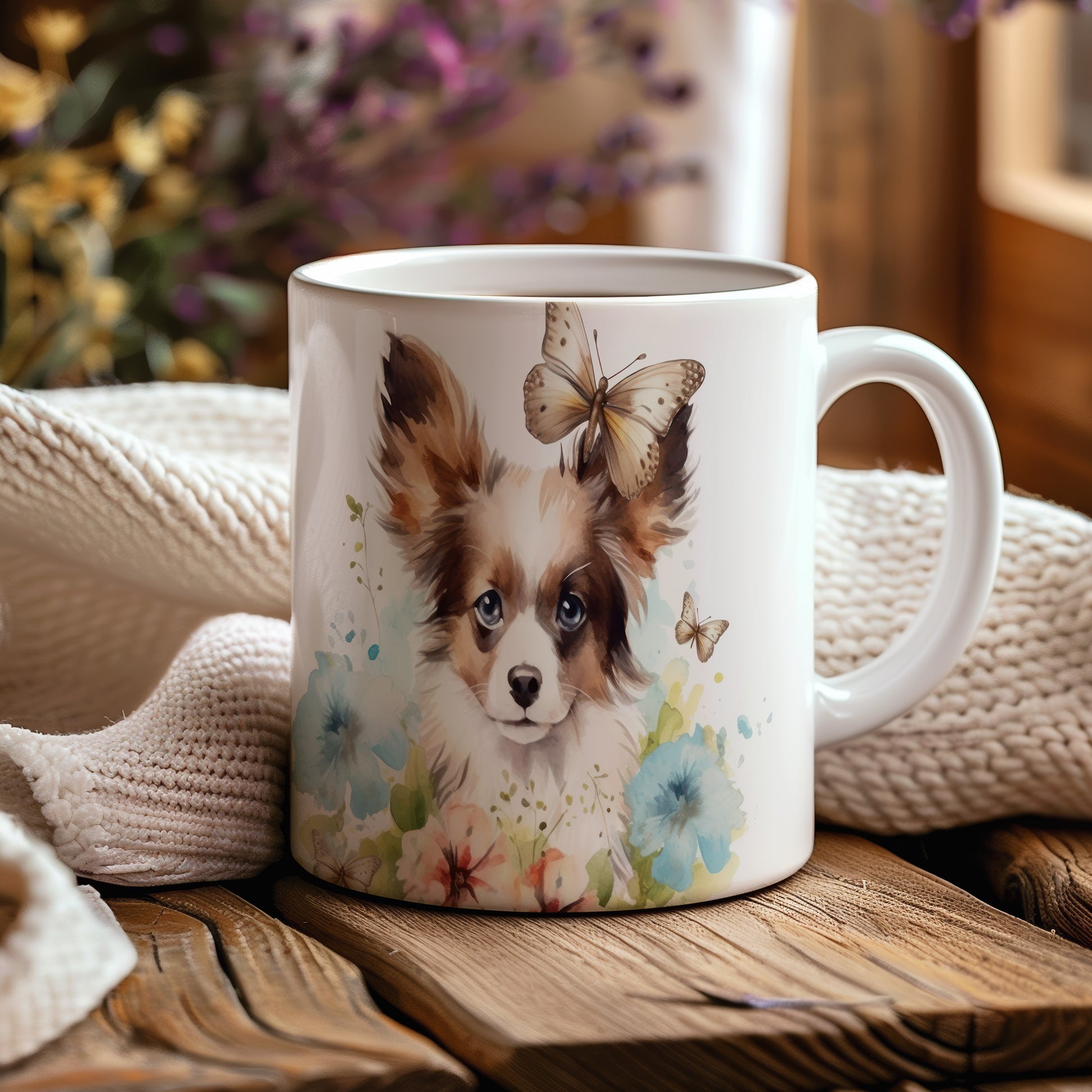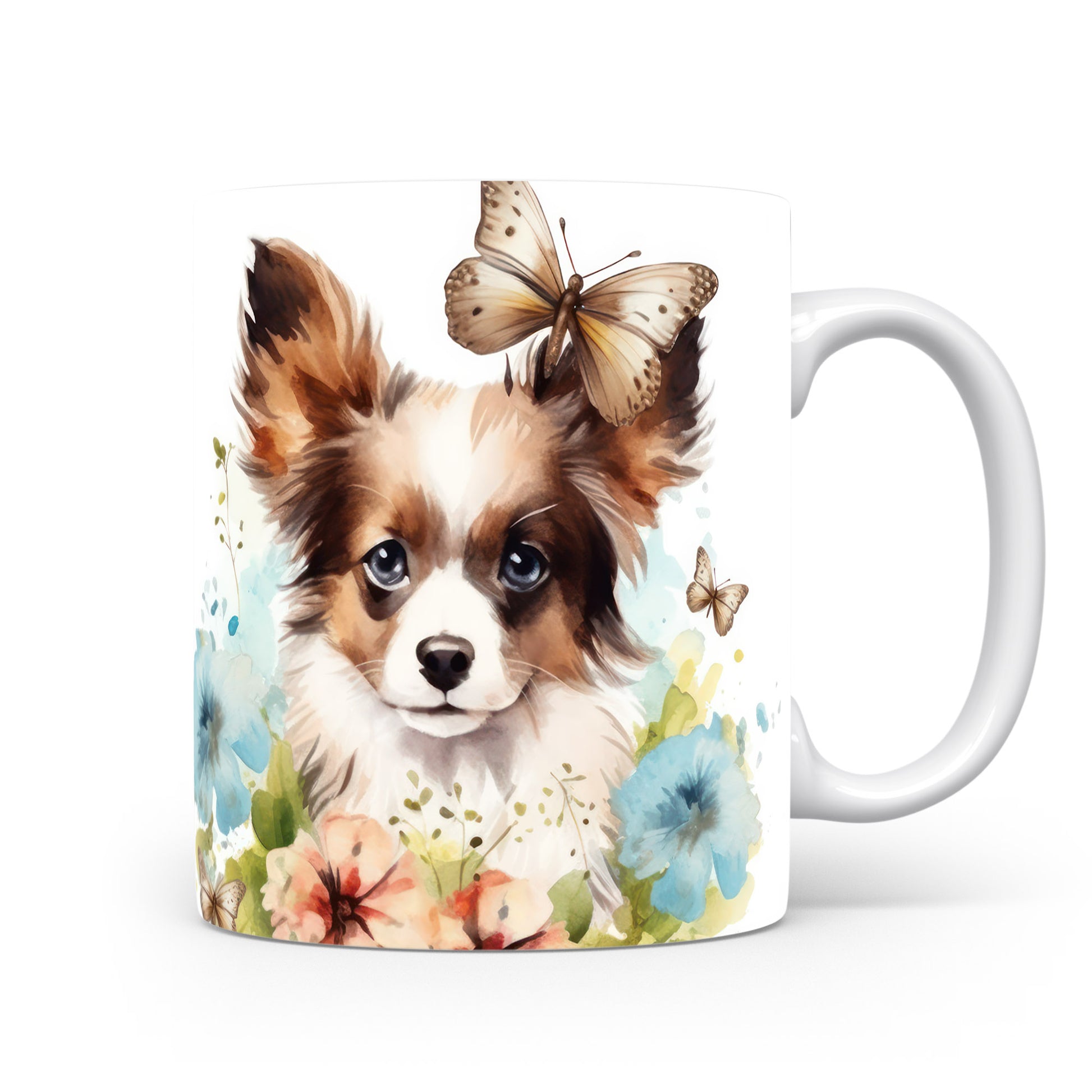 Tento hrnek s potiskem papillonu a barevných květin je ideální pro milovníky psů. Přidejte do svého dne špetku radosti a stylu s tímto jedinečným kouskem.