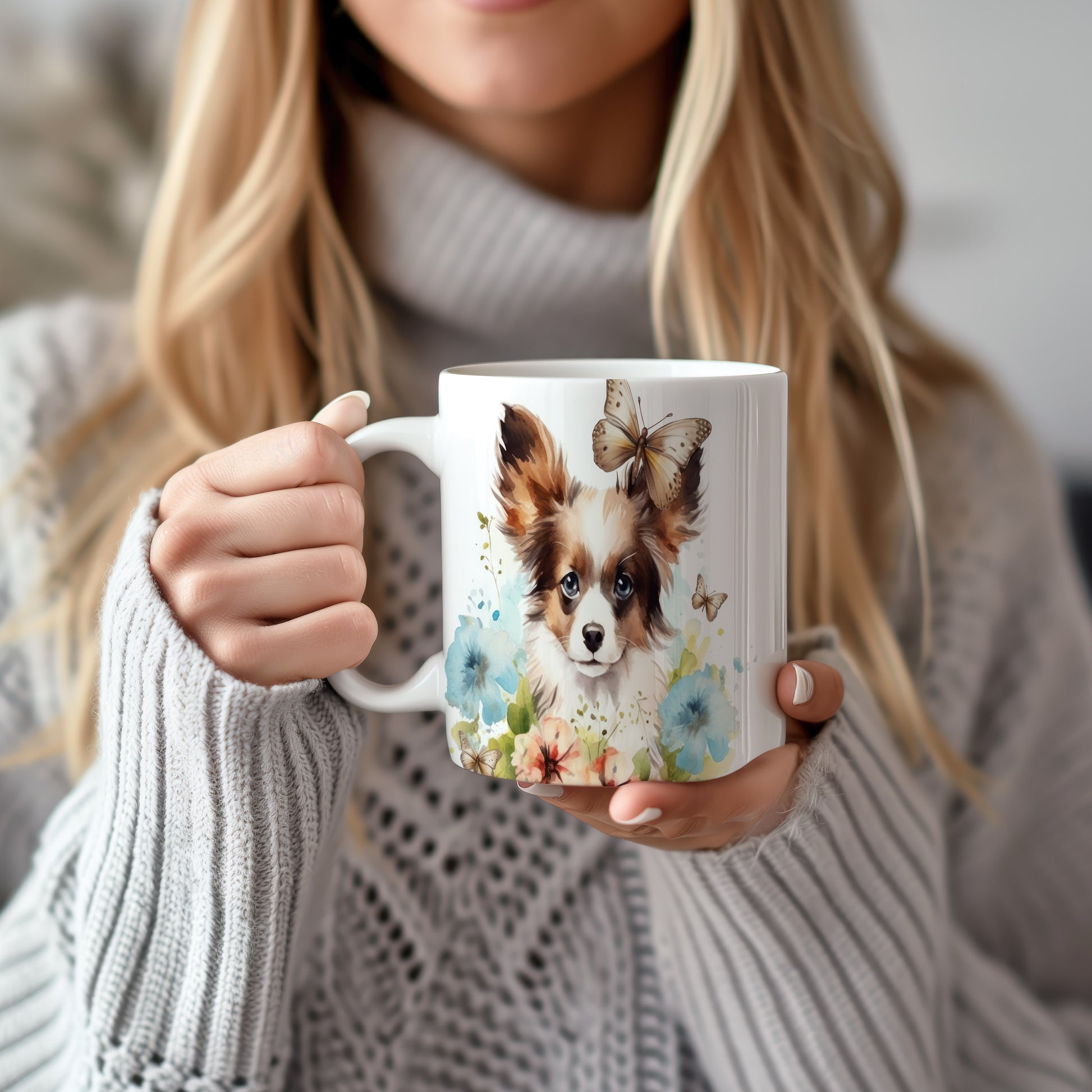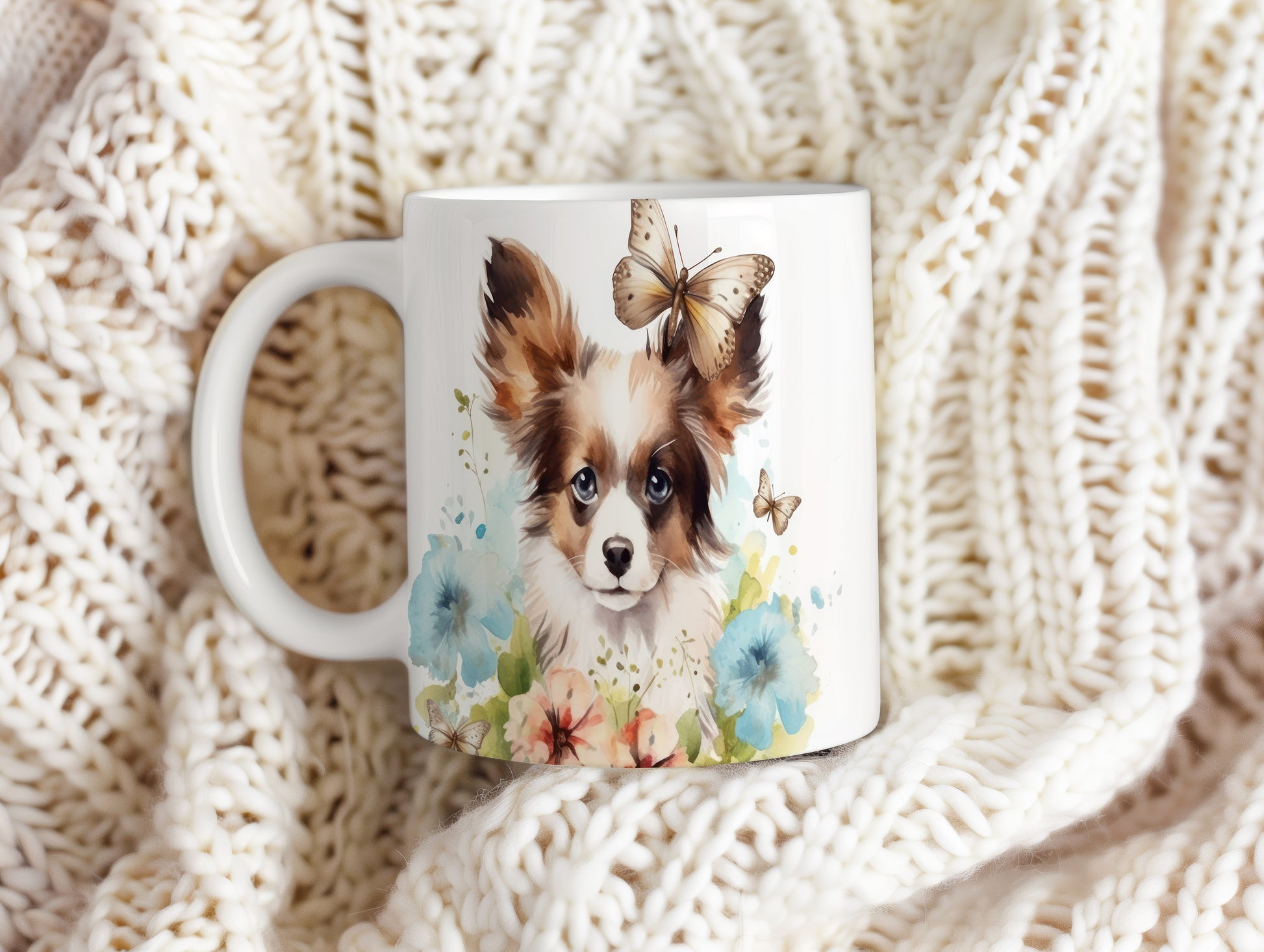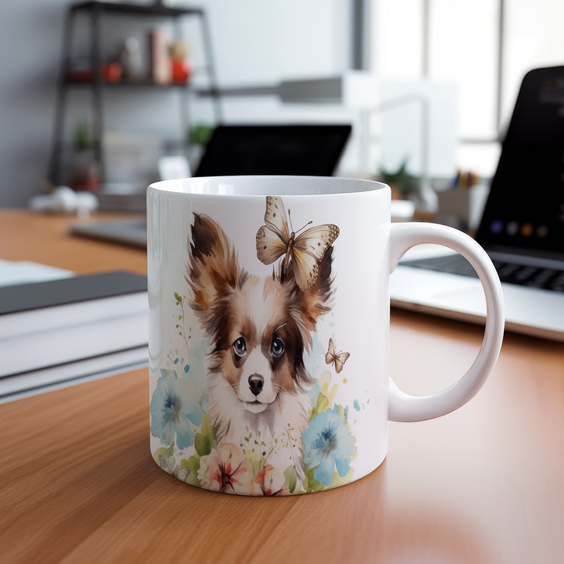 Tento hrnek s potiskem papillonu a barevných květin je ideální pro milovníky psů. Přidejte do svého dne špetku radosti a stylu s tímto jedinečným kouskem.