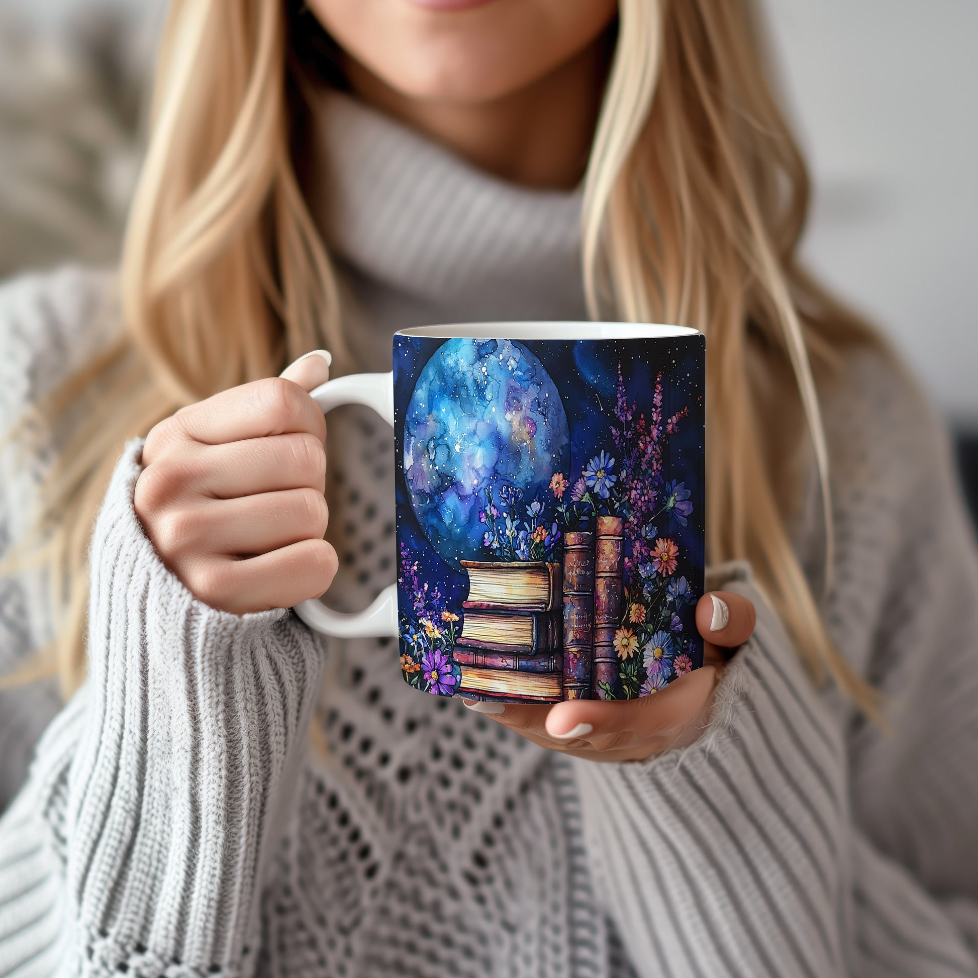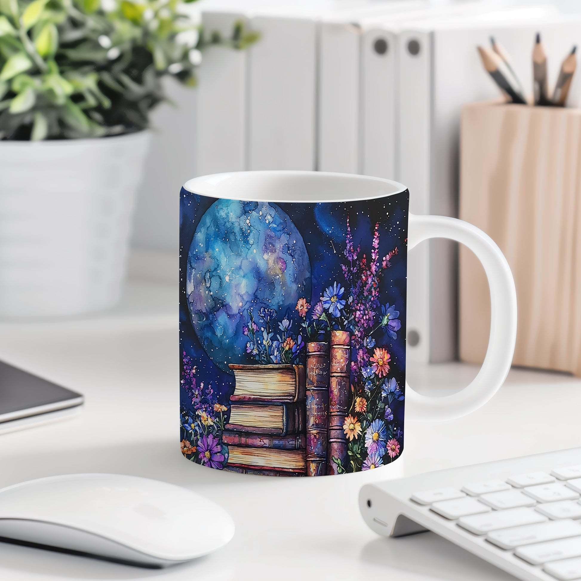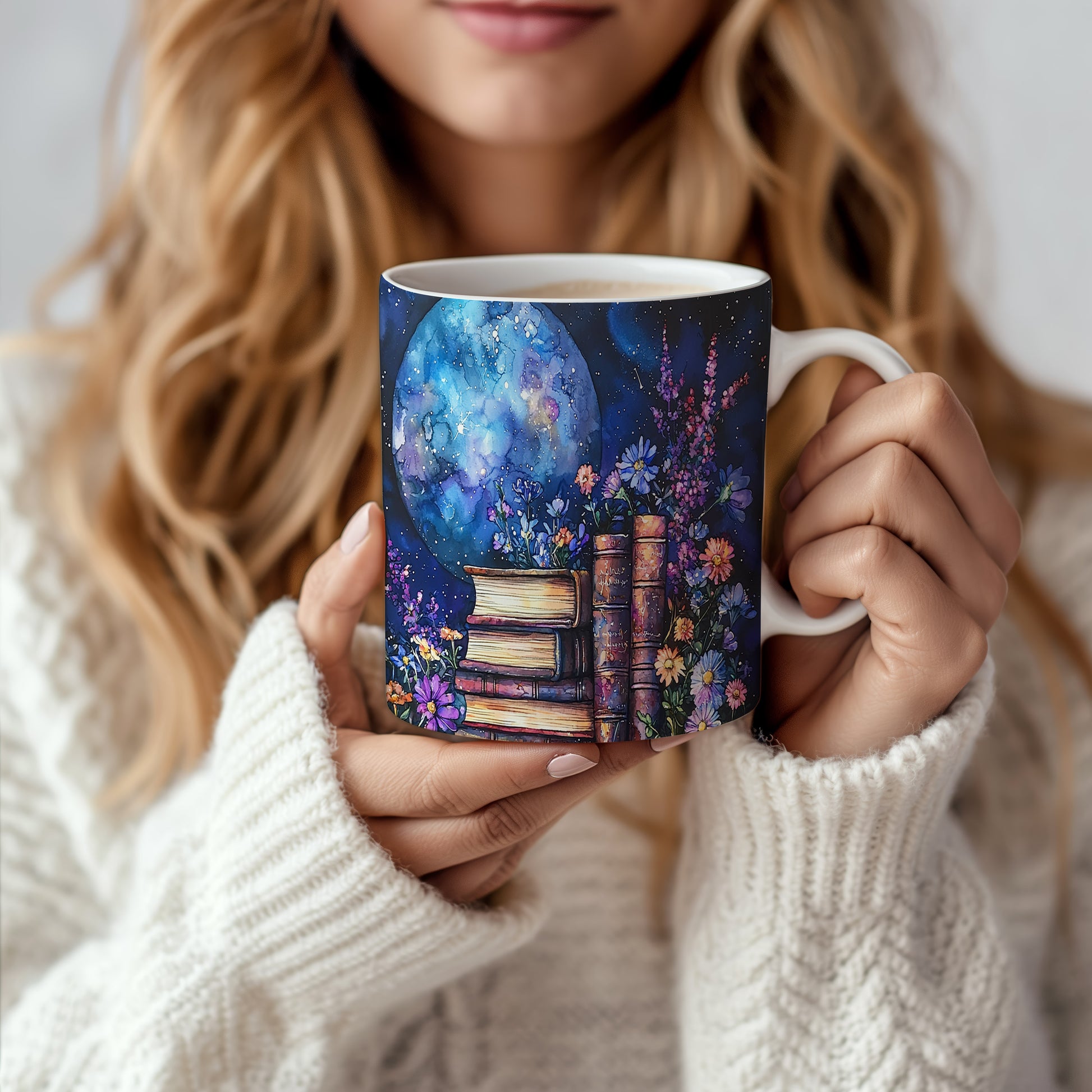 Tento hrnek nabízí jedinečný design s motivem knih a květin na pozadí noční oblohy. Ideální pro milovníky knih a umění, přináší do každého dne kousek magie.