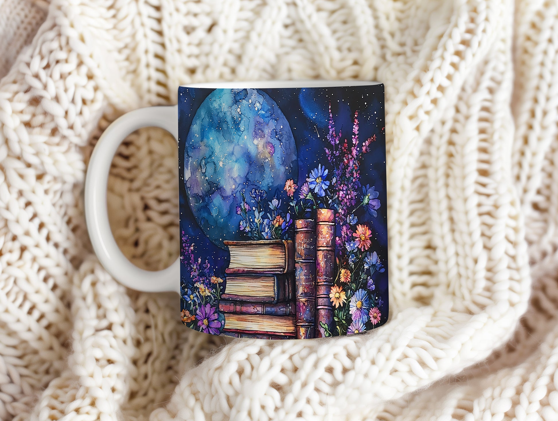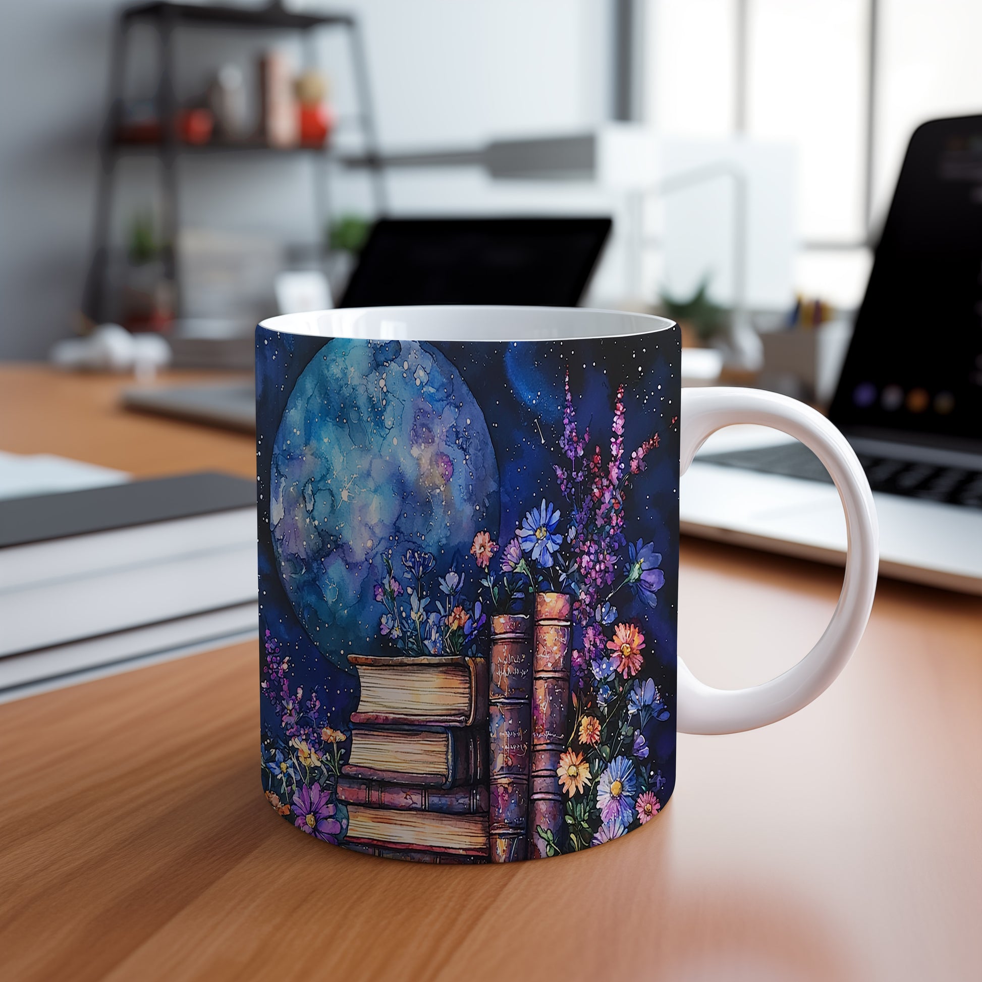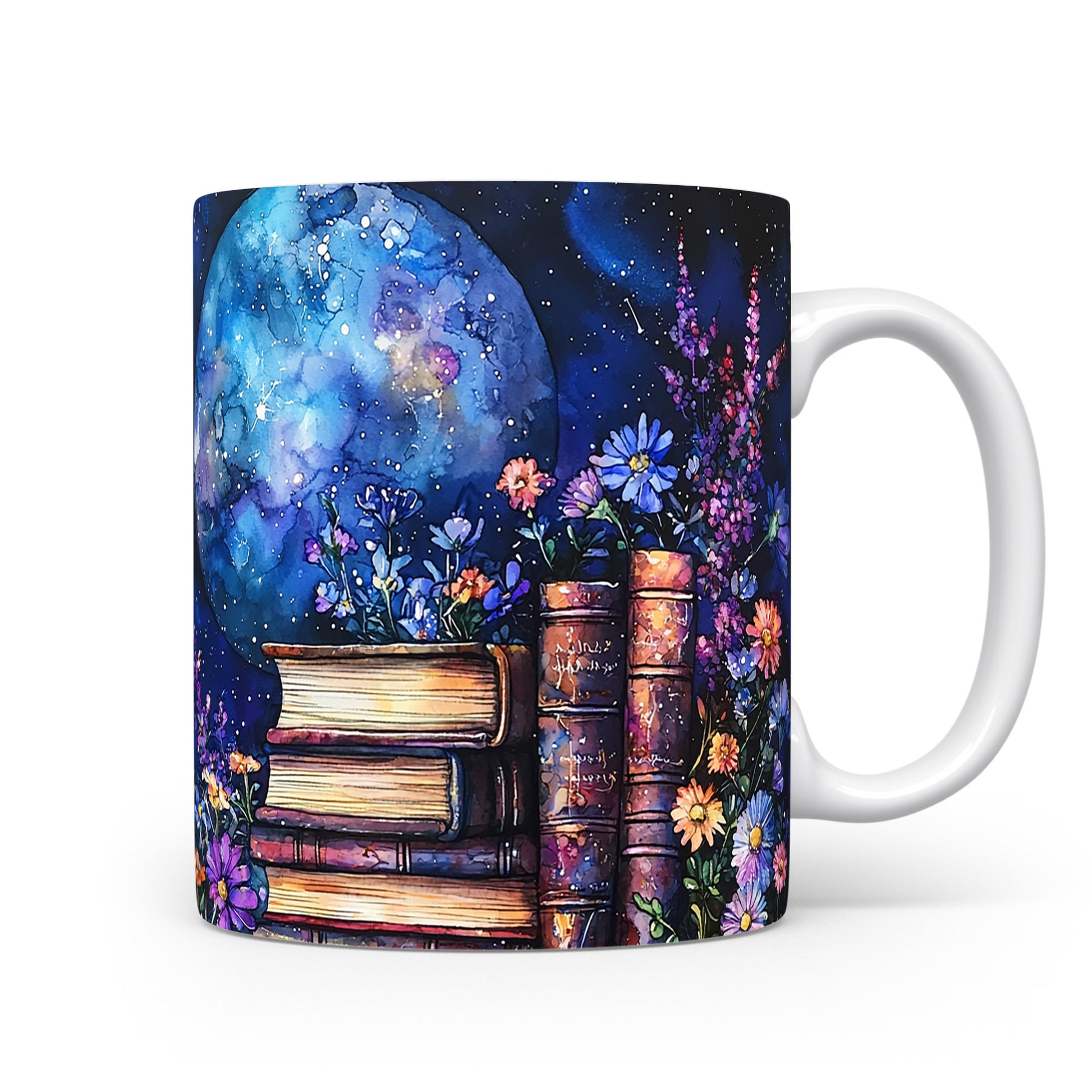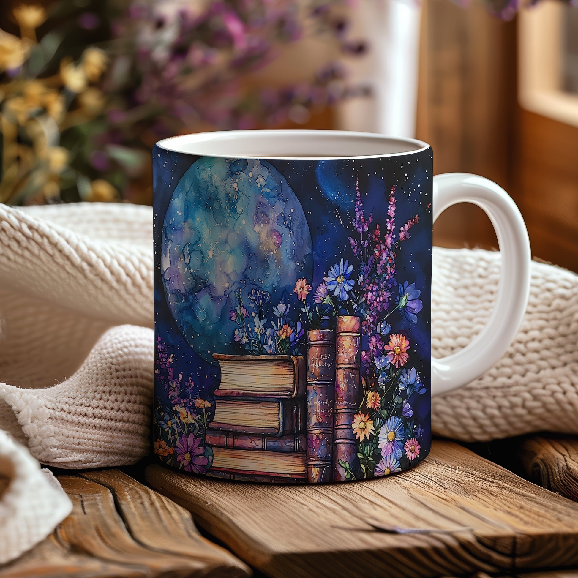 Tento hrnek nabízí jedinečný design s motivem knih a květin na pozadí noční oblohy. Ideální pro milovníky knih a umění, přináší do každého dne kousek magie.