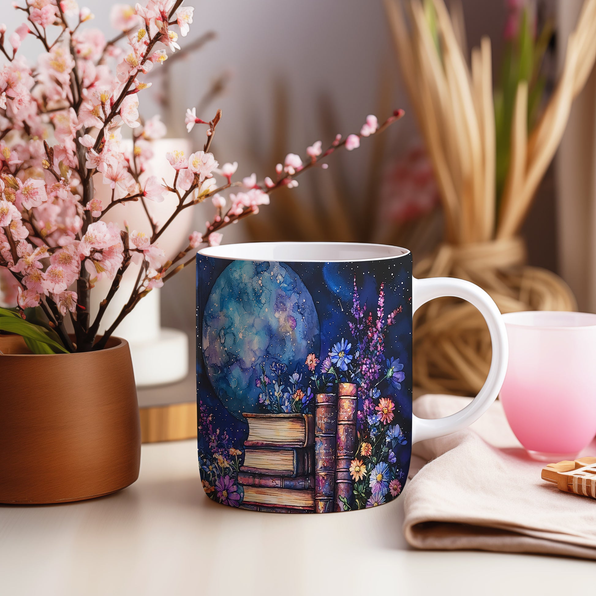 Kreativní hrnek s knihami a květinami pod hvězdami